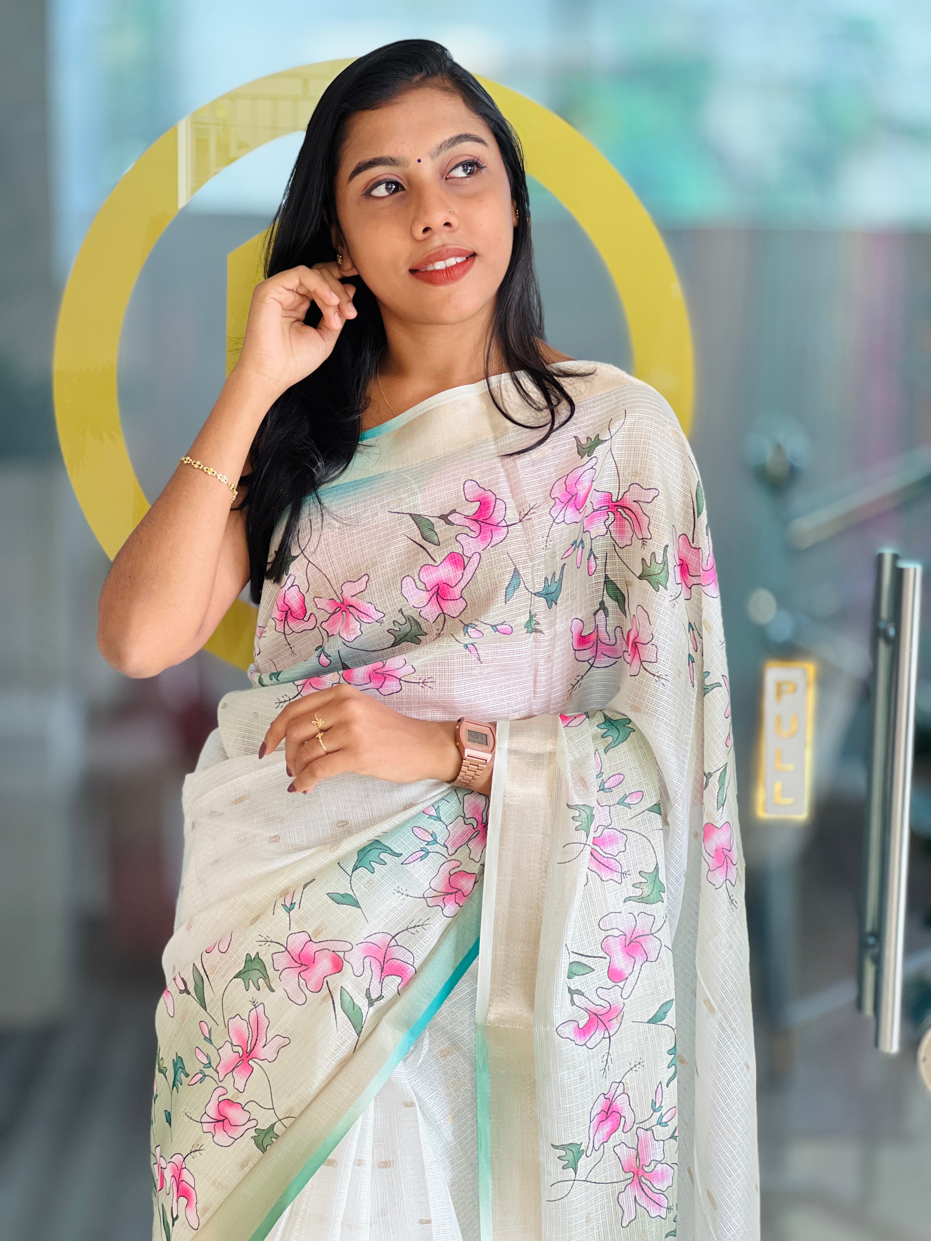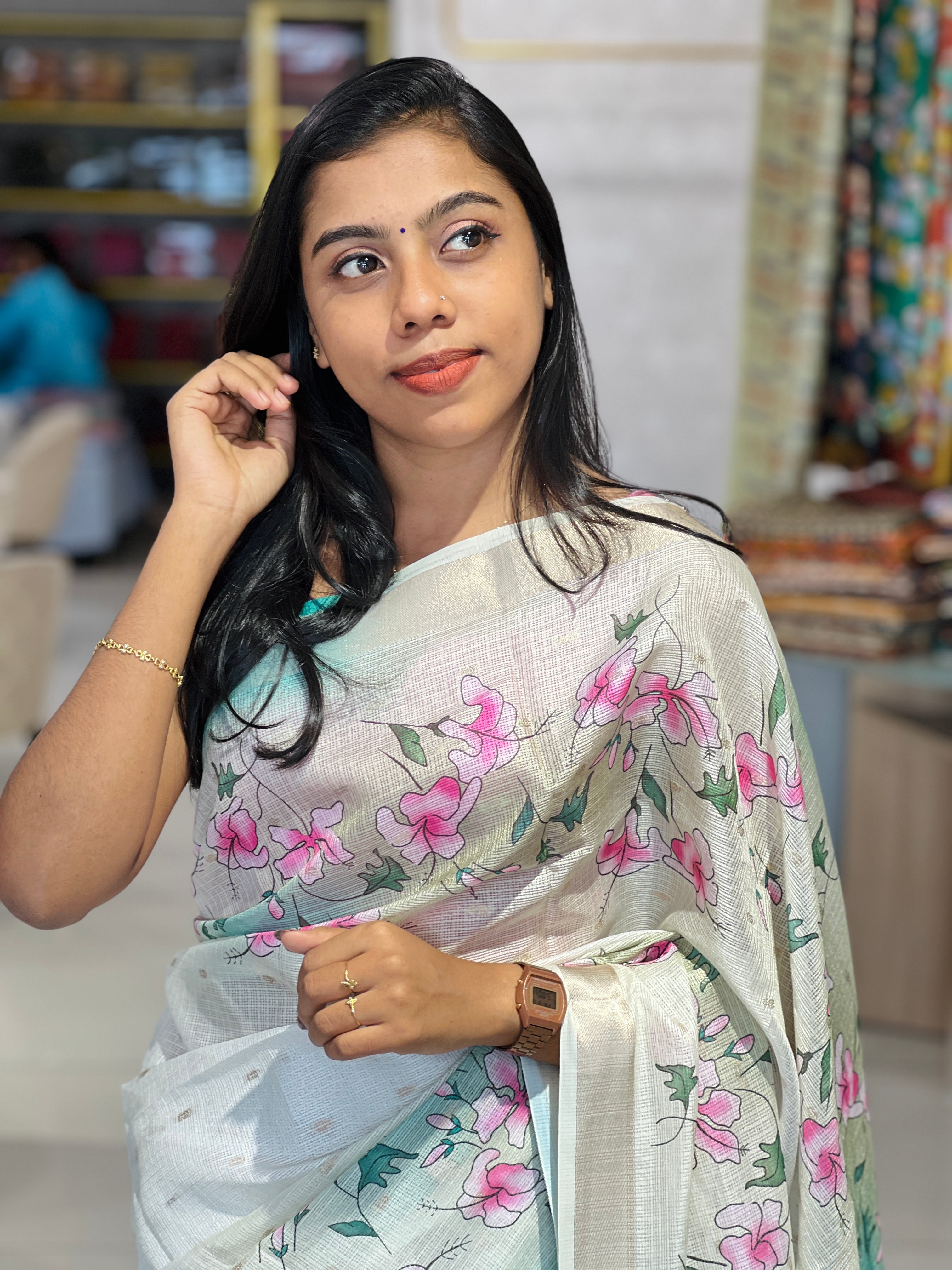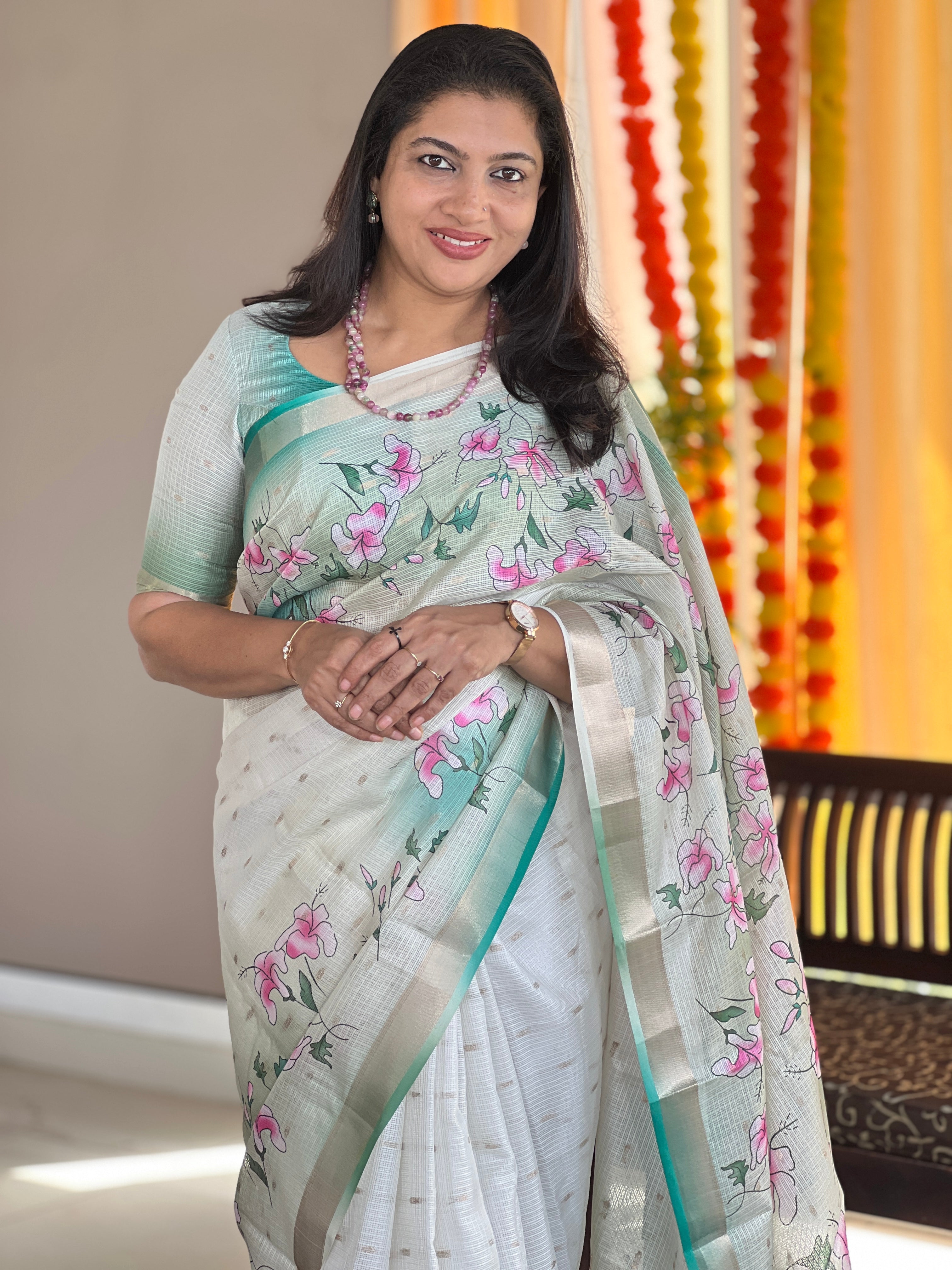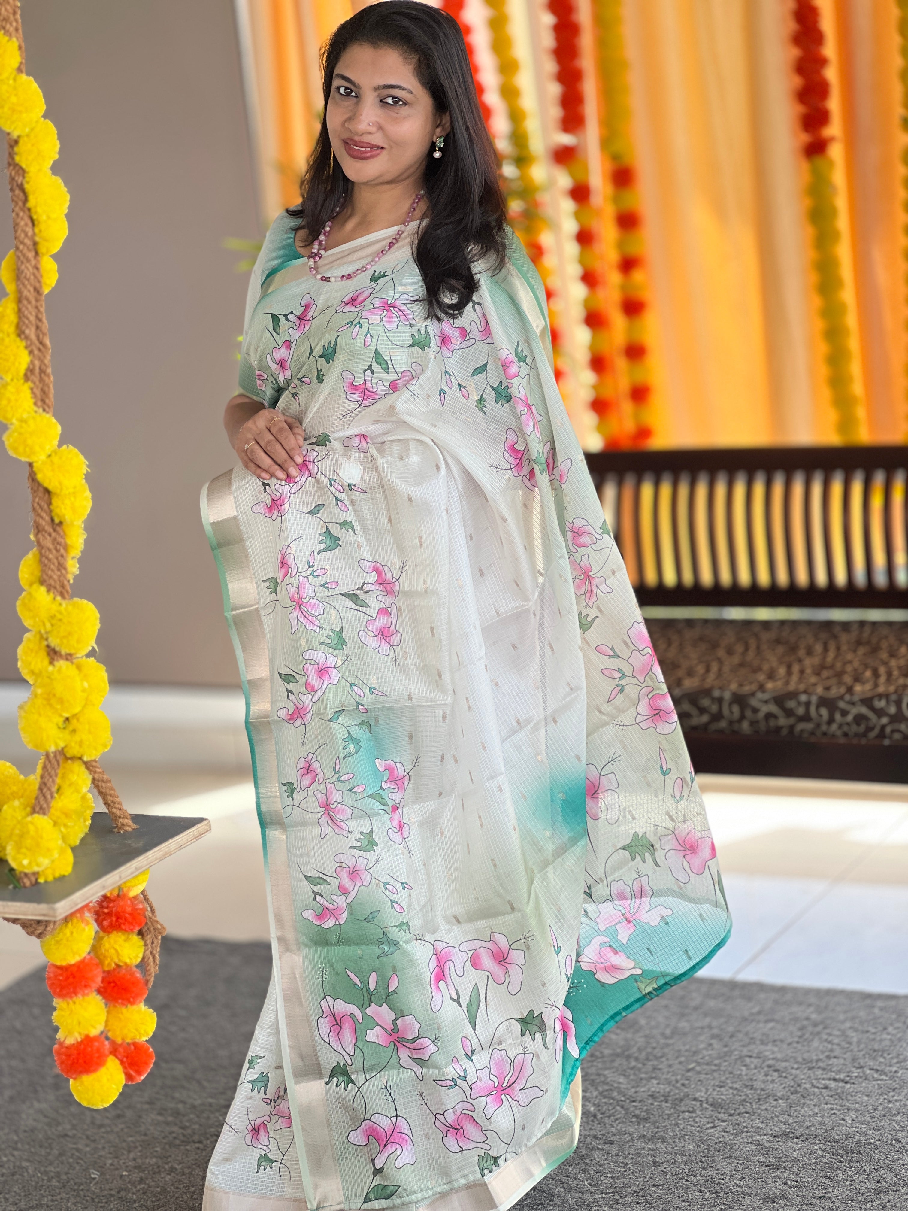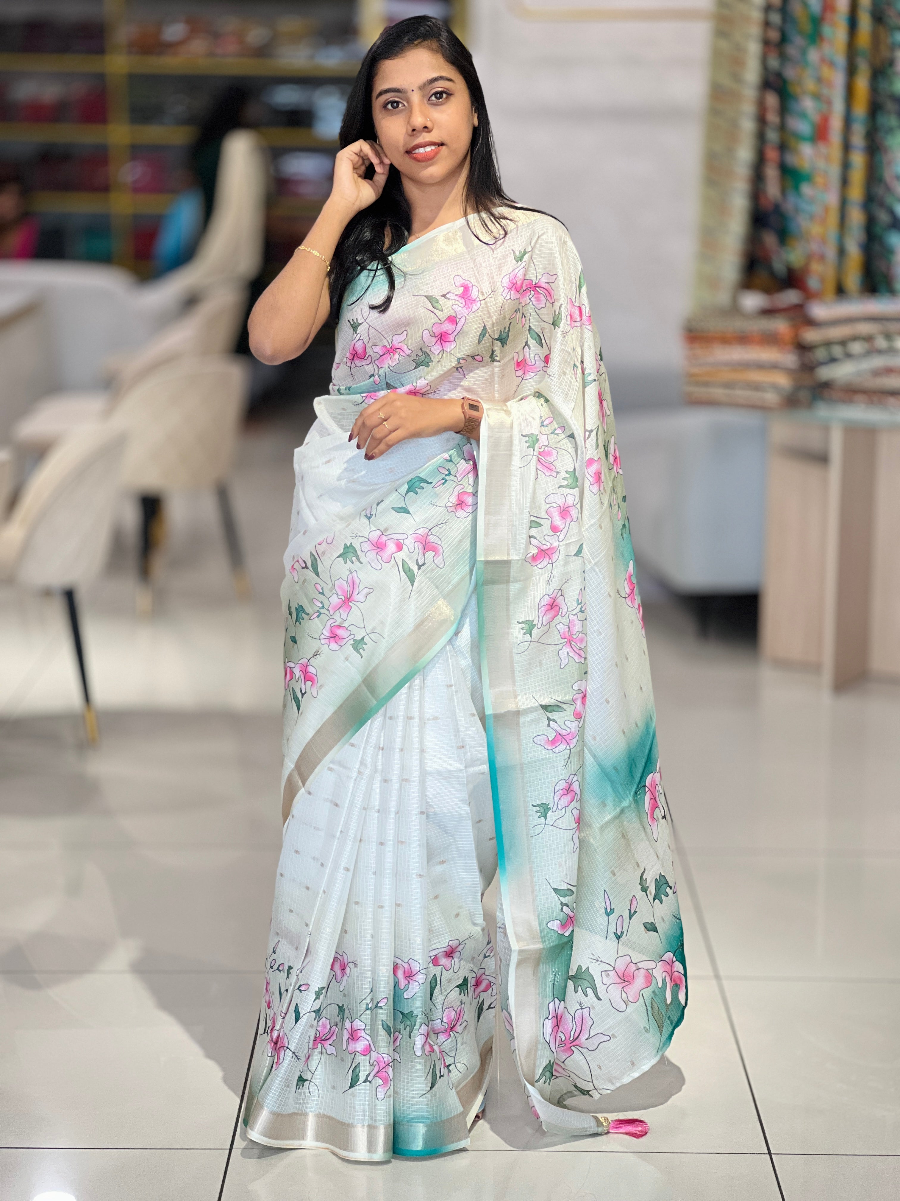 - Style: Floral Digital Printed, Zari Border Detailing , Jhumka Tassels Attached, Scattered Butta Weaving Pattern