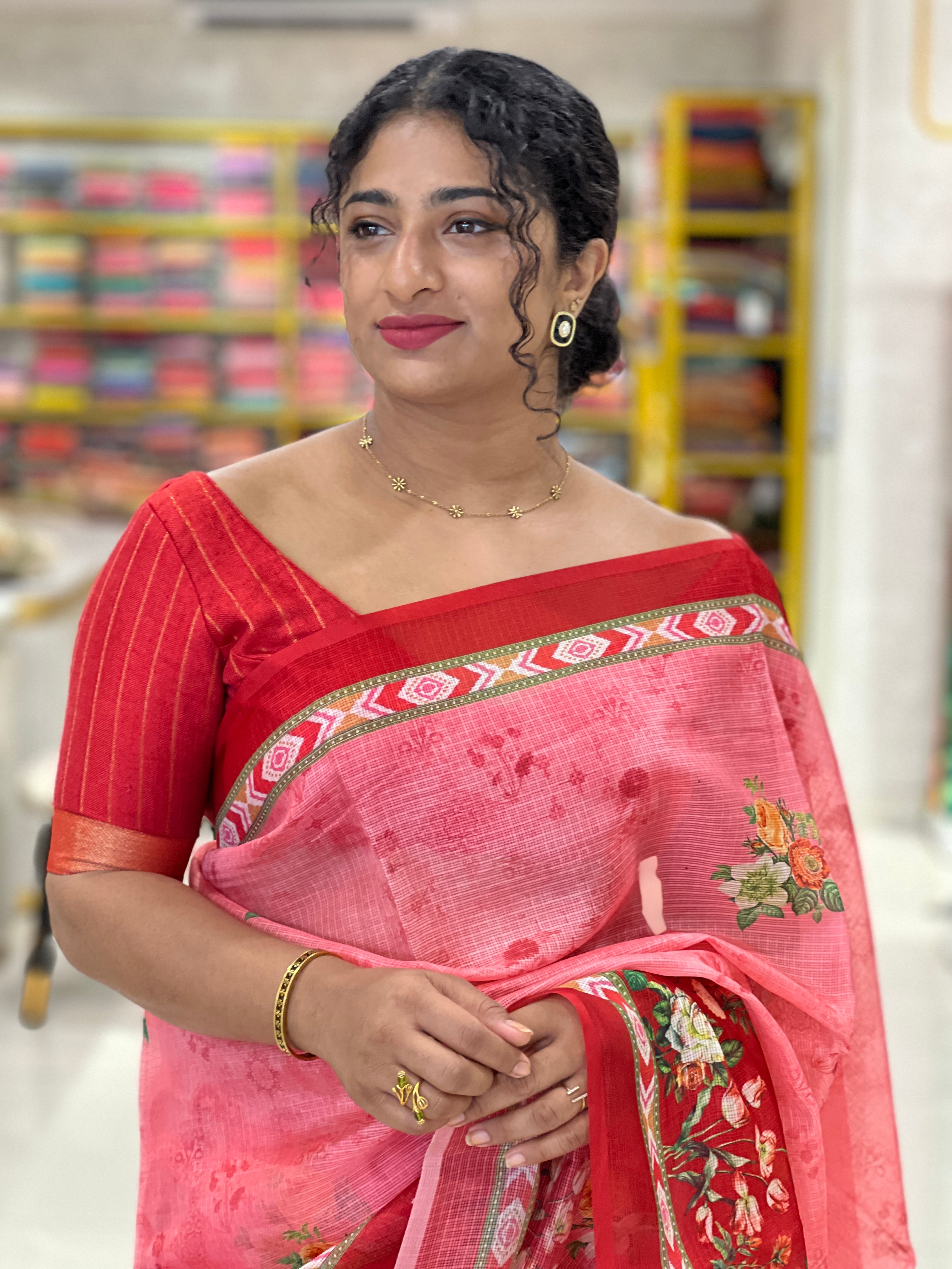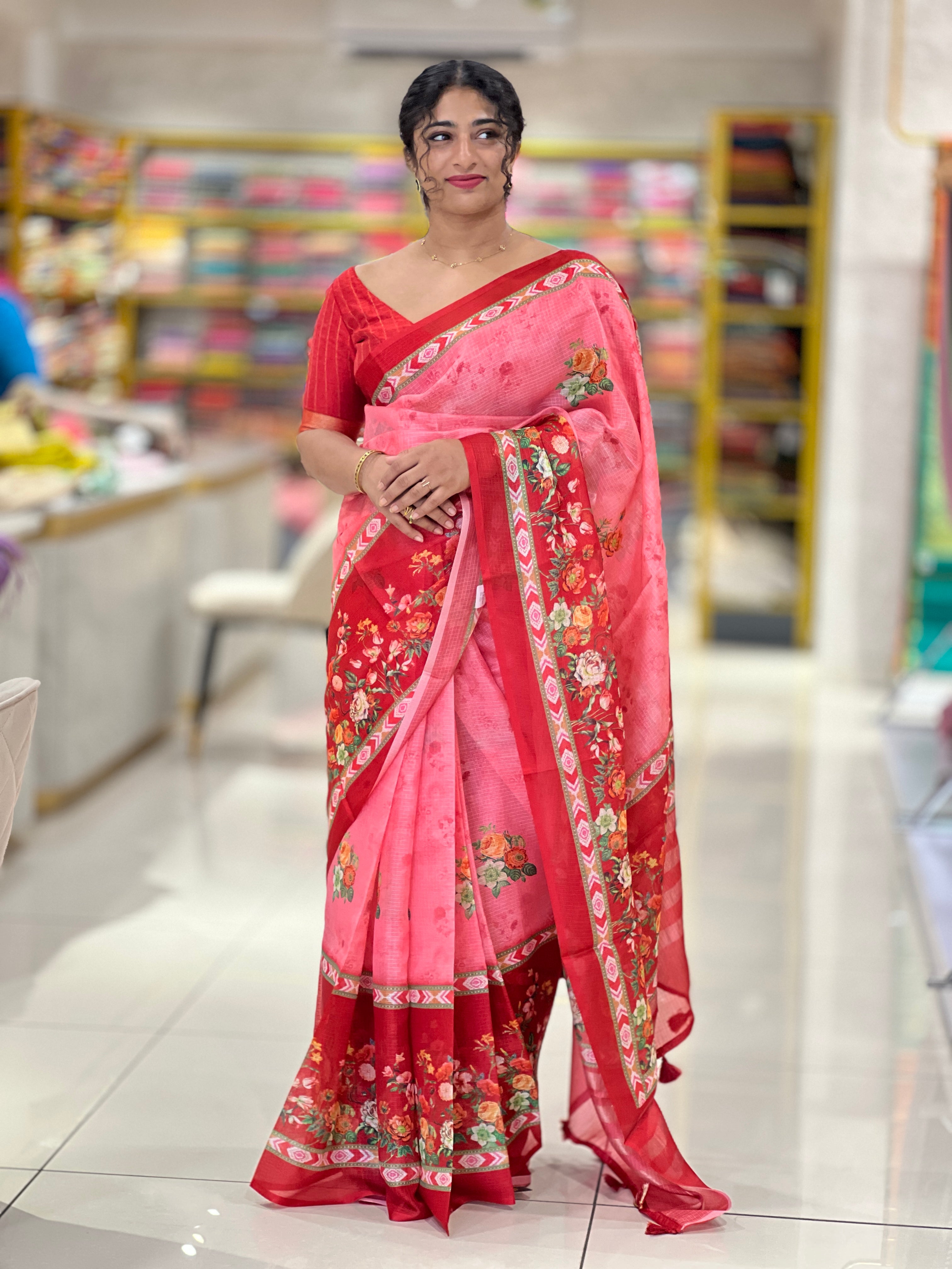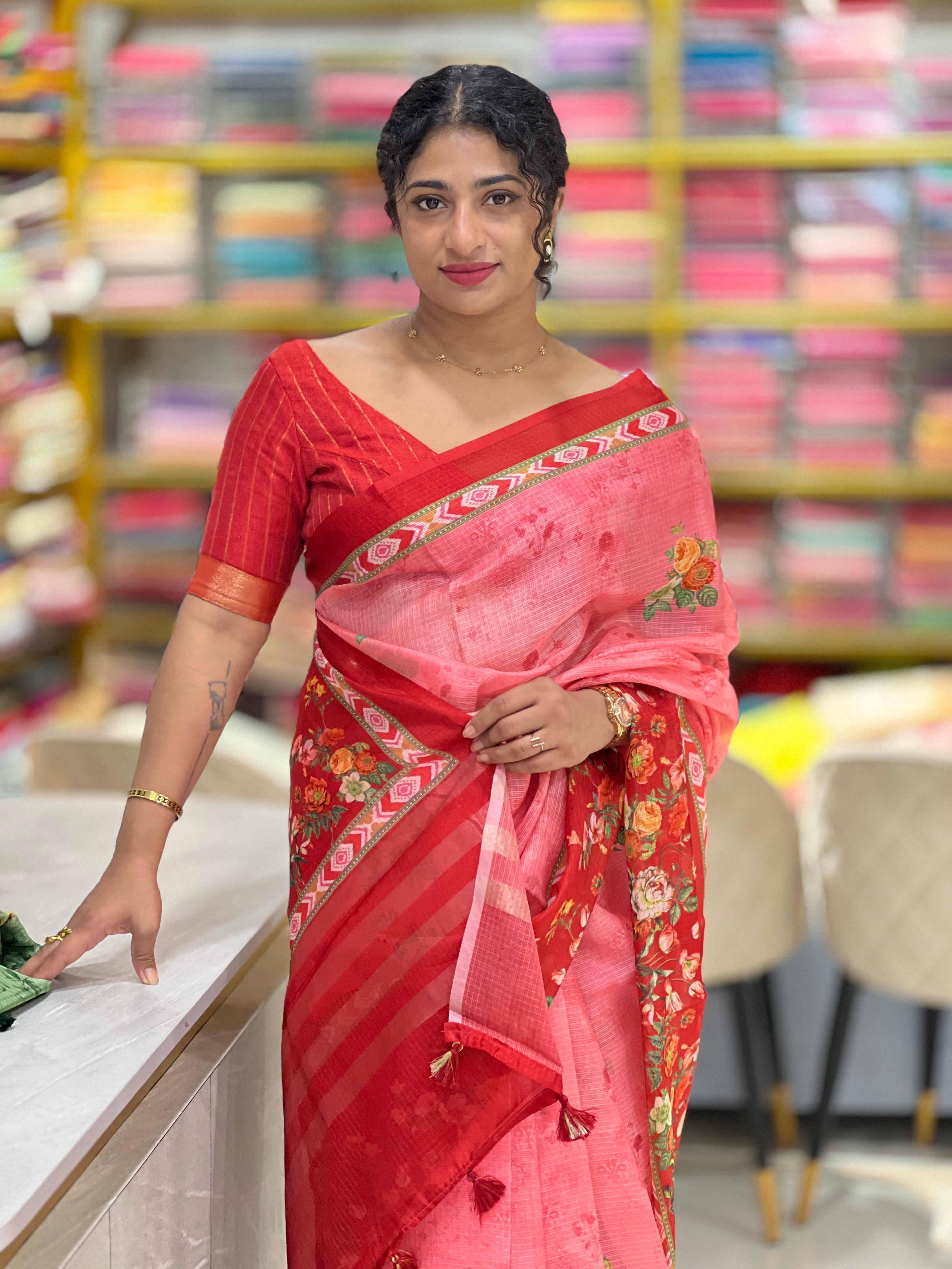 - Style: Digital Printed, Floral Pattern, Contrast Borders & Pallu, Zari Stripe Detailed Pallu, Tassels Attached