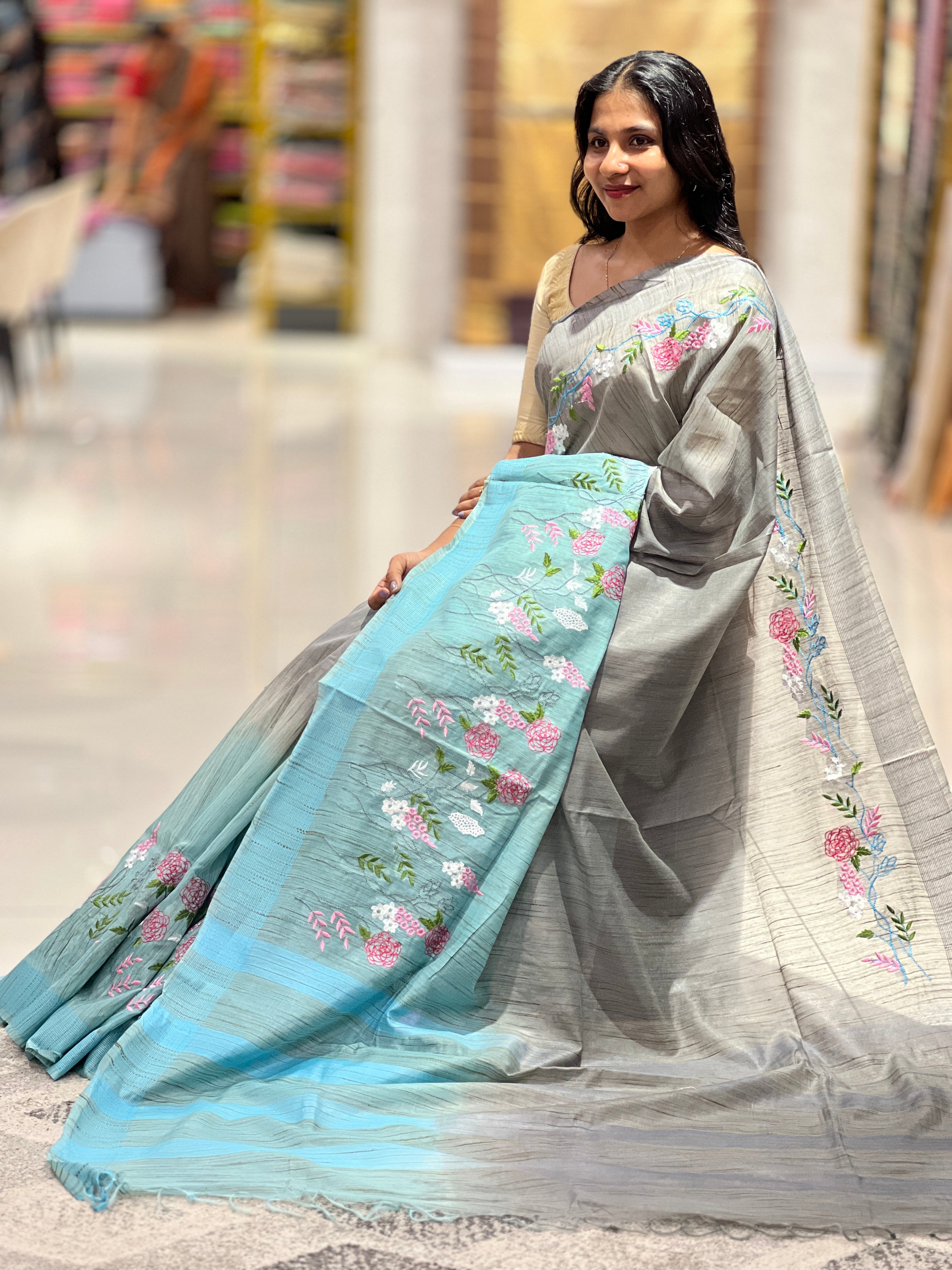 • Floral Embroidered Bhagalpuri Linen Saree | NHH369