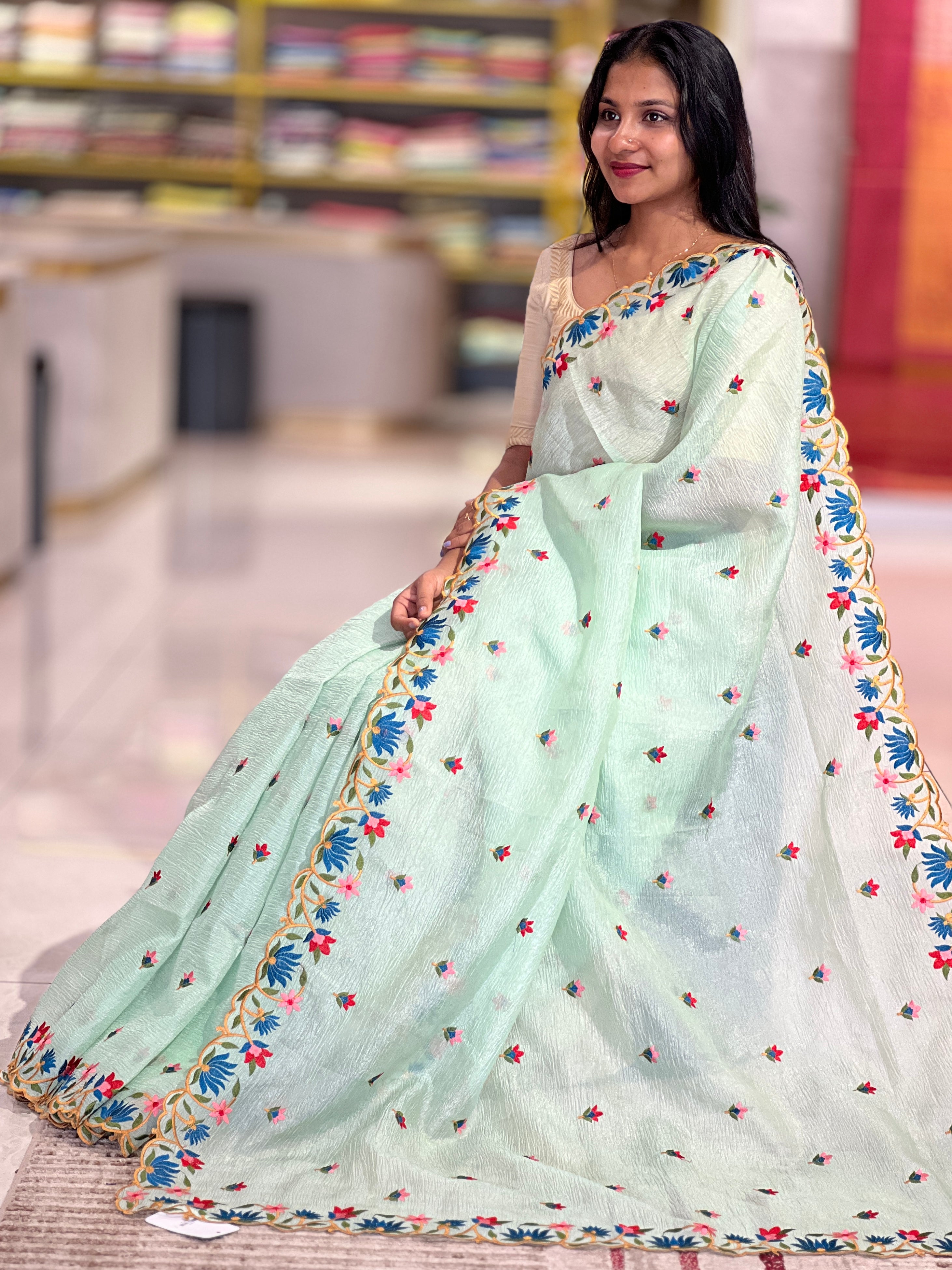 - Style: Multi- Color Floral Embroidered Borders, Scattered Floral Embroidered Buta Detailing, Uneven Scallop Edges