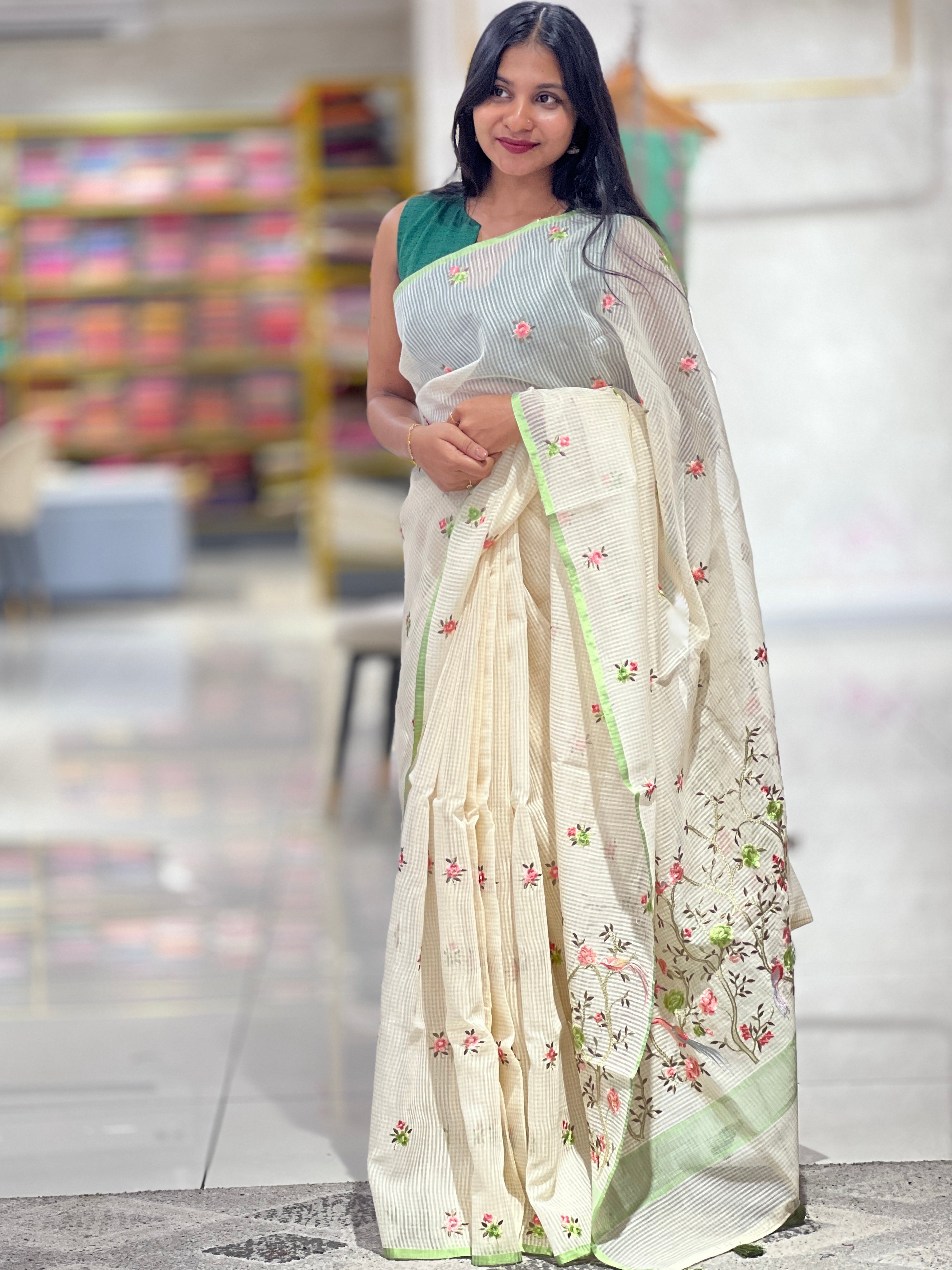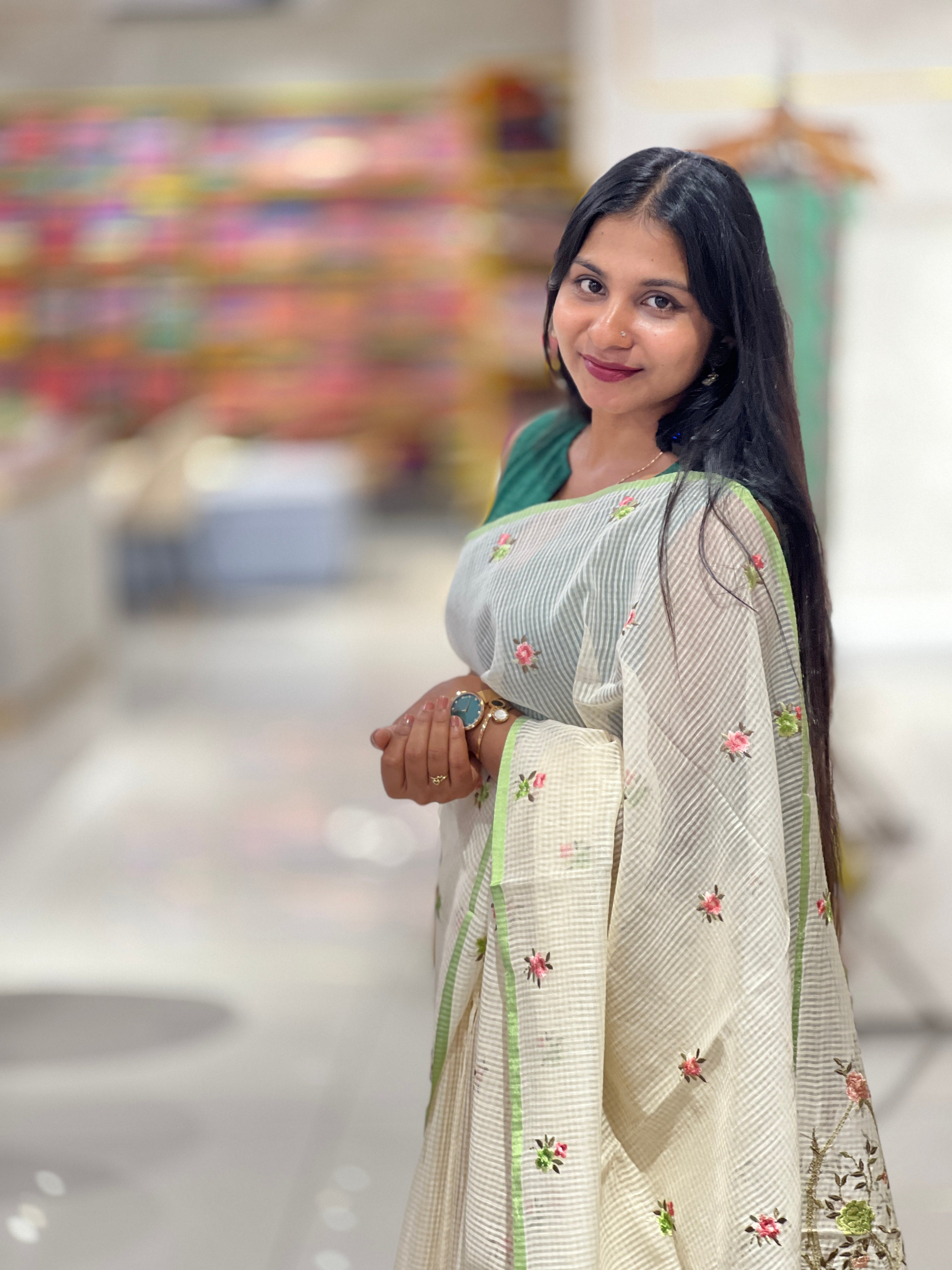 - Style: Scattered Floral Embroidery Detailing, Floral Embroidered Pallu, Tassels Attached, Contrast Thin Borders