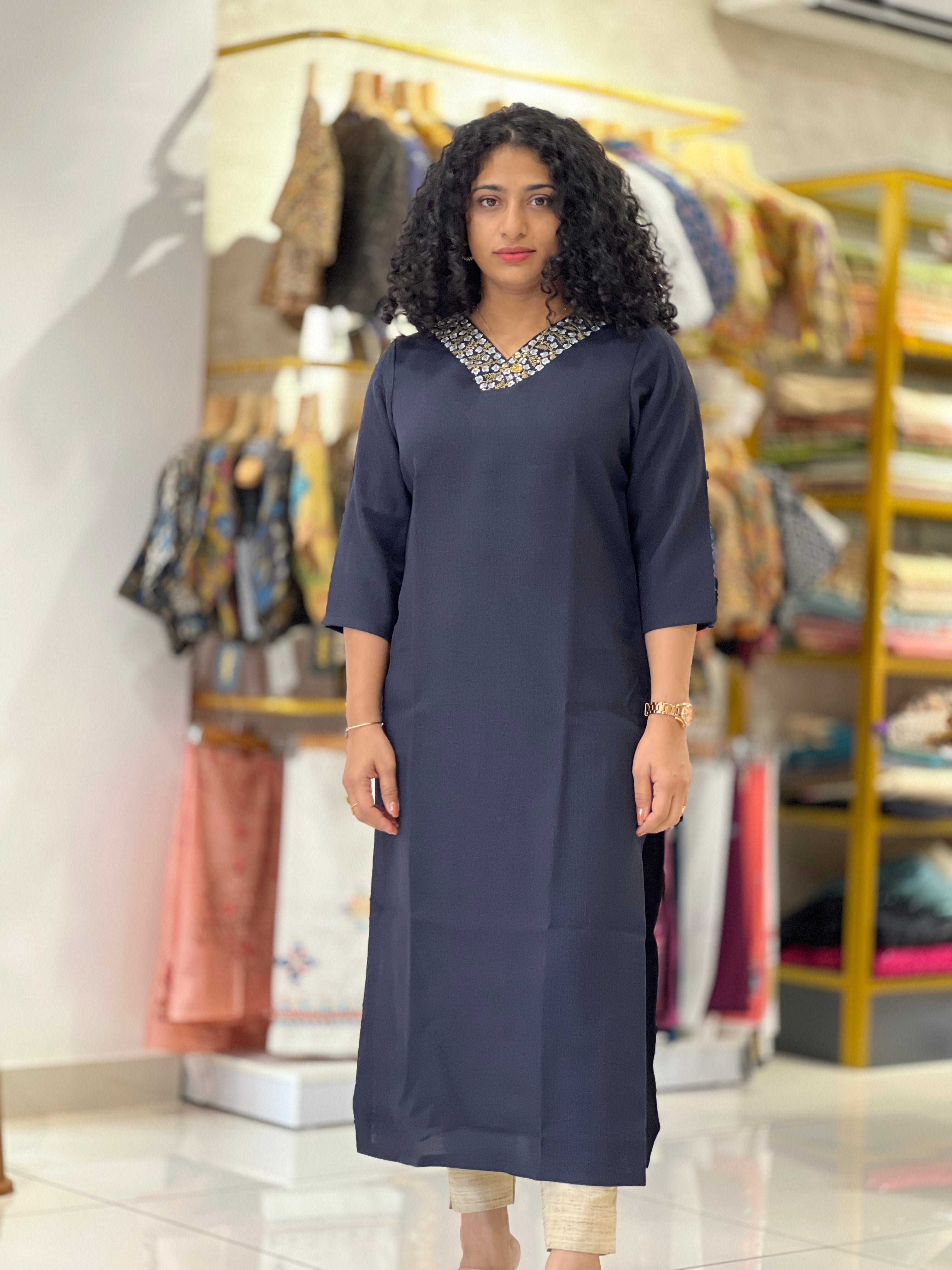 - Style: Floral Embroidered Neck Pattern With Solid Body, Side Slitted