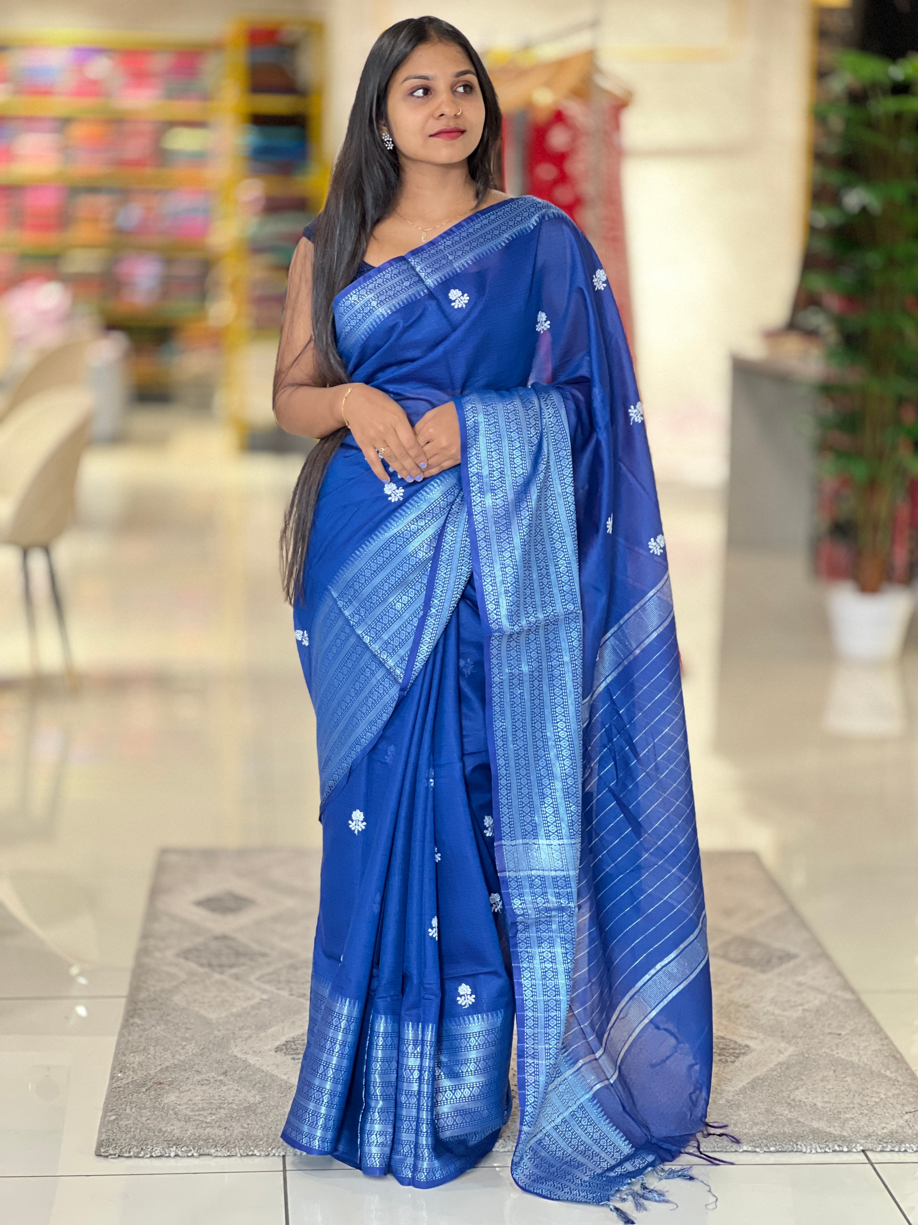 • Style: Floral Embroidery Placement , Silver Zari Woven  Mangalgiri Borders, Stripe Patterned Pallu