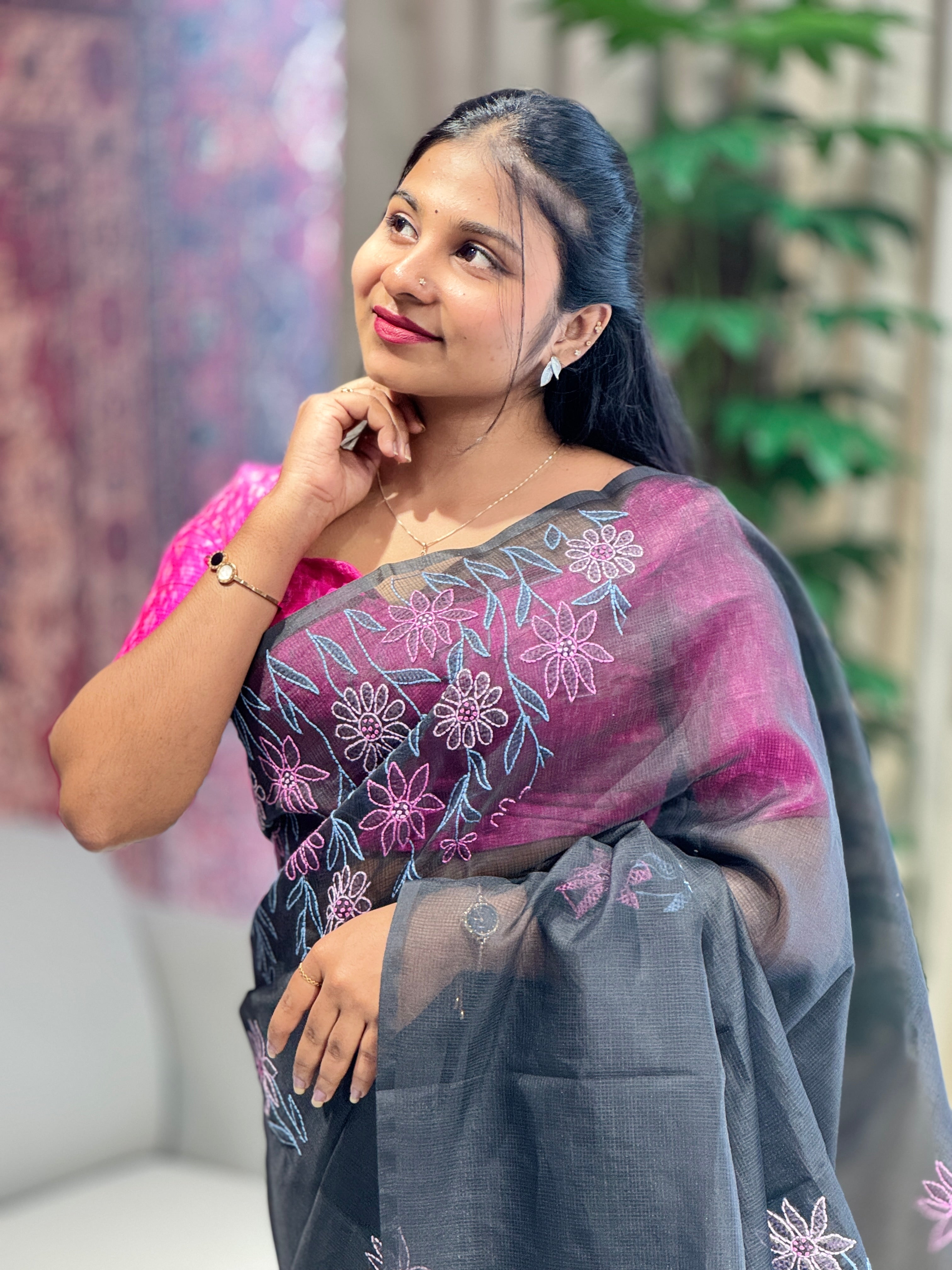 • Floral Embroidery Detailed Muga Check Organza Saree | JSC450