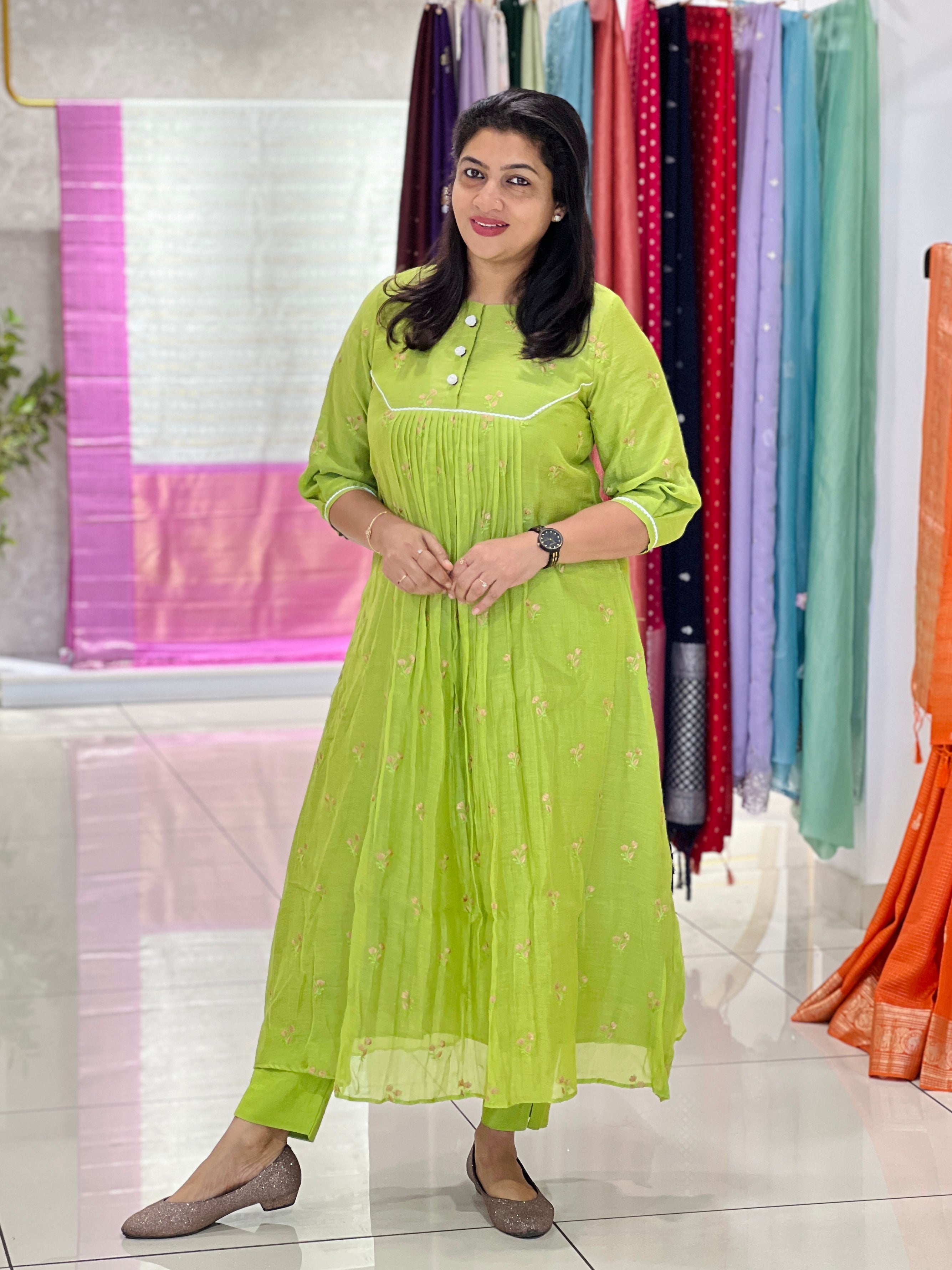 - Style - Floral Hand Embroidery, Button Detailing, Gathering Detailing, Crochet Lace Detailed Yoke & Sleeves, A-Line