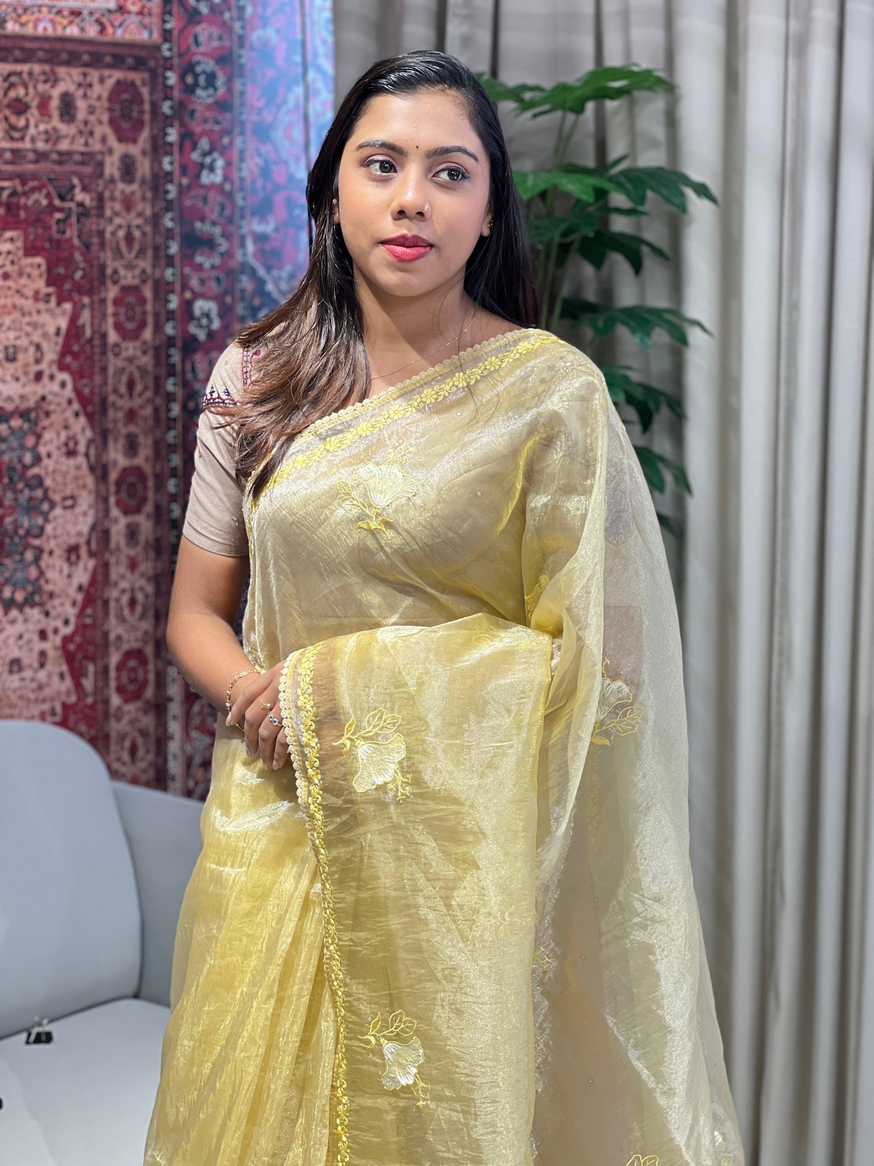 - Style: Floral Embroidery, Scattered Floral Motif, Pallu and Border Detailing, Lace Detailing