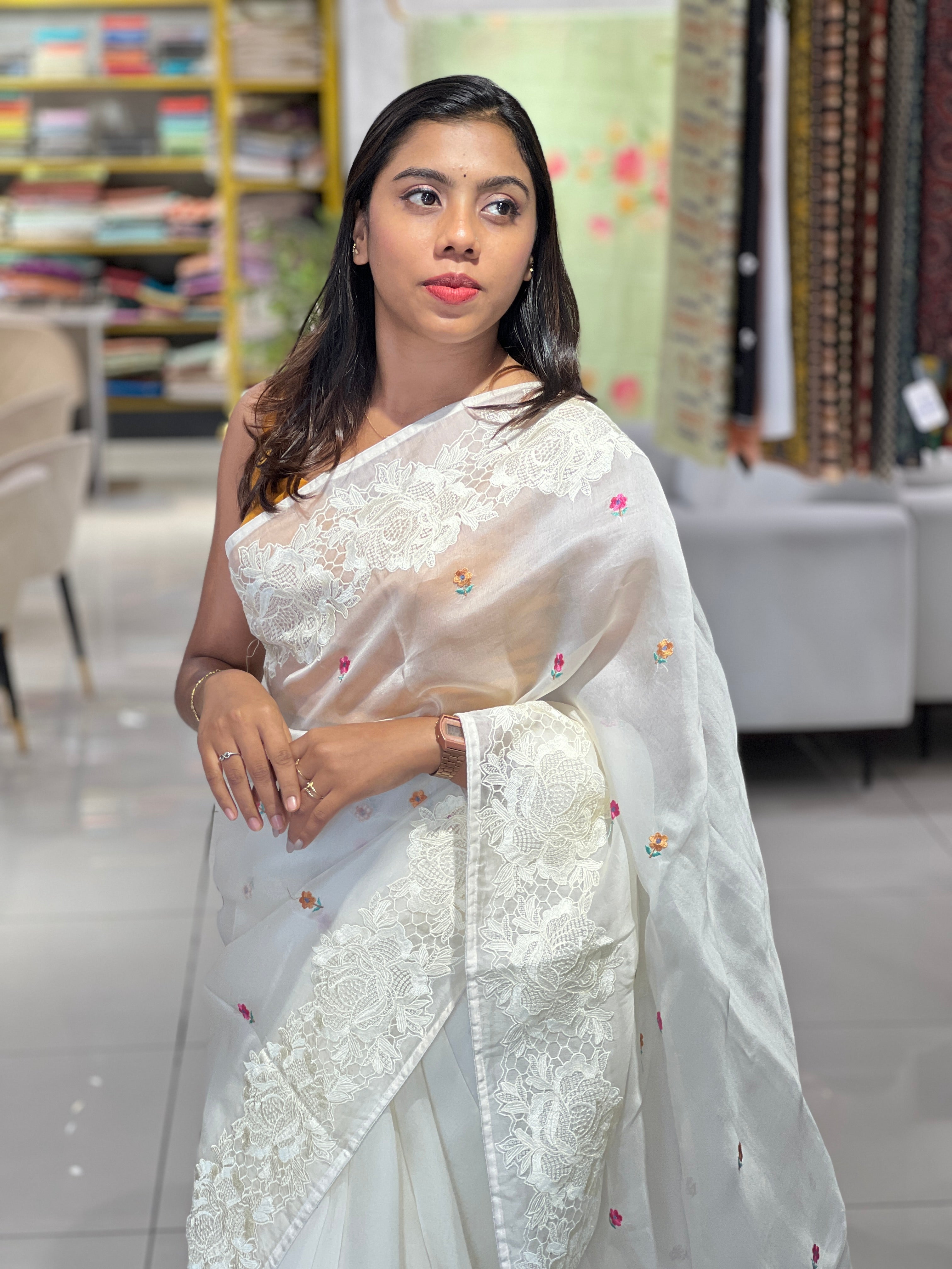 - Style: Scattered Floral Embroidery Butta, Floral Embroidered Pallu & Borders, Flat Facing Finished Edges