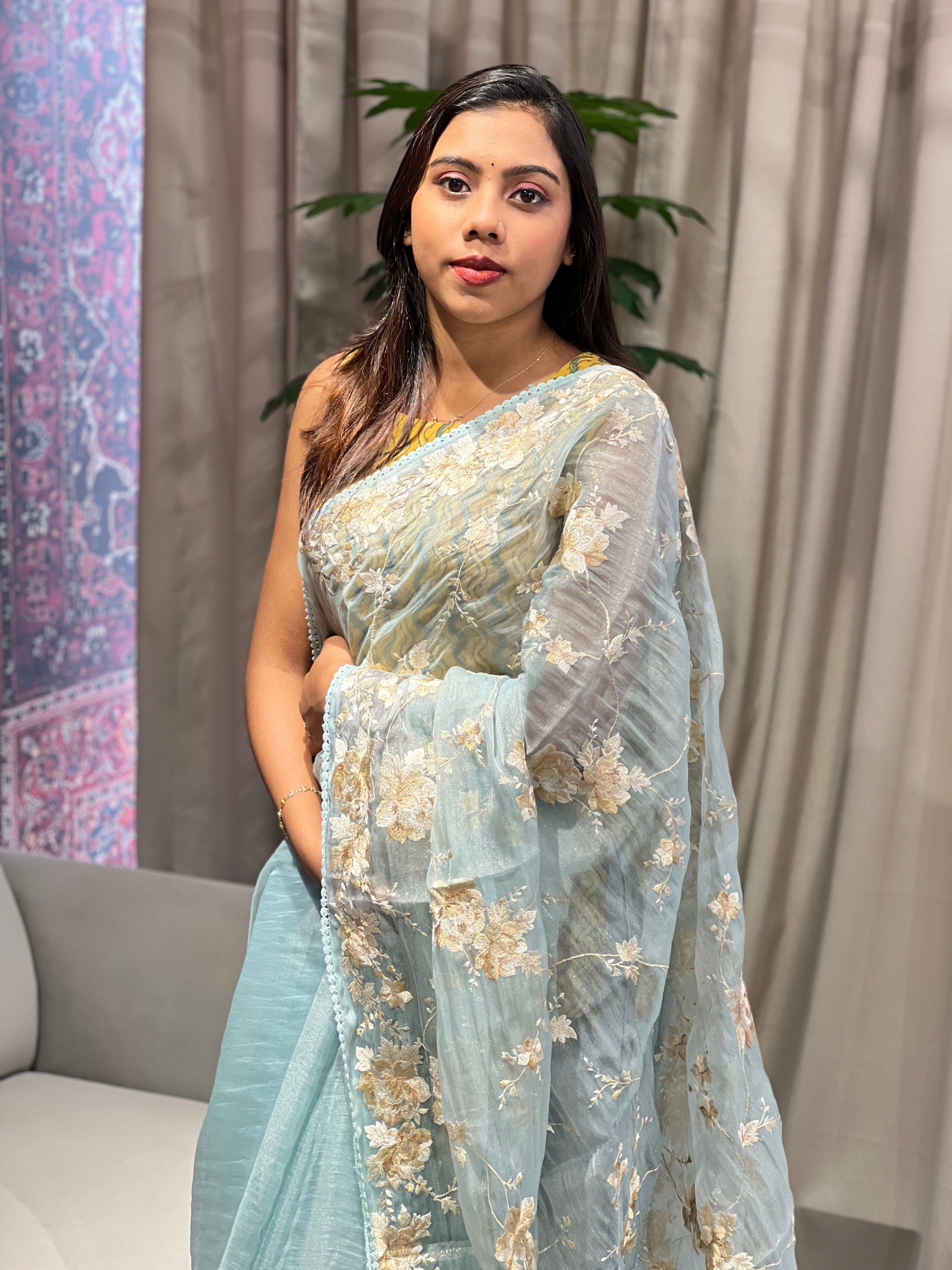 • Floral Embroidery Detailed Shimmer Organza Saree | BLD1912