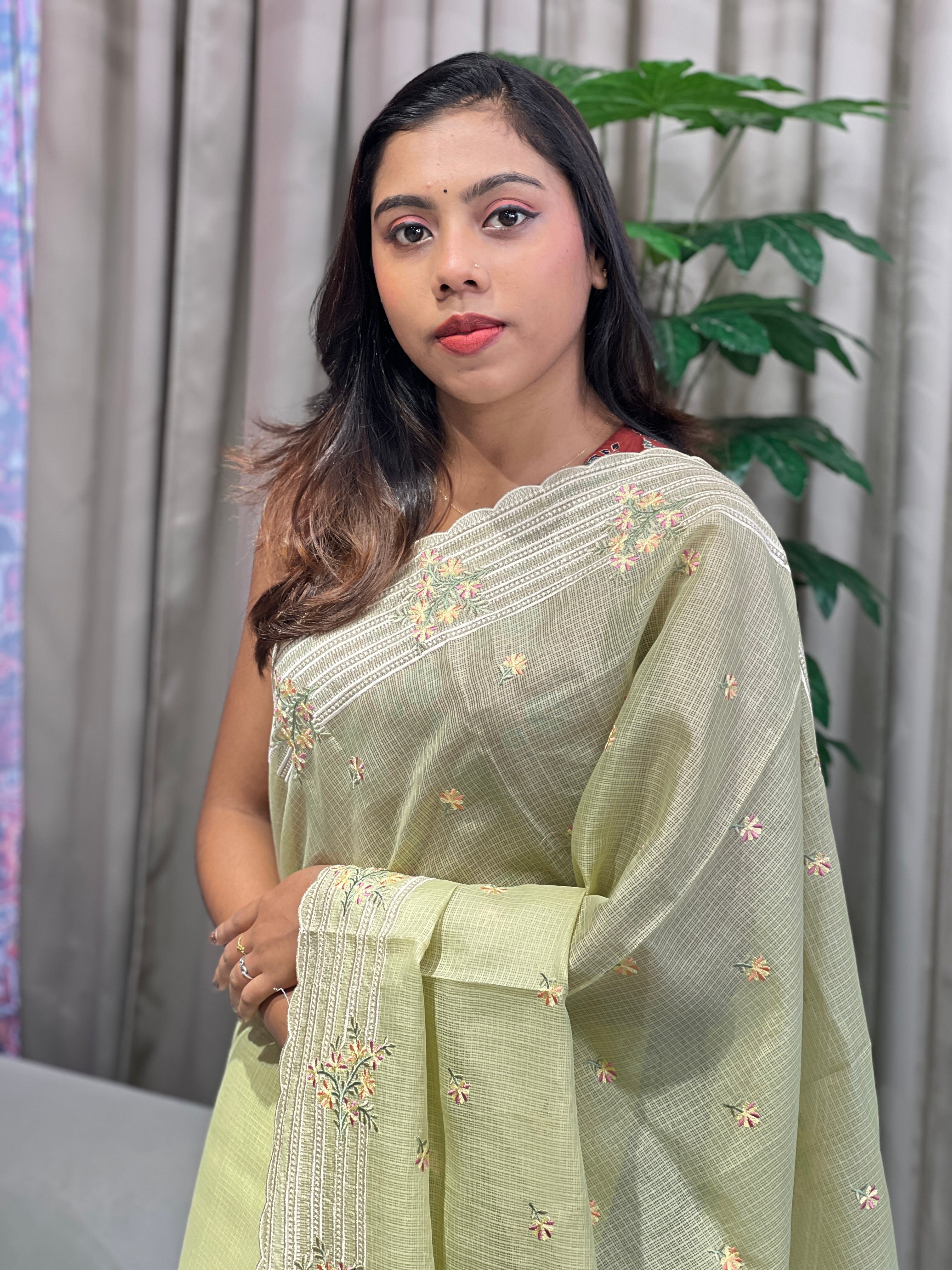 - Style: Scattered Floral Butta, Point Embroidery With Floral Embroidered Borders, Scallop Finished Edges, Machine Embroidery