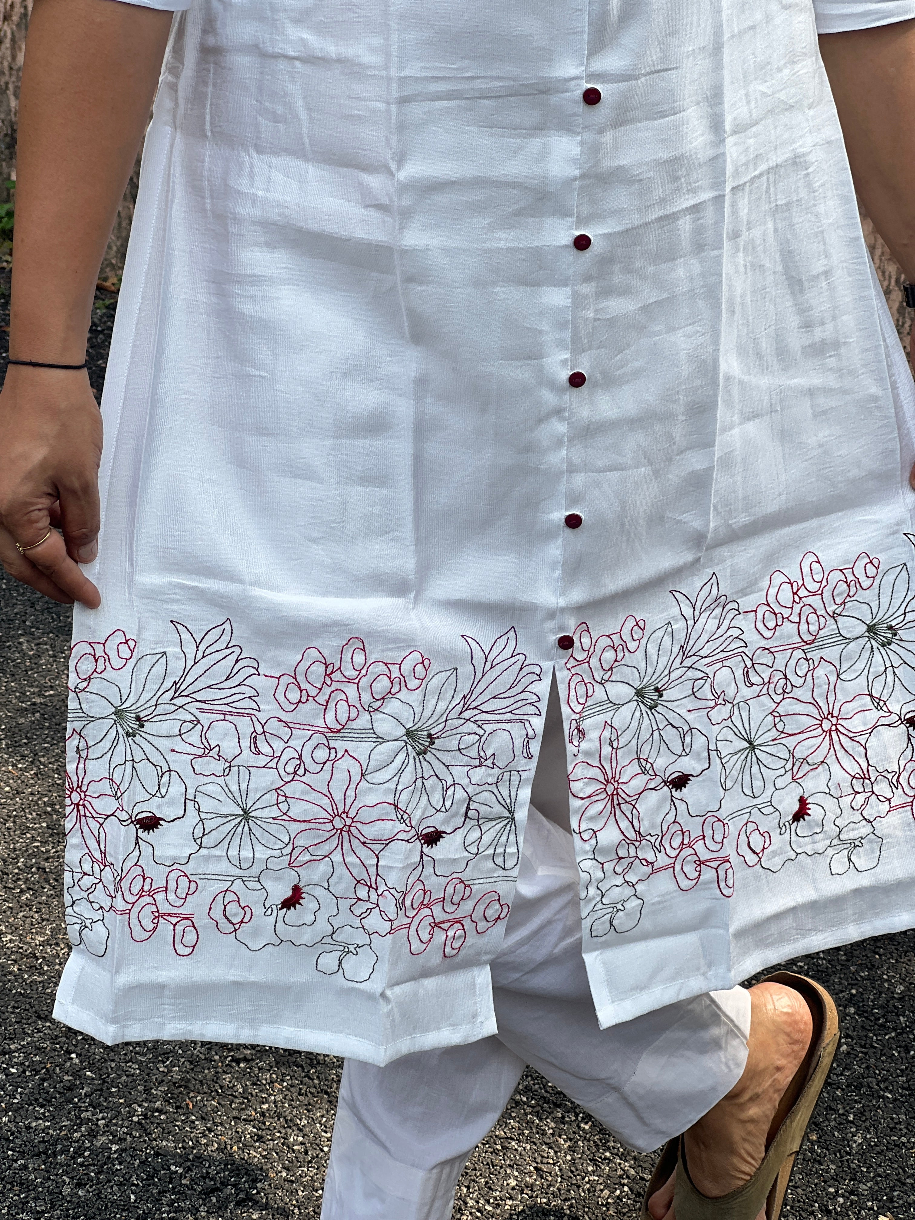 - Style: Floral Embroidery Detailing, Side Slit Pattern, Loop With Button Detailing, Front Low Slit