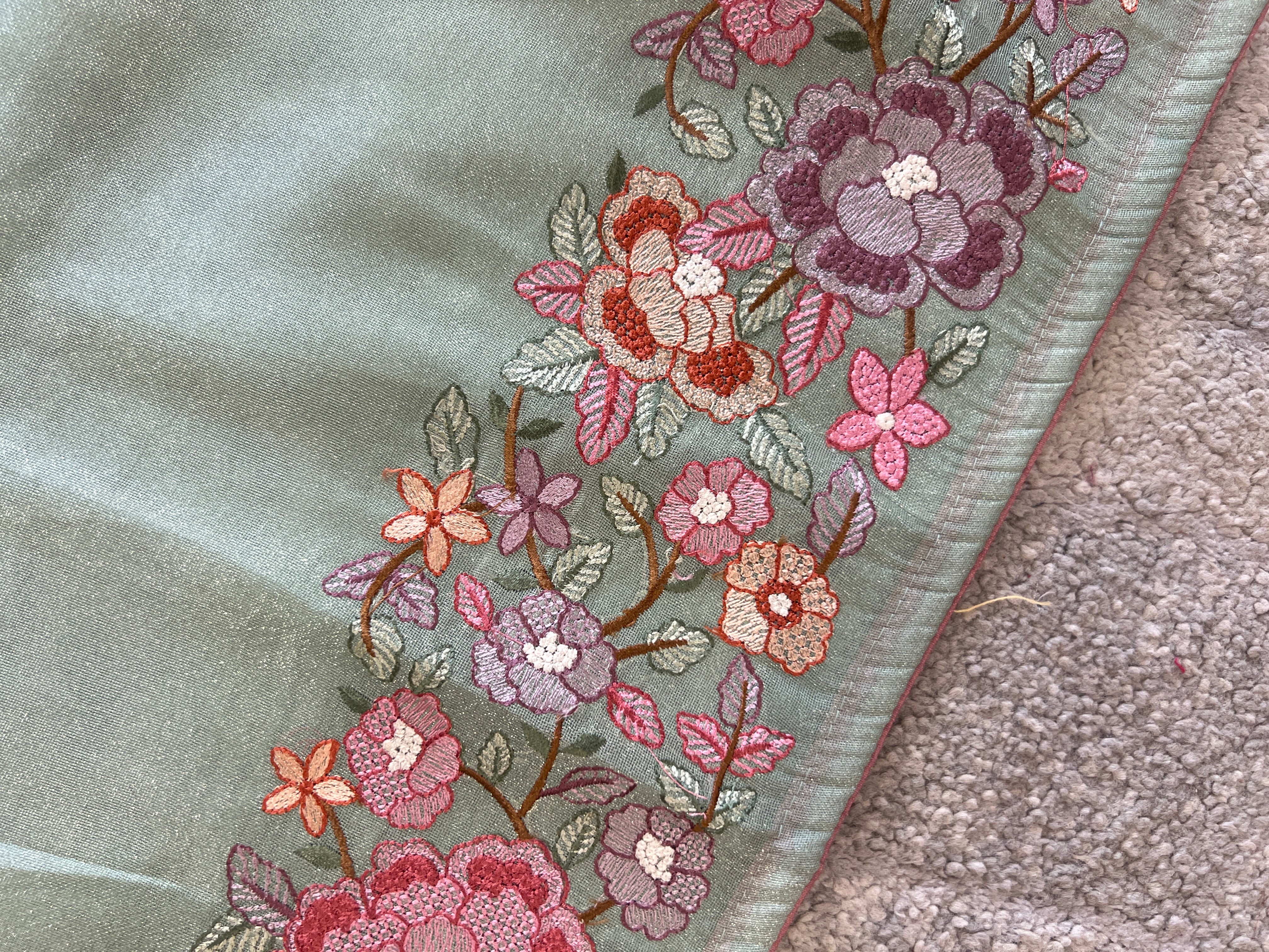 • Style: Computerized Floral Embroidery Borders, Flat Facing Edges, Multi-Color Floral Pattern