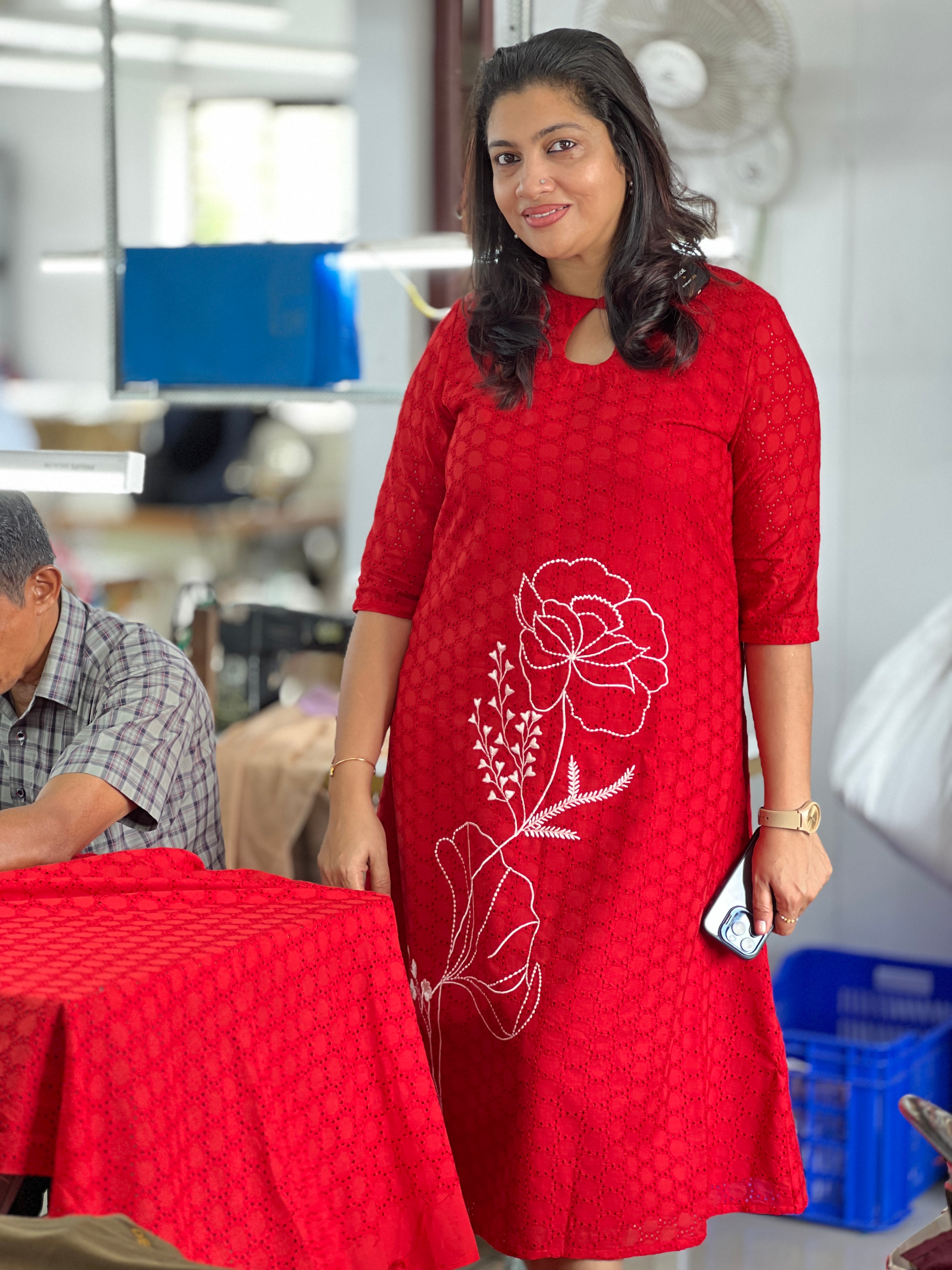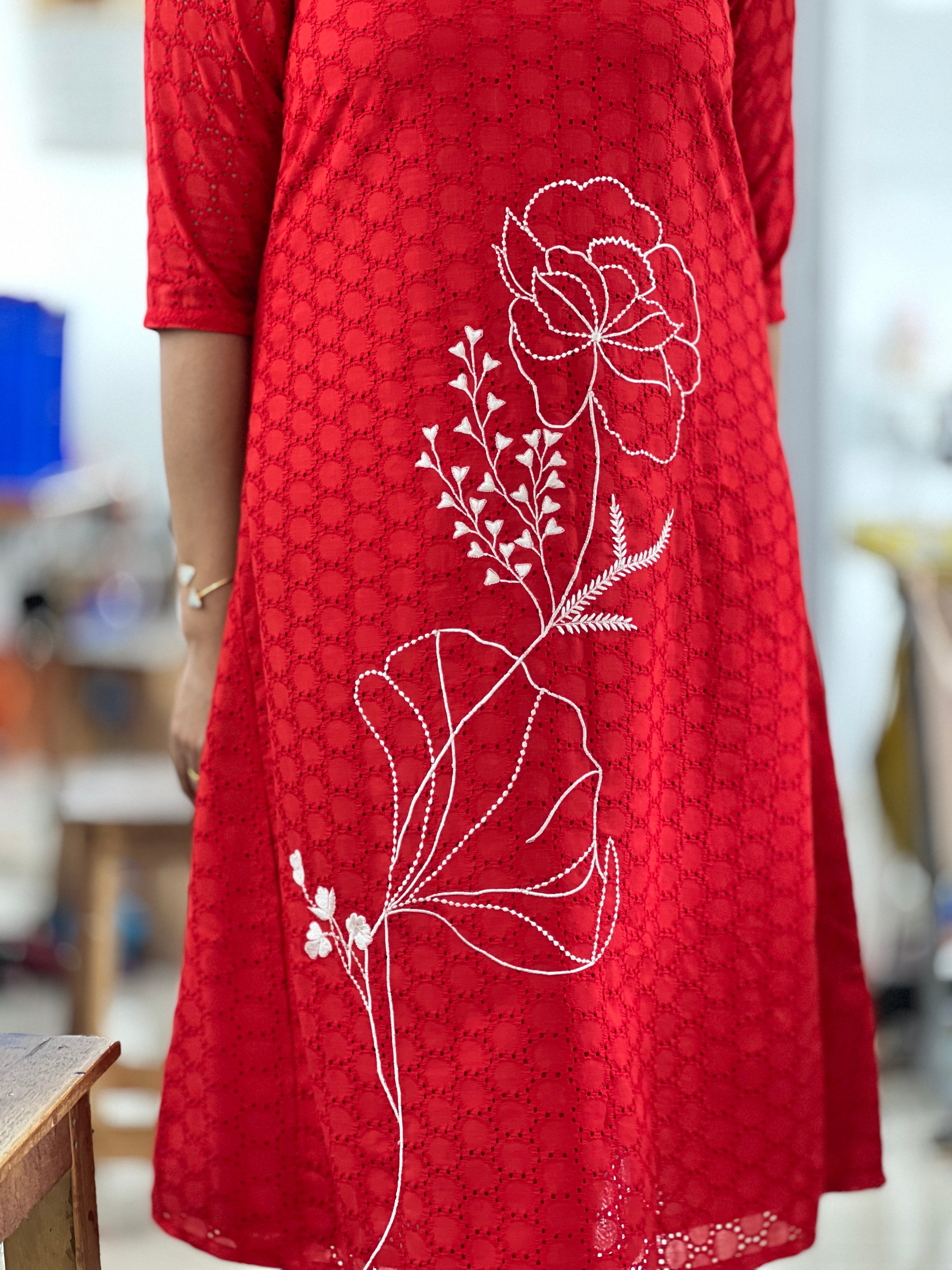 - Style - A-Line Pattern,Shiffli Pattern,Floral Embroidery ,Neck ( Oval Opening )Colth Button,With Lining