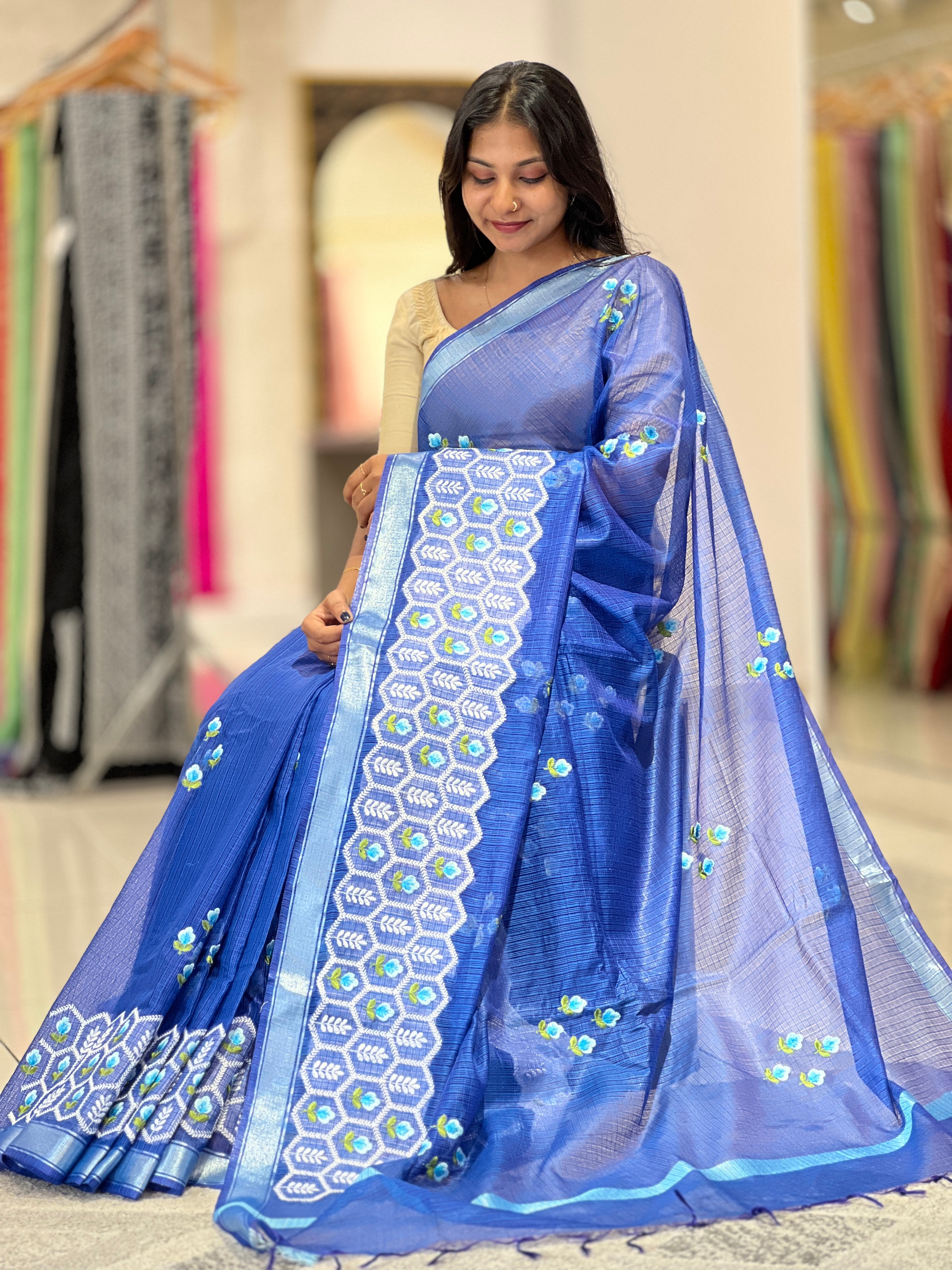 - Style: Embroidery Pattern, Silver Zari Border, Power Loom,Honey Comb Design