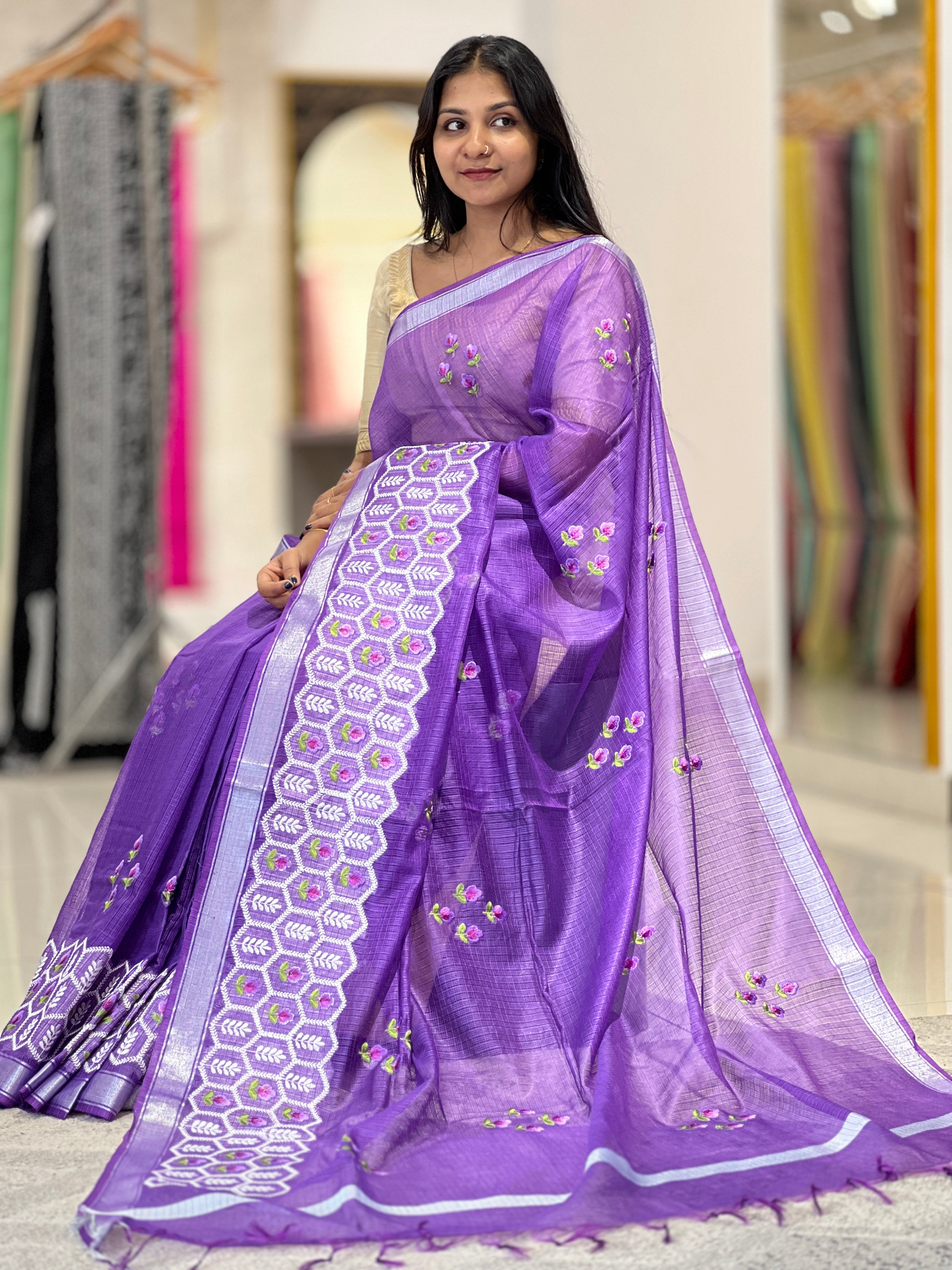 • Style:Floral Embroidery Pattern, Silver Zari Border, Power Loom,Honey Comb Design