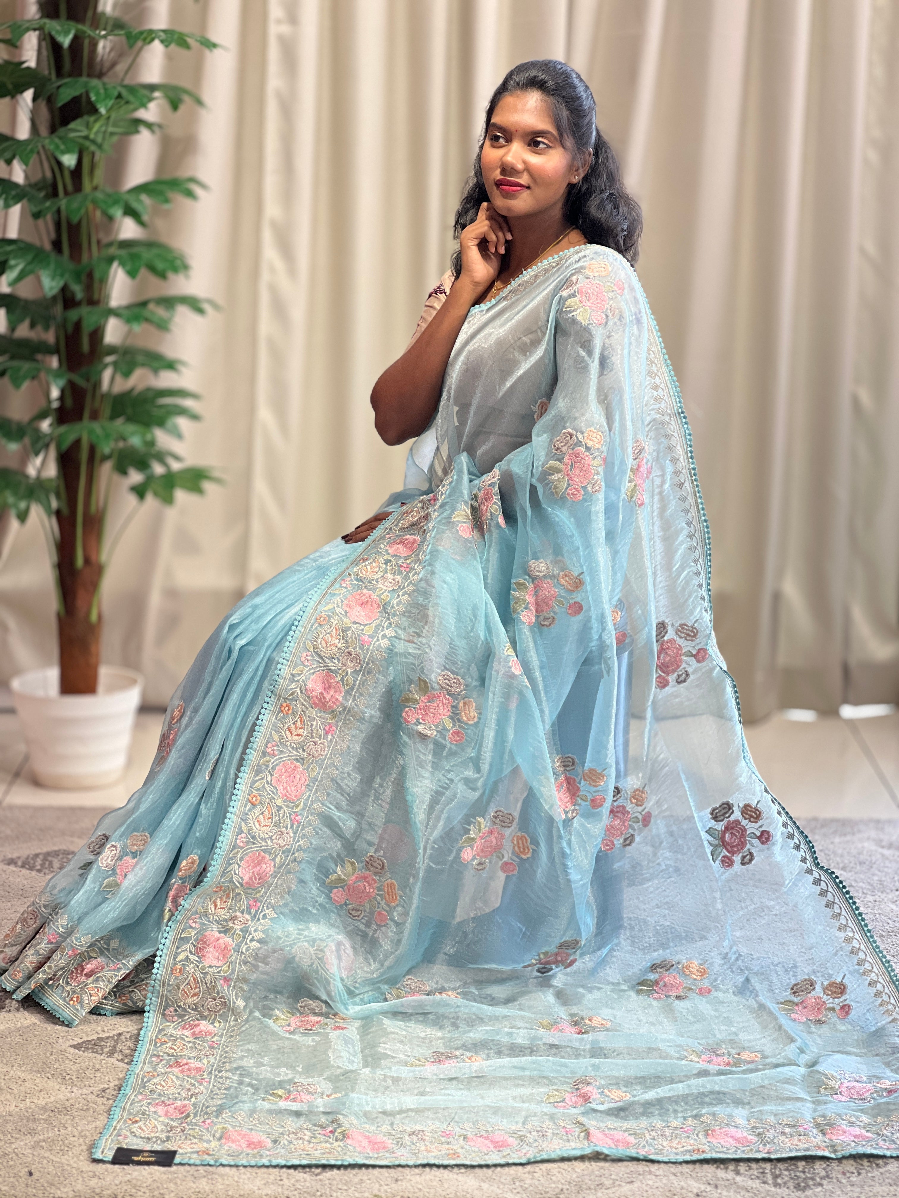 Floral Embroidery With Silver Zari Detailed Organza Saree | BLD1090 Floral Embroidery With Silver Zari Detailed Organza Saree | BLD1090