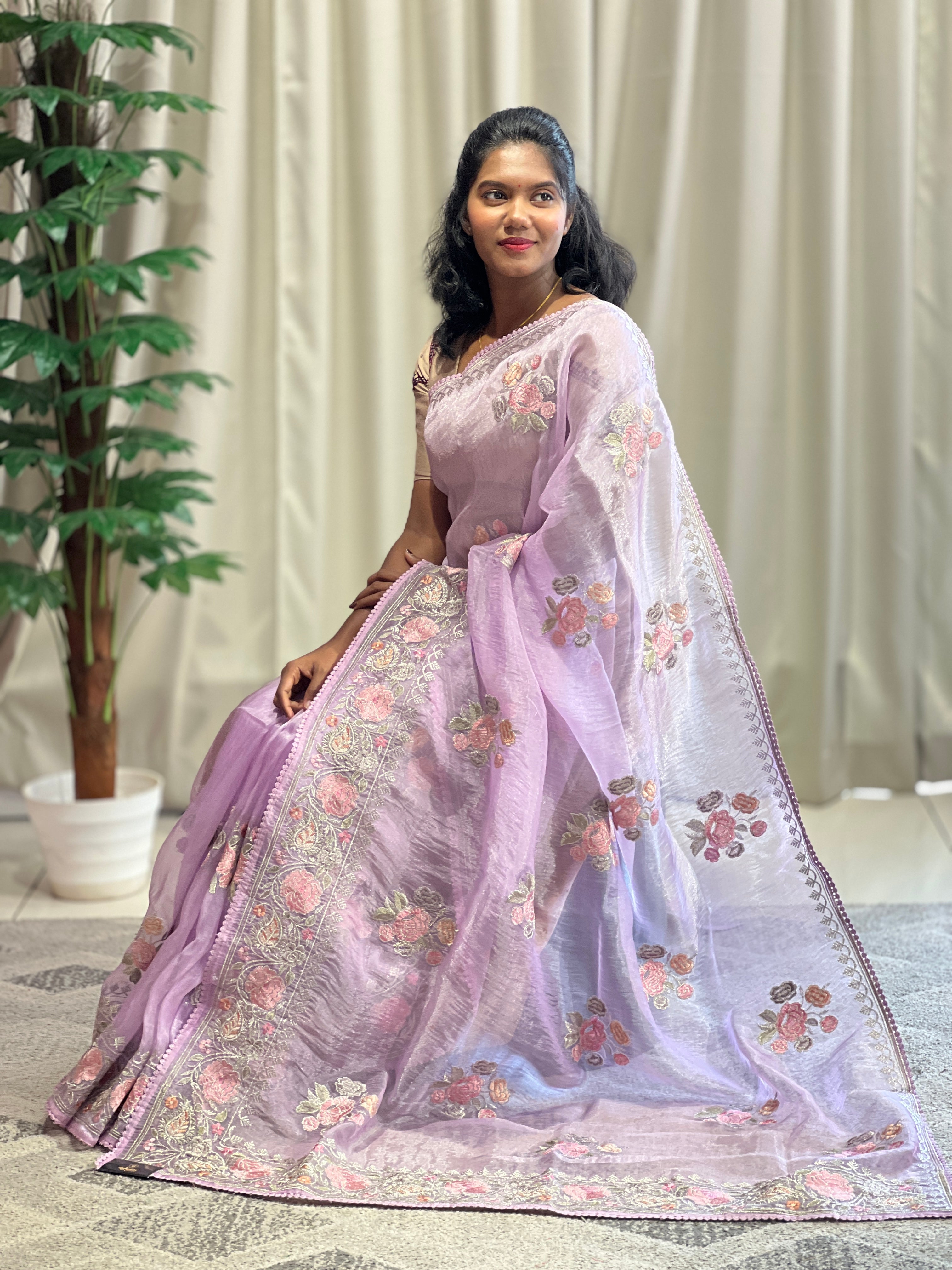 Floral Embroidery With Silver Zari Detailed Organza Saree | BLD1091