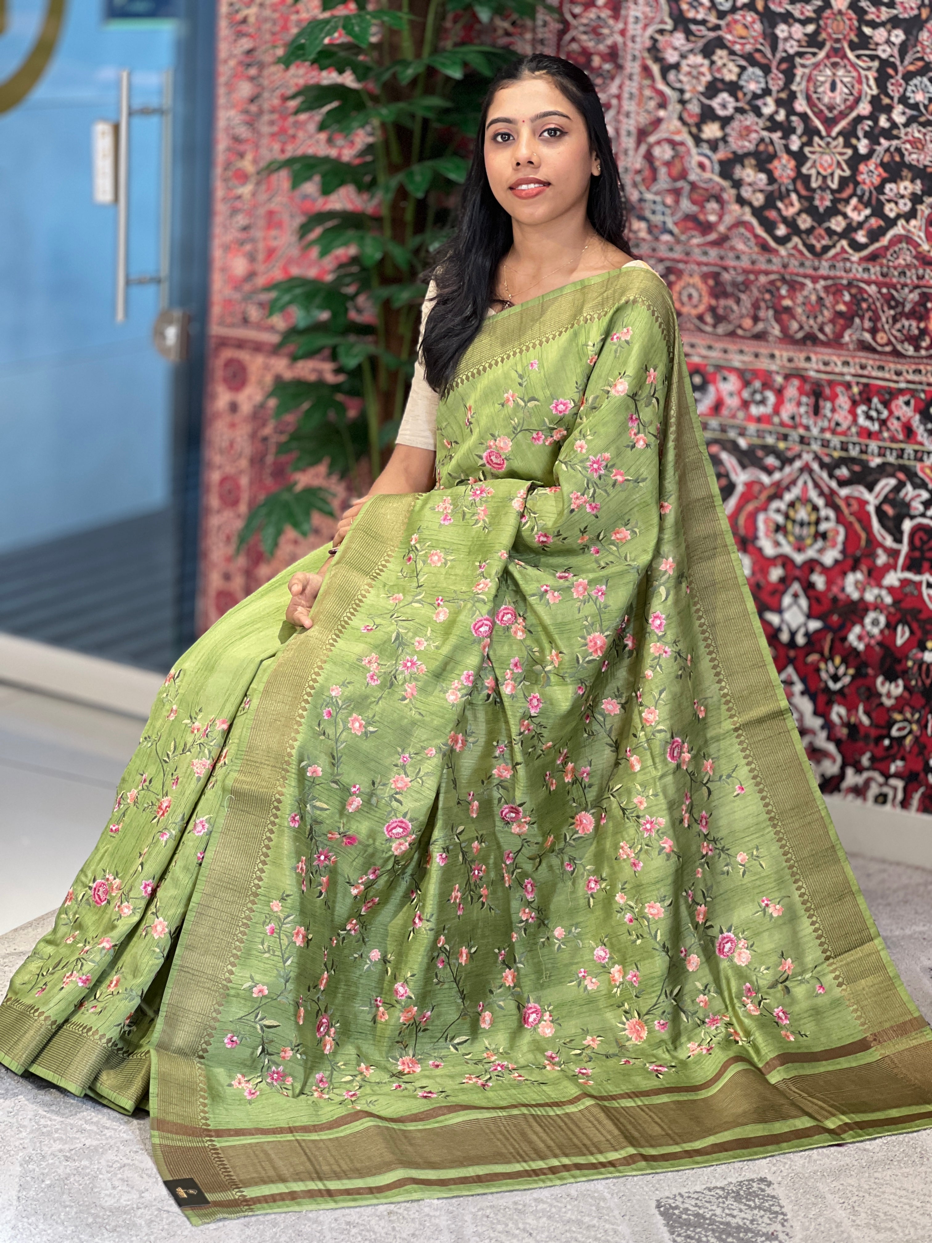 Floral Embroidery With Zari Border Detailed Semi Tussar Saree | SUN350