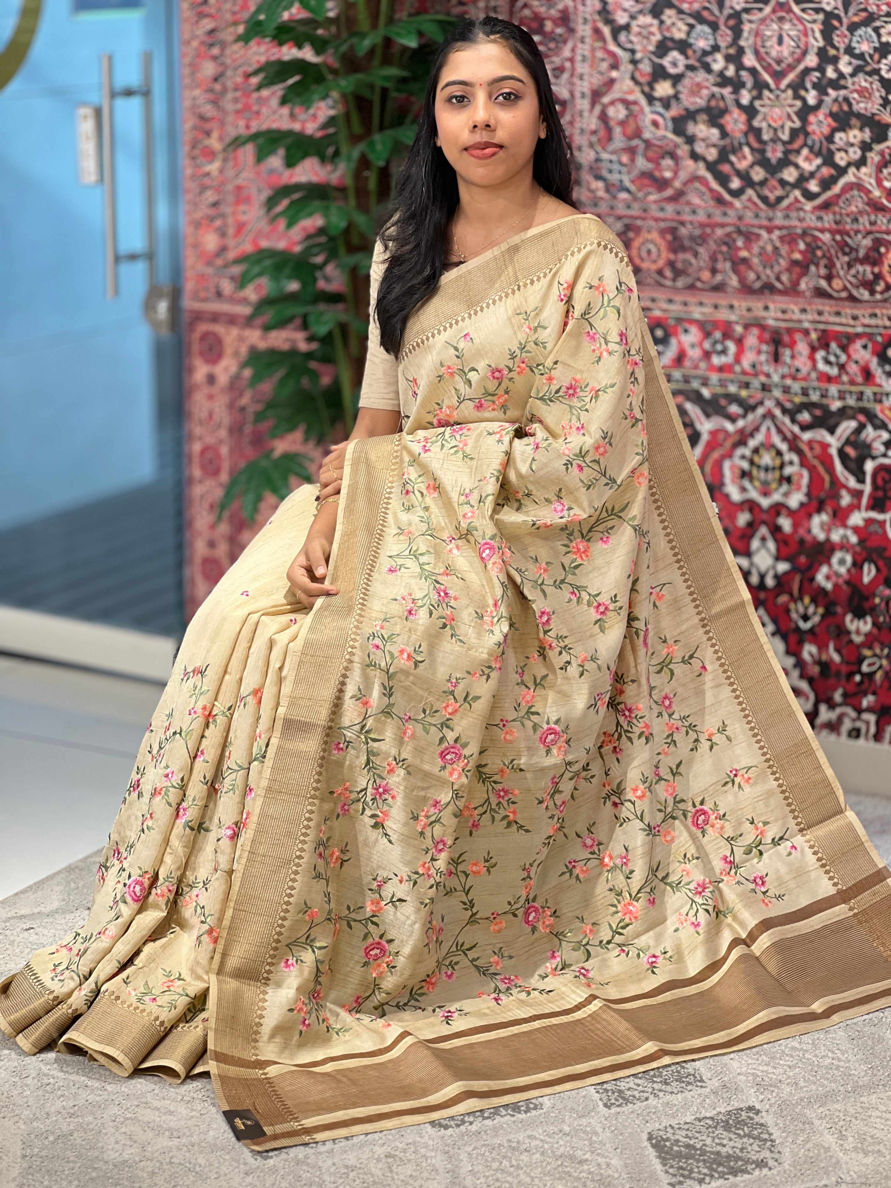 Floral Embroidery With Zari Border Detailed Semi Tussar Saree | SUN353