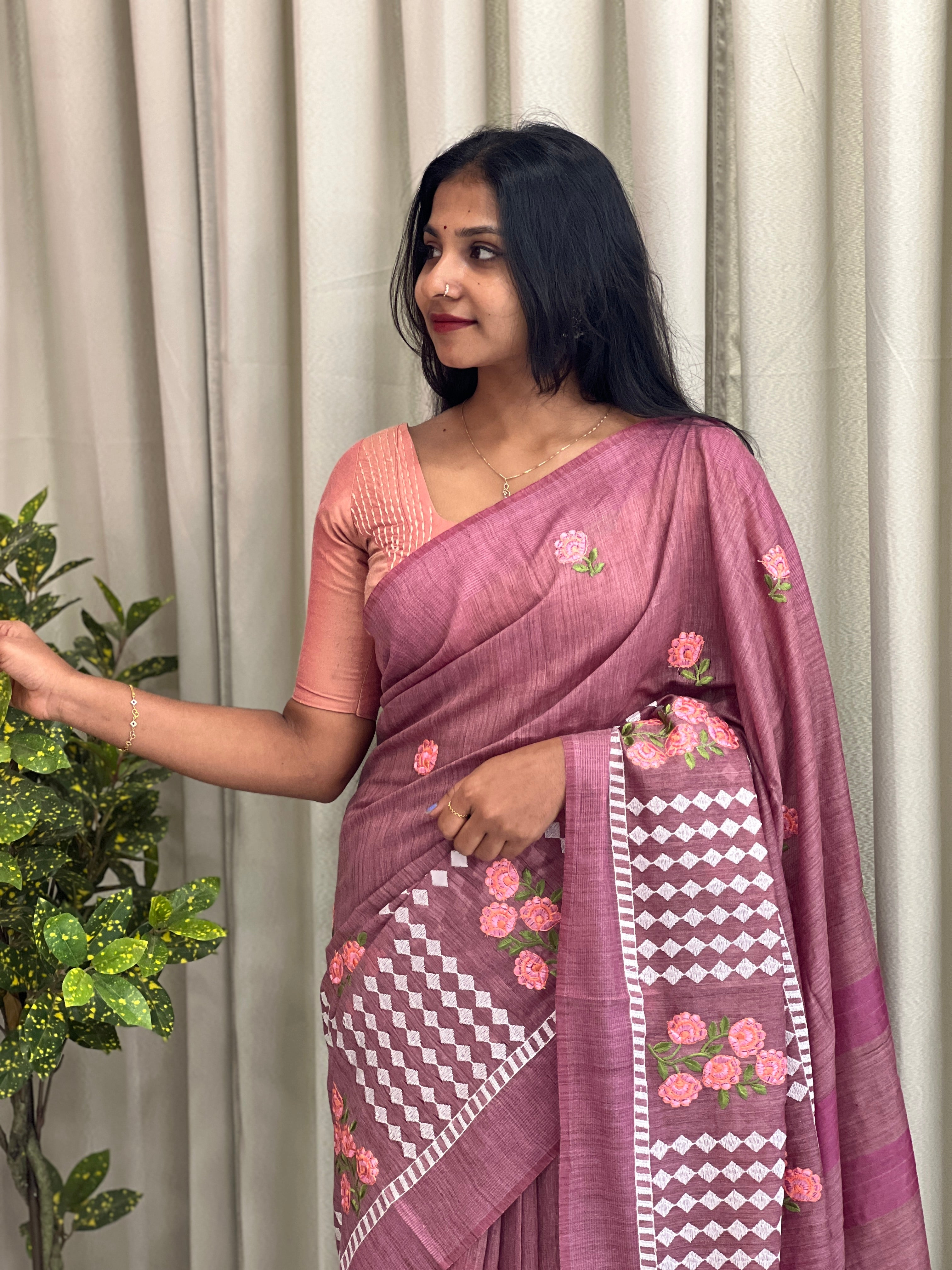 Floral & Geometric Embroidered Bhagalpuri Linen Saree | NHH443