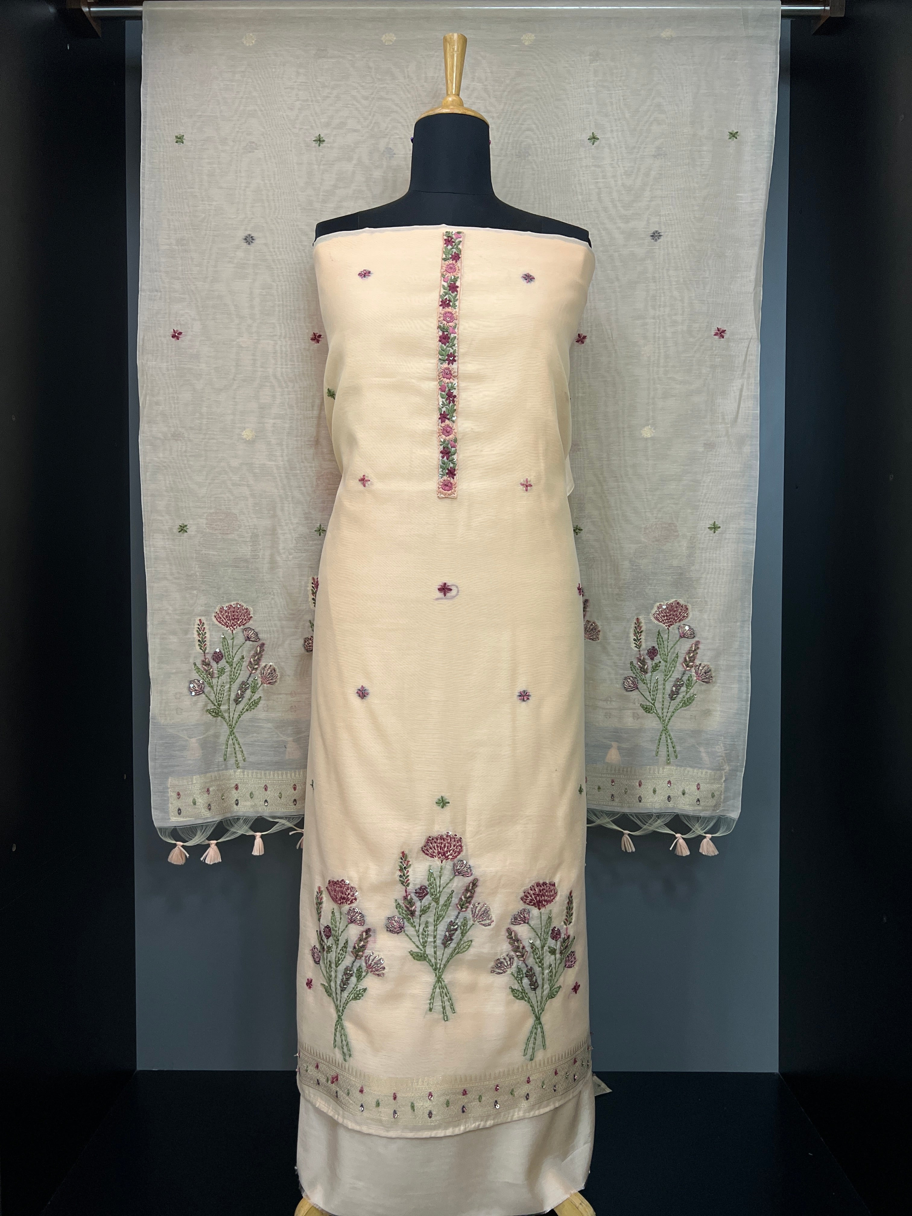 - Style: Hand Embroidery, Padi Detailing With Floral Embroidery, Scattered Embroidery Butas, Floral Embroidery With Sequence Highlight, Zari Borders, Hand Kantha Highlight