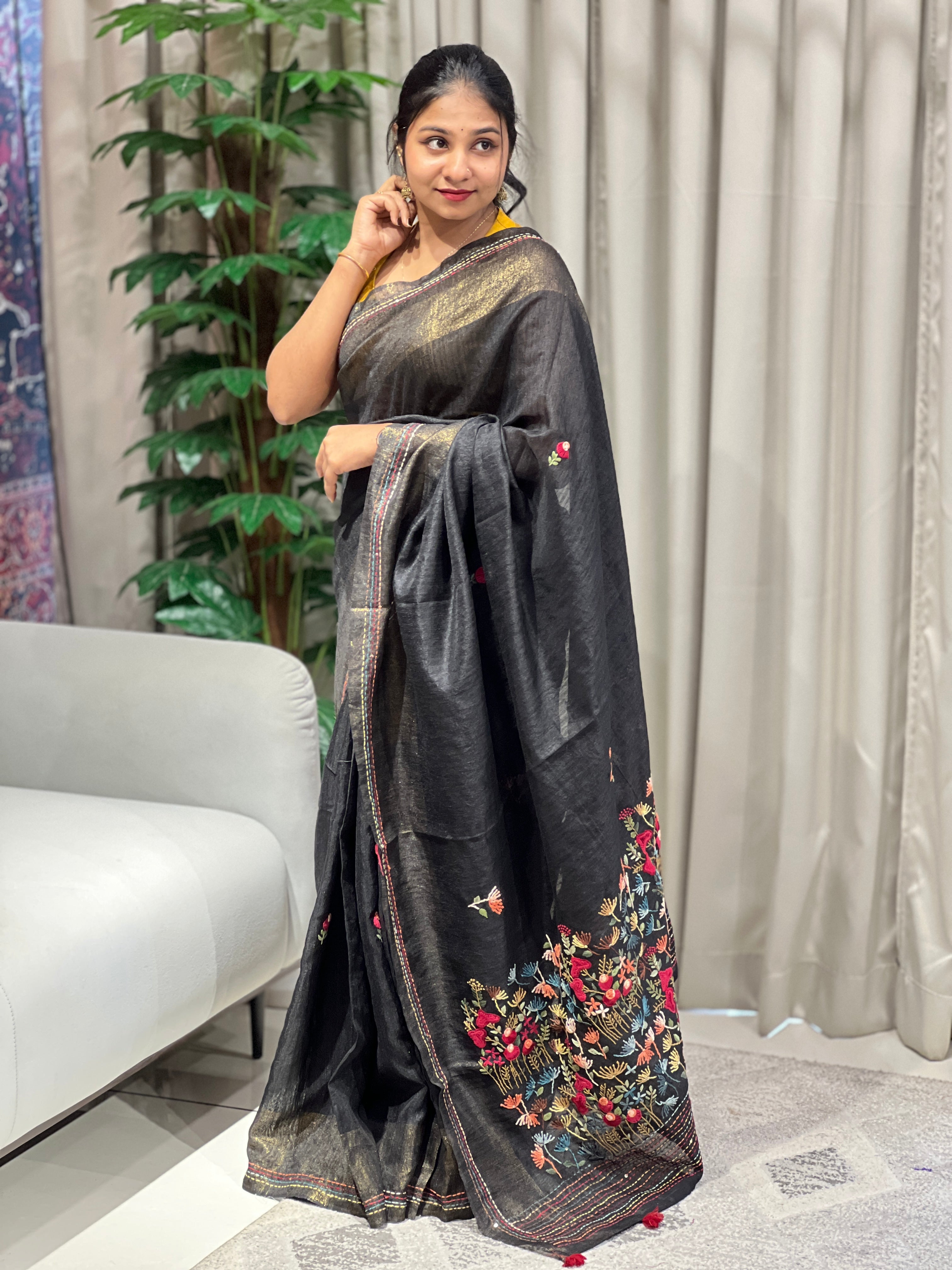 - Style: Hand Embroidery, Scattered Floral Motifs, Pallu Detailing, Border Detailing, Tassels Attached