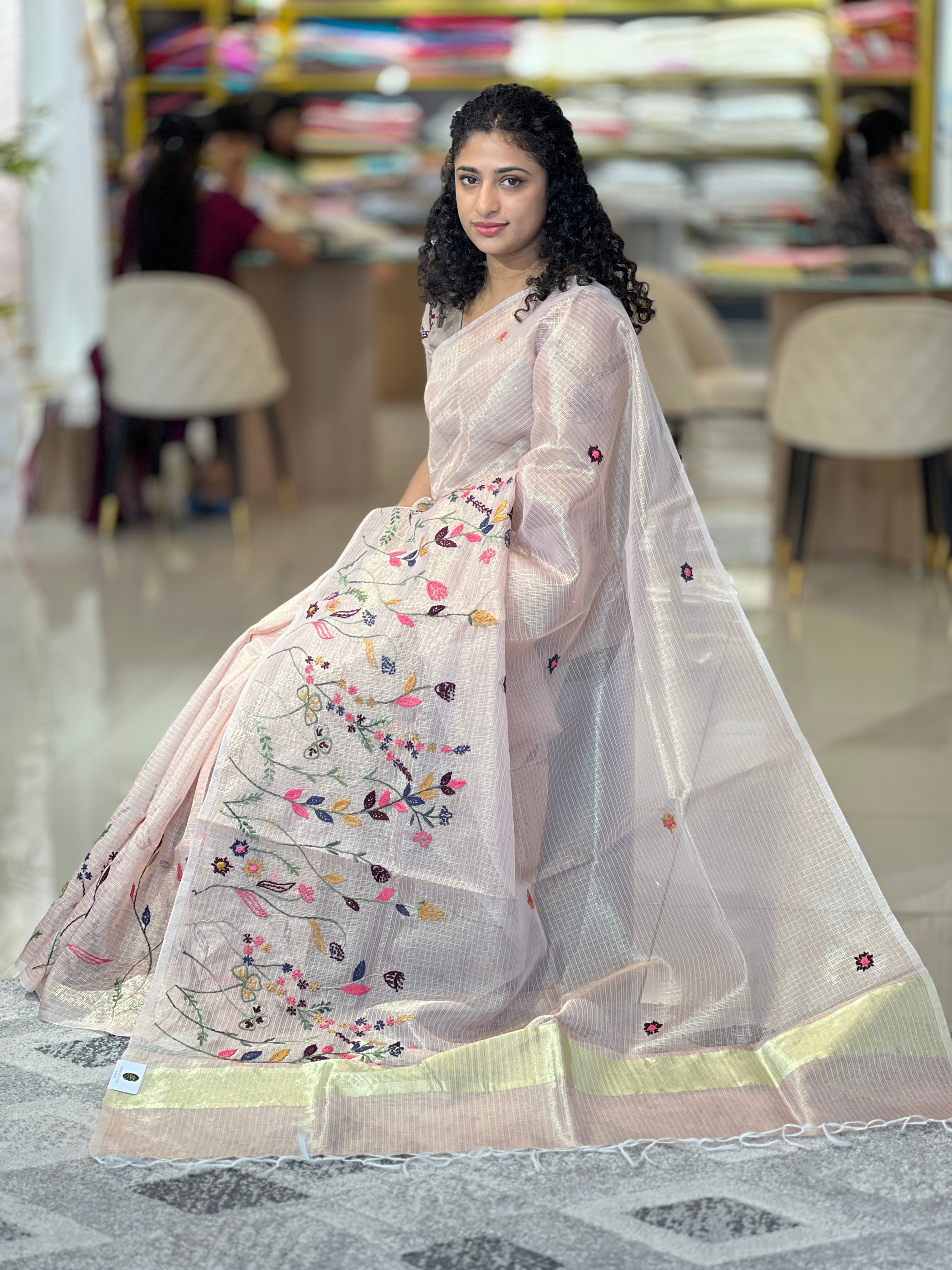 - Style: Banarasi, Hand Thread Embroidery Detailing, Multi-Color Floral Pattern, Golden Tissue Weaved Pallu, Tassels Knotted