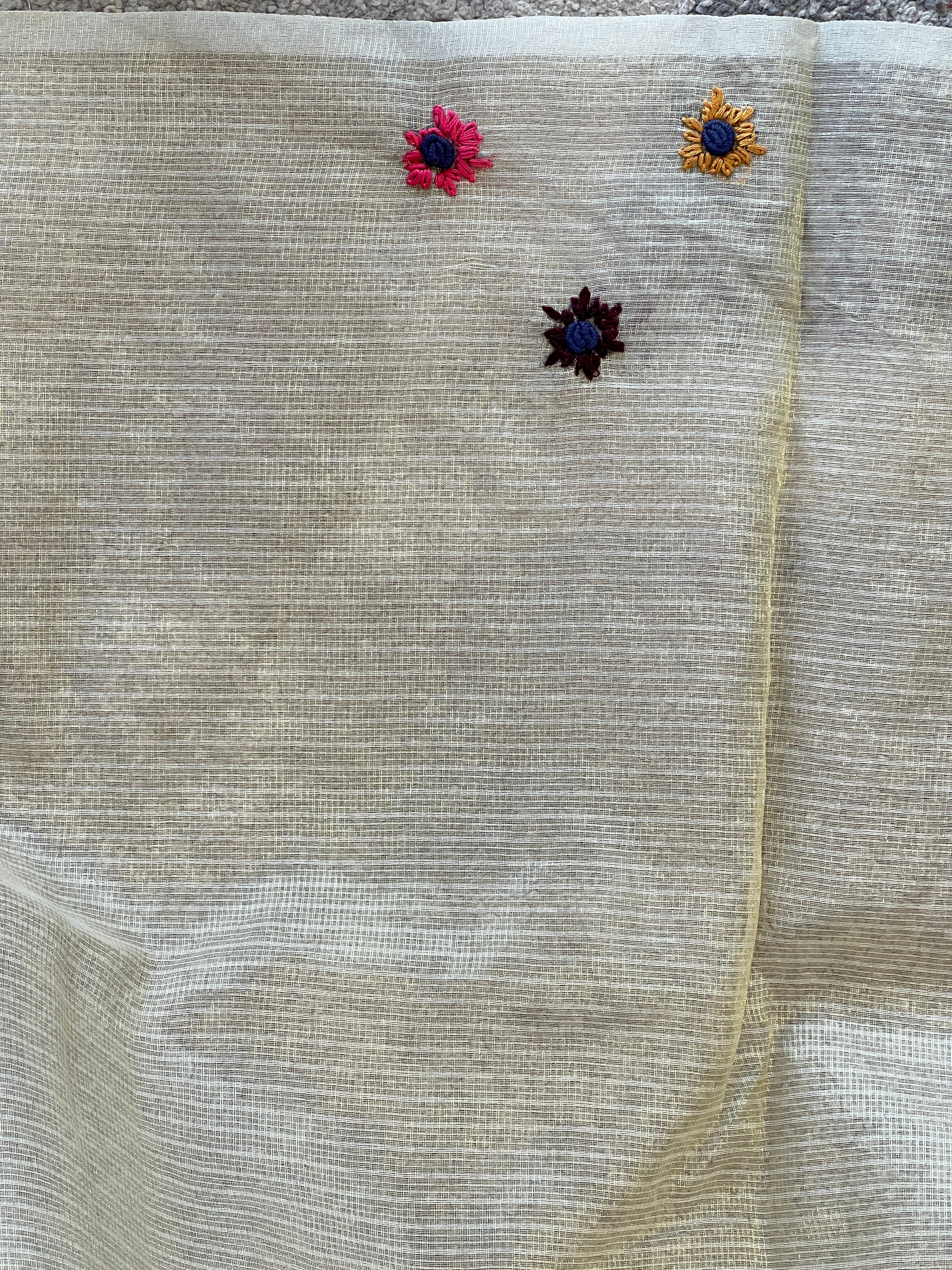 - Style: Banarasi, Hand Thread Embroidery Detailing, Multi-Color Floral Pattern, Golden Tissue Weaved Pallu, Tassels Knotted