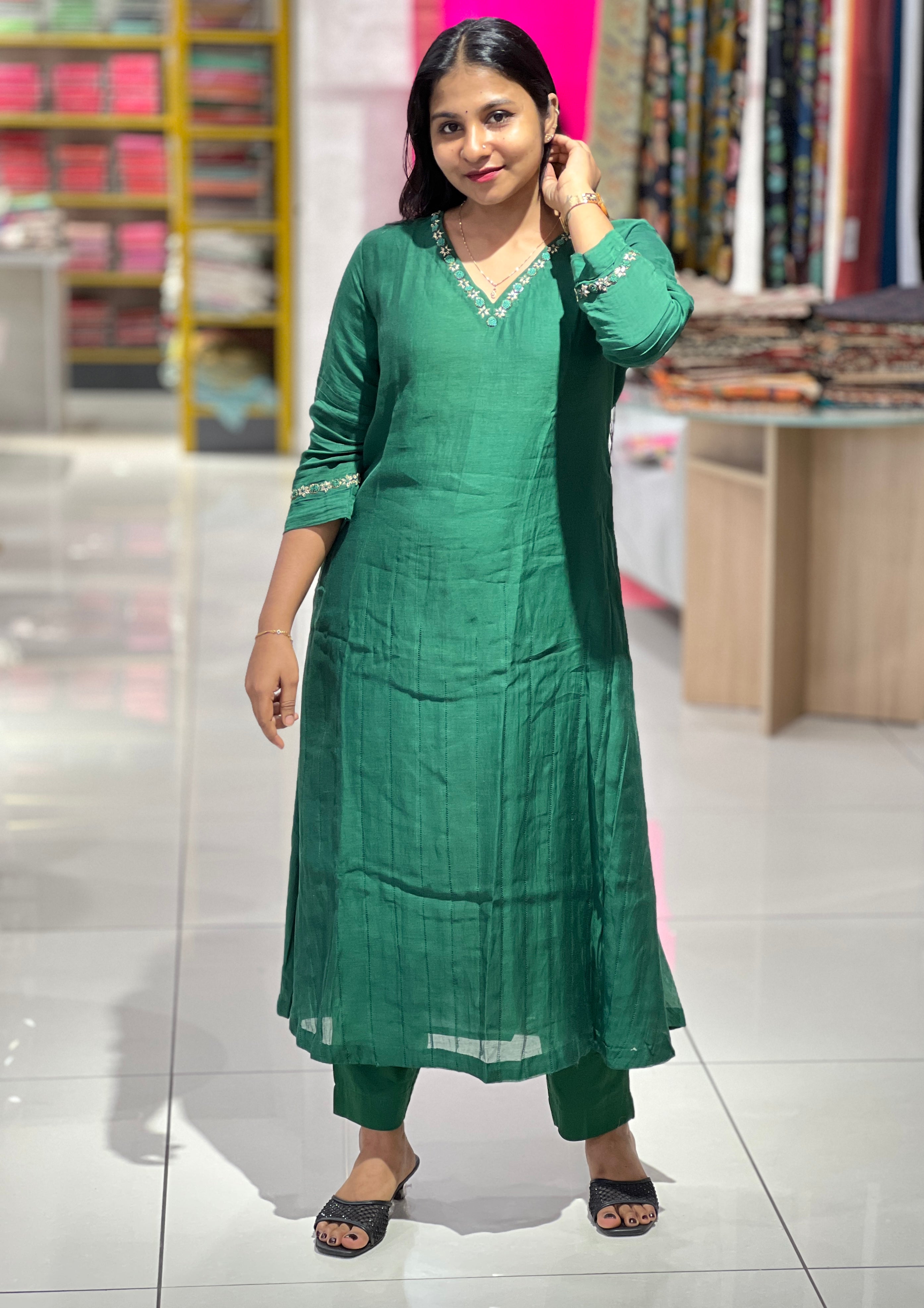 Floral Hand Embroidery Detailed Chanderi Kurta Top & Bottom | EC110