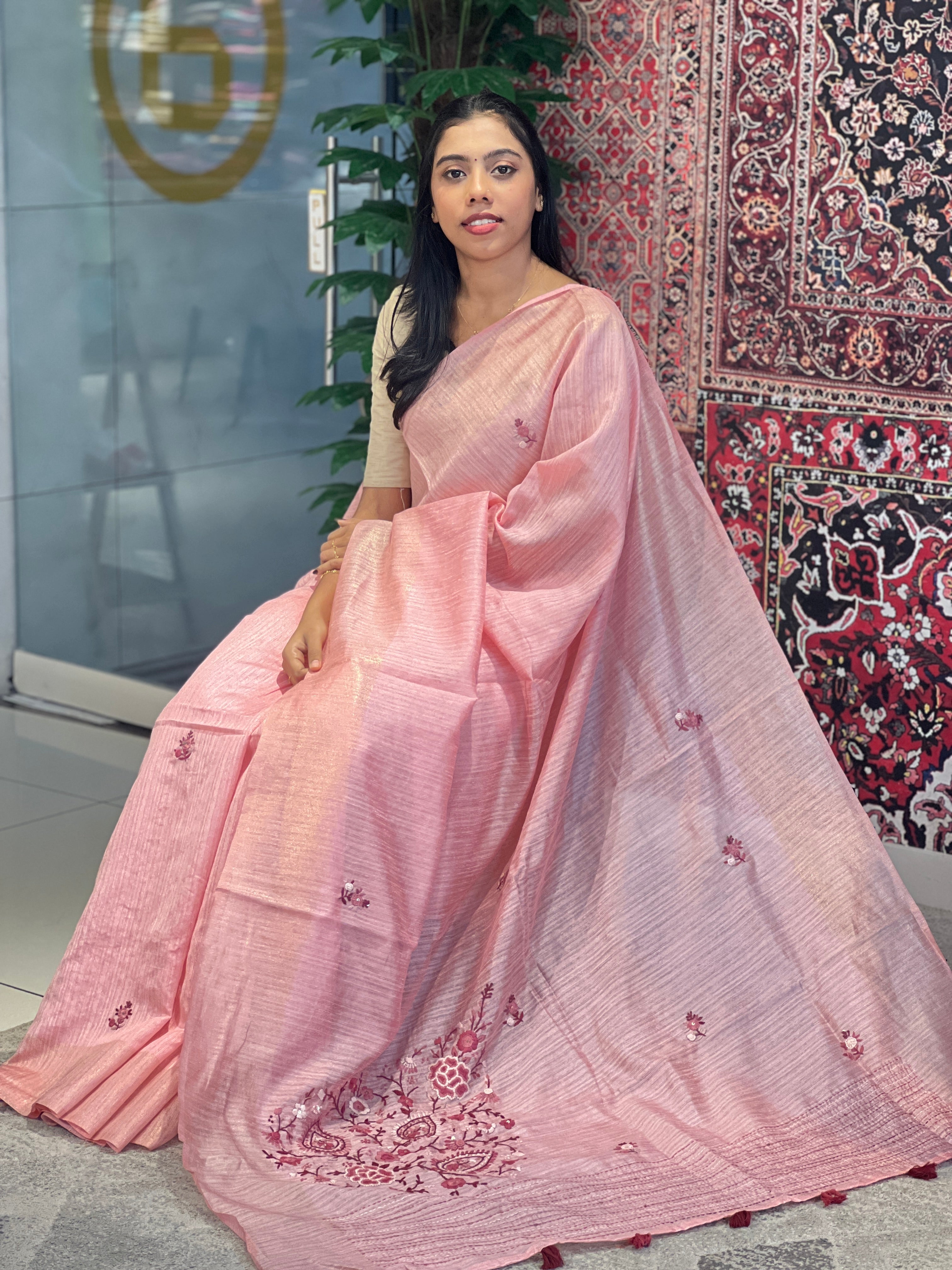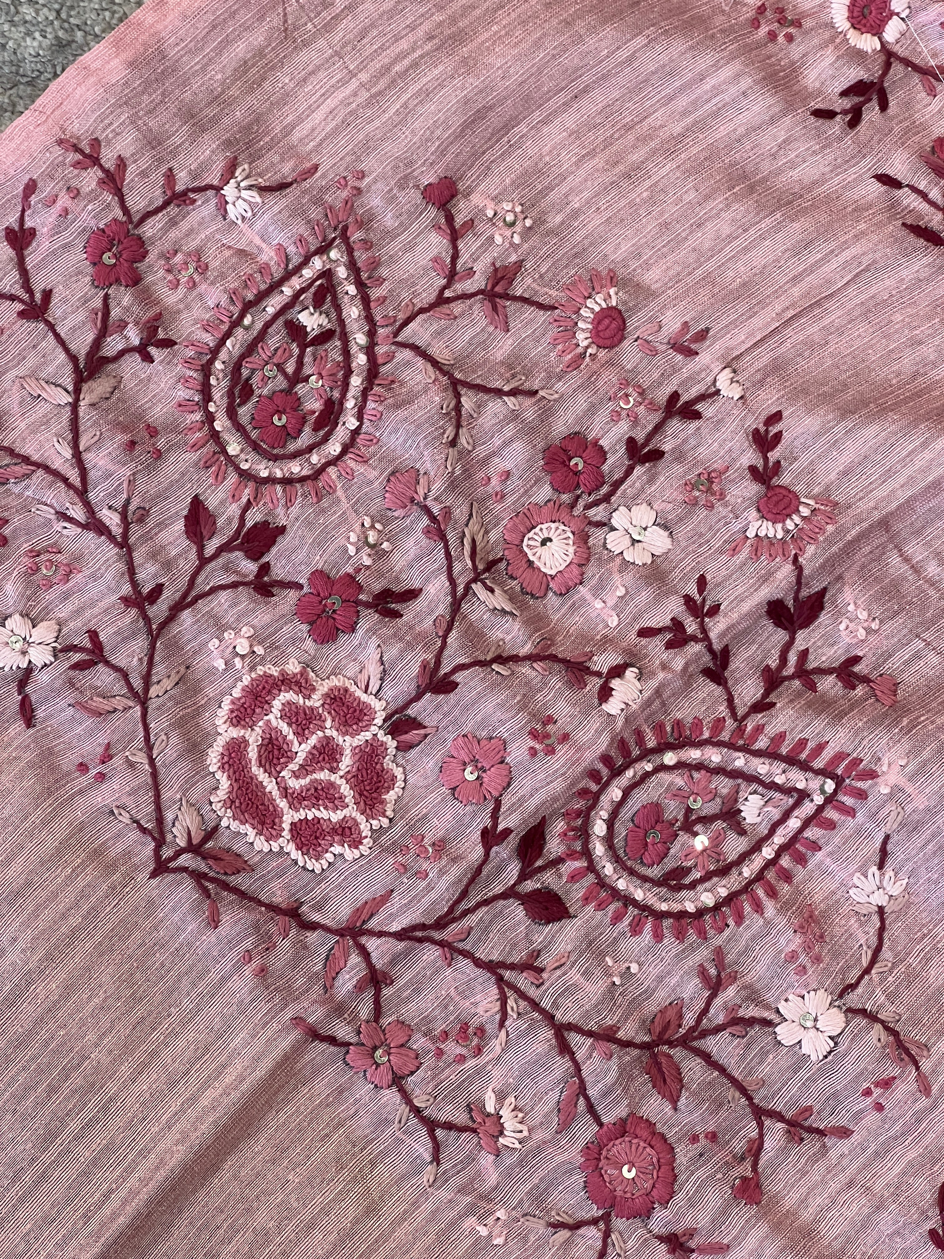 • Style: Scattered Embroidery Buta, Floral Hand Embroidery Detailed Pallu, Kantha With Sequence Highlighted Pallu, Tassels Attached
