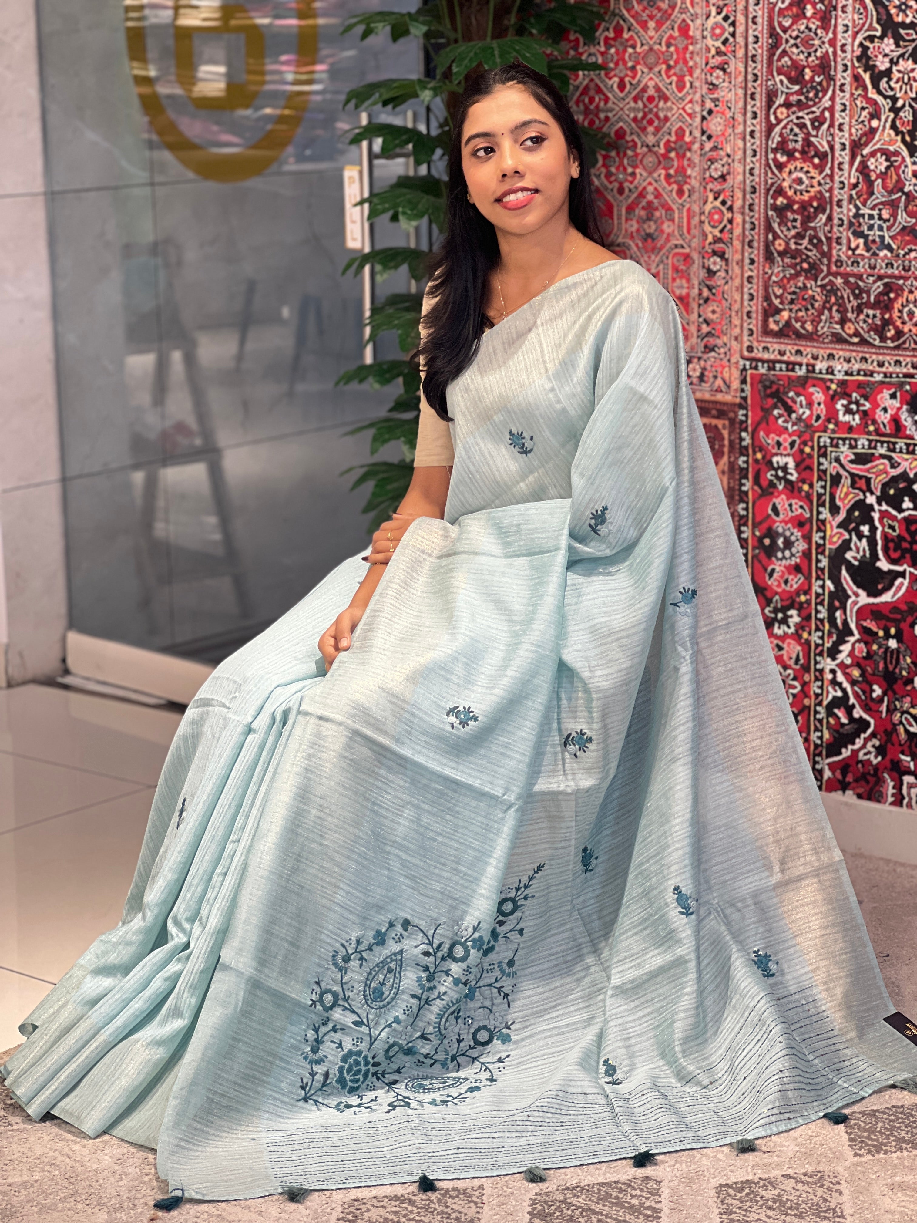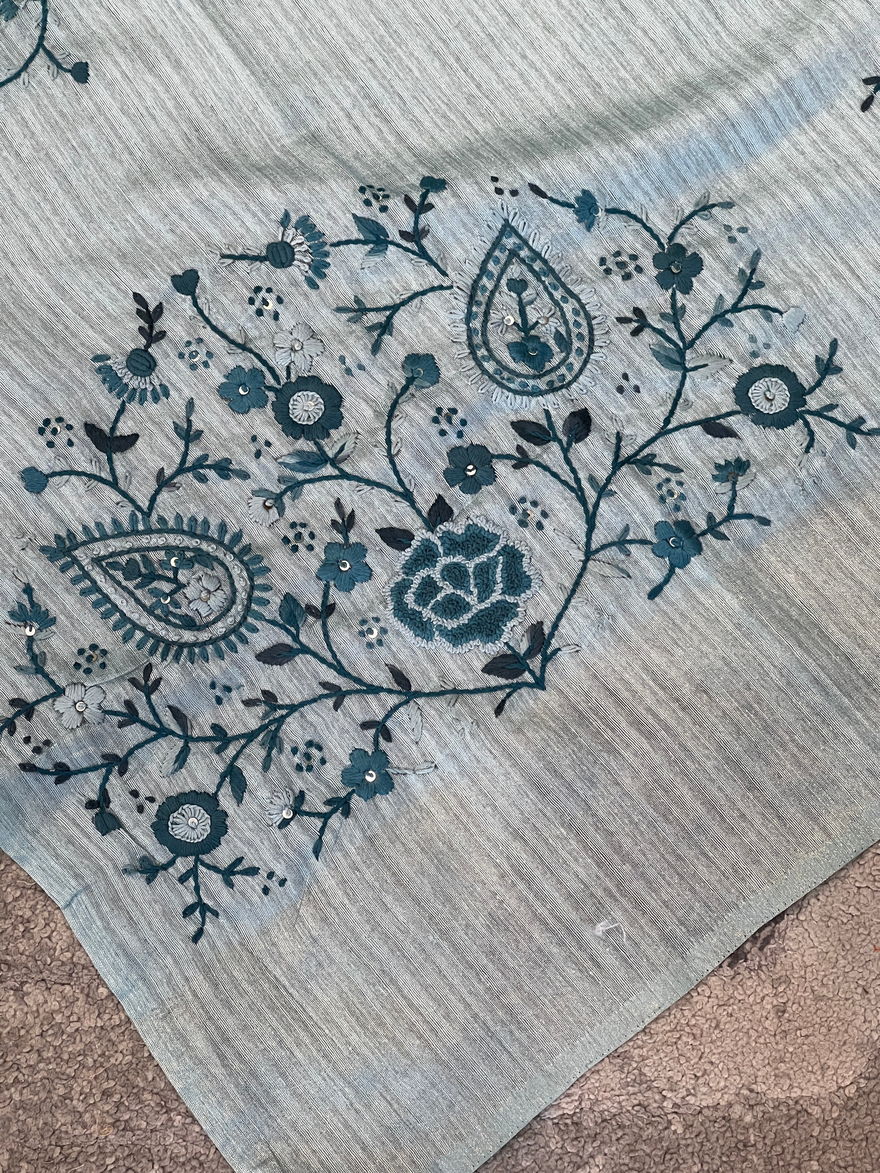 - Style: Scattered Embroidery Buta, Floral Hand Embroidery Detailed Pallu, Kantha With Sequence Highlighted Pallu, Tassels Attached