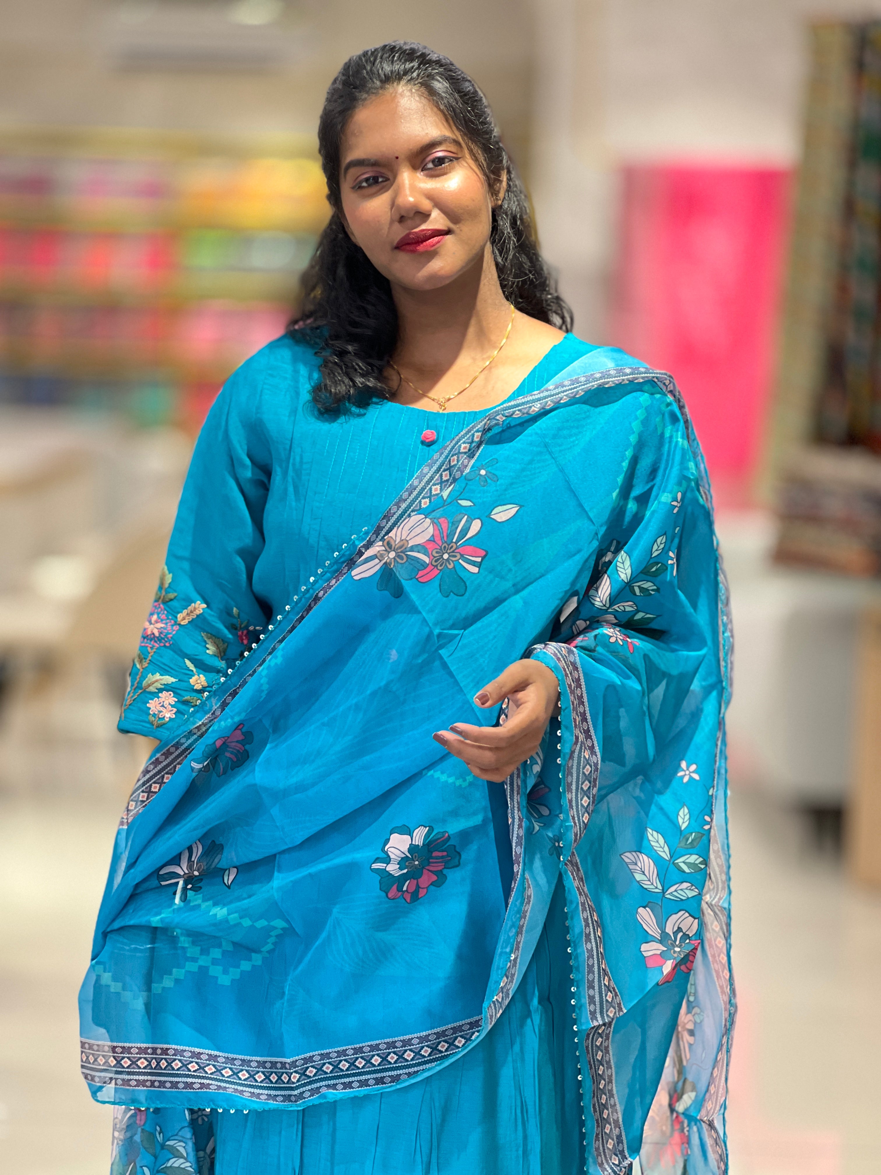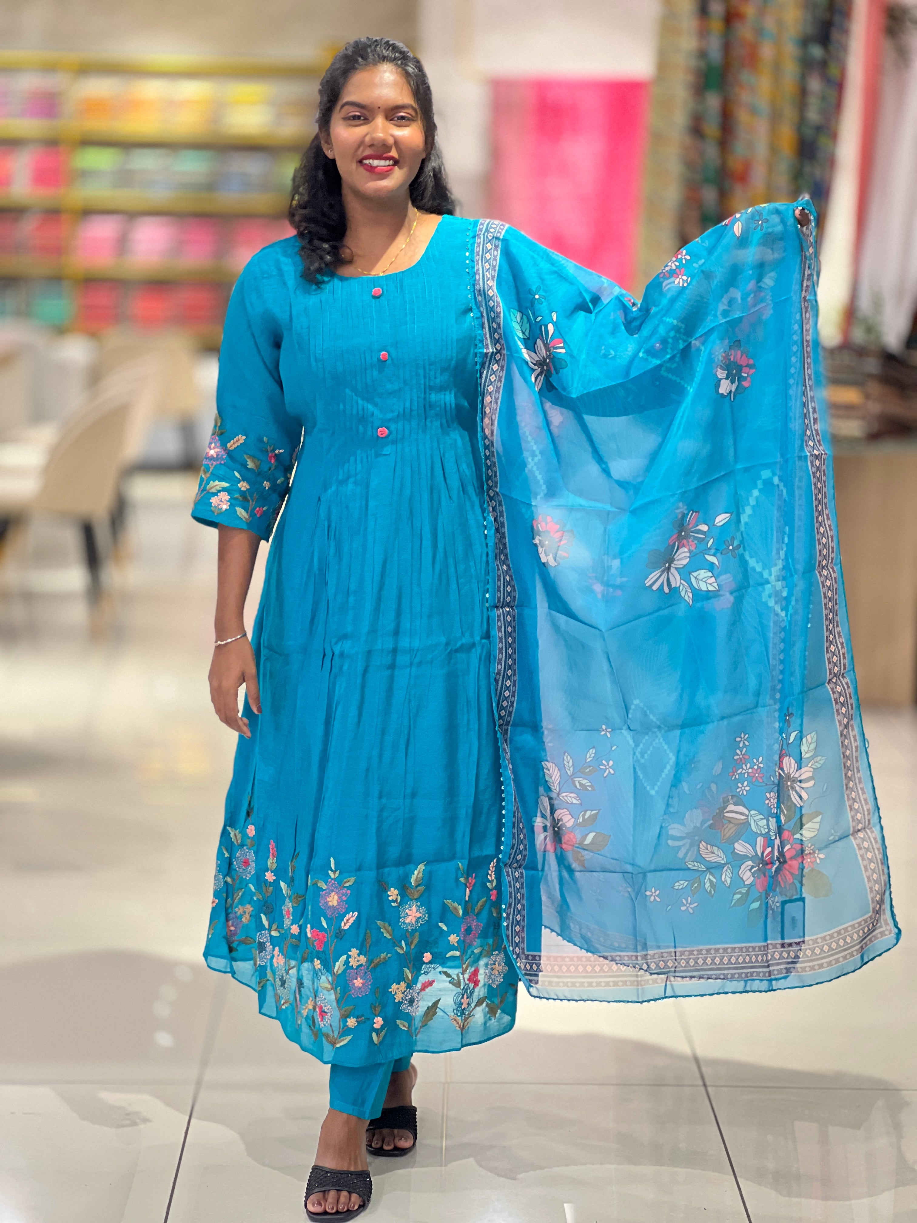- Style: Multi-Color Floral Hand Embroidery Detailed Sleeves & Lower Hem Portion, Pin Tuck Detailing With Button Detailed Yoke Portion, With Lining, A-Line Pattern