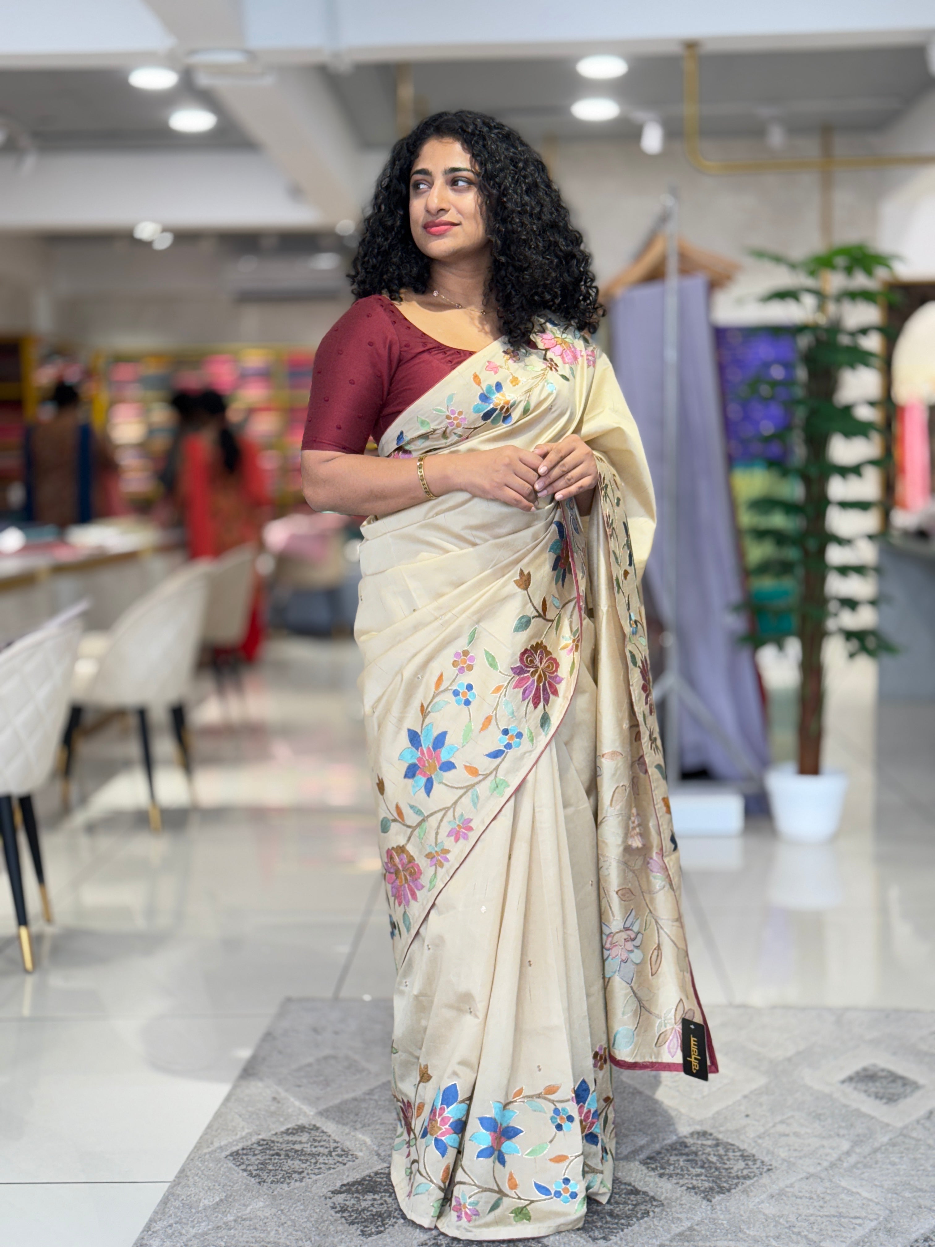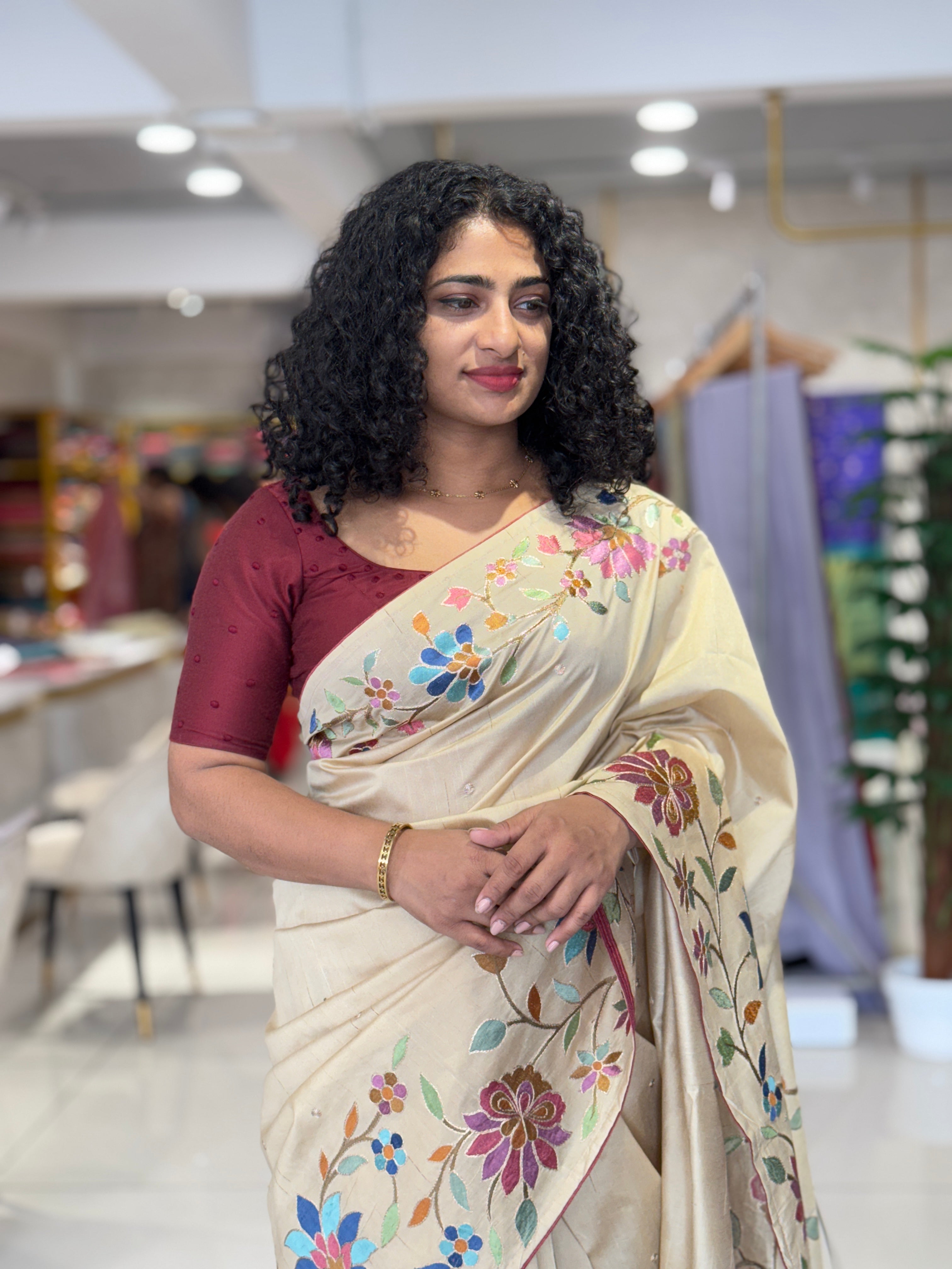 - Style: Multi - Color Floral Jaal Embroidery Detailing With Zari Highlight, Scattered Zari Woven Butas, Flat Facing Edges