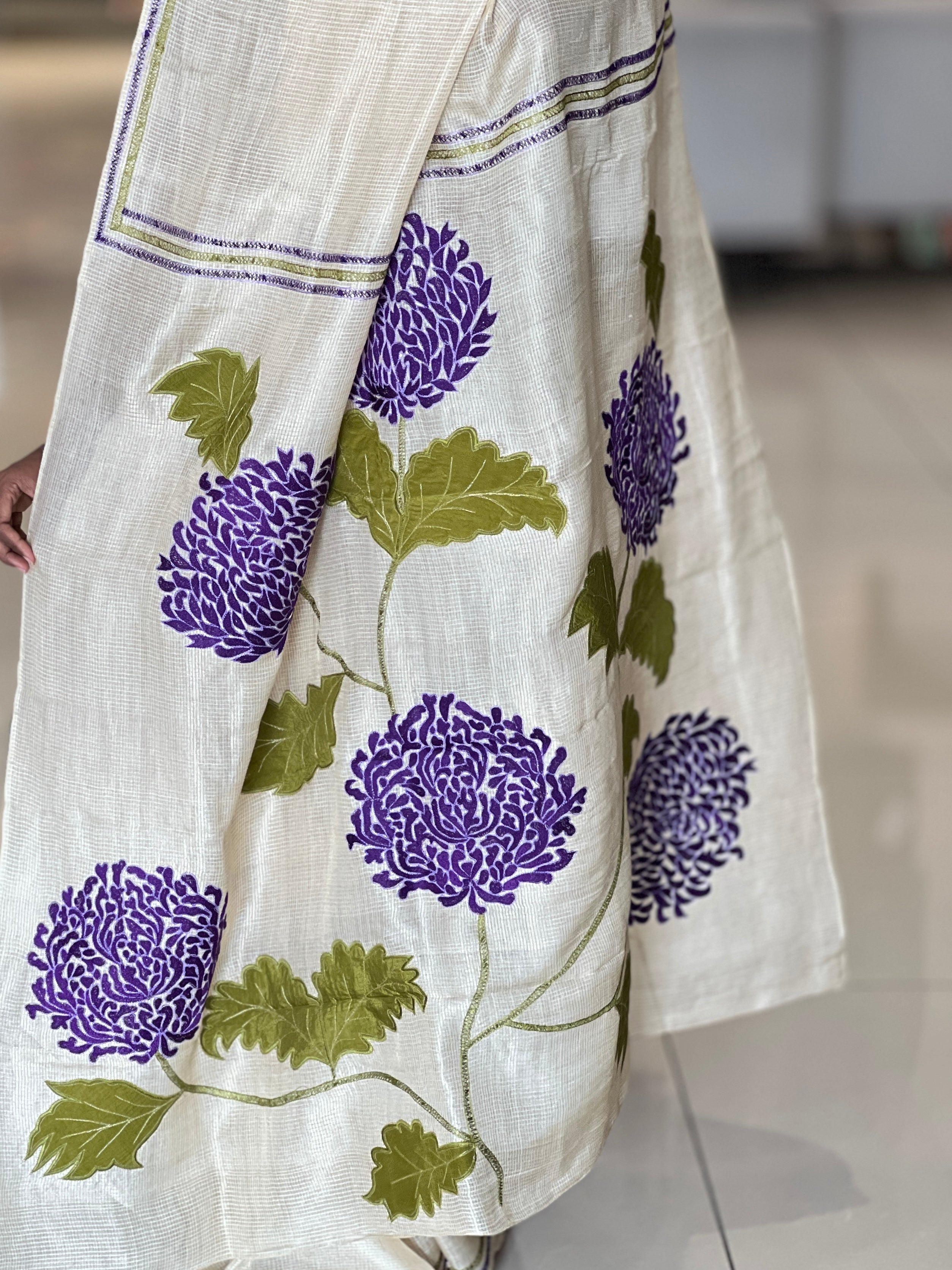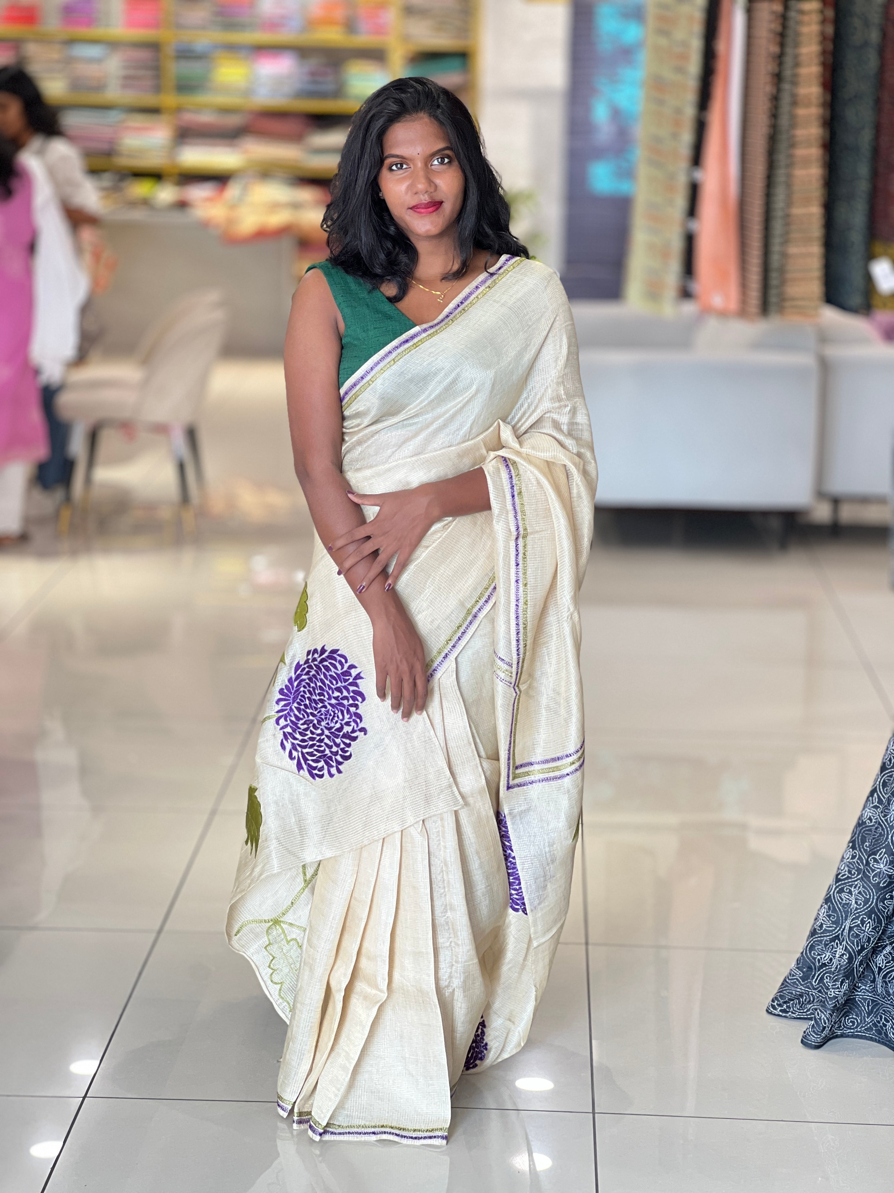 - Style: Check Weaving Pattern, Floral & Leaf Applique Detailed Pallu, Cross Patterned Embroidery Detailed Borders