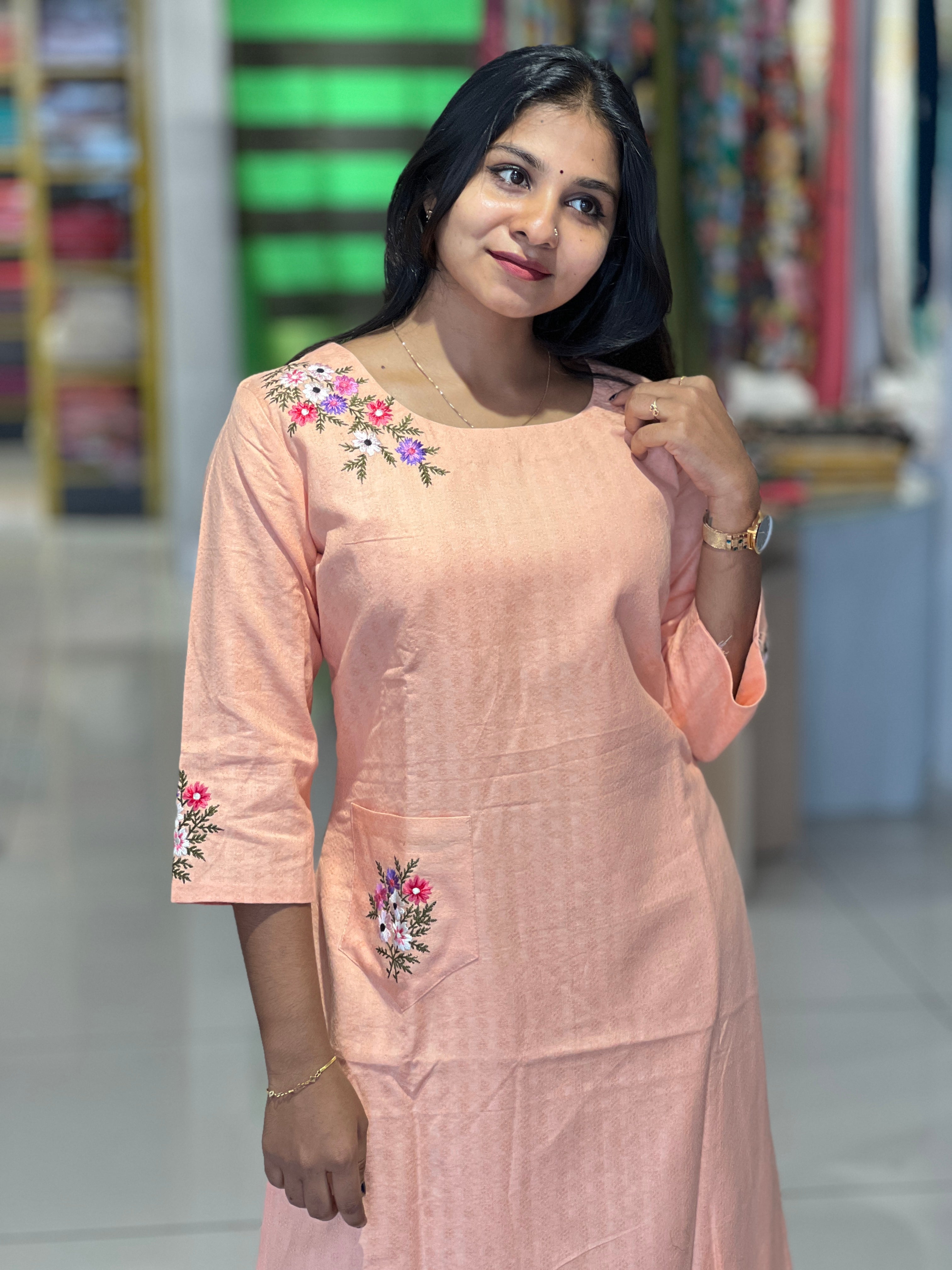 - Style: Floral Machine Embroidery Detailing, With Pockets