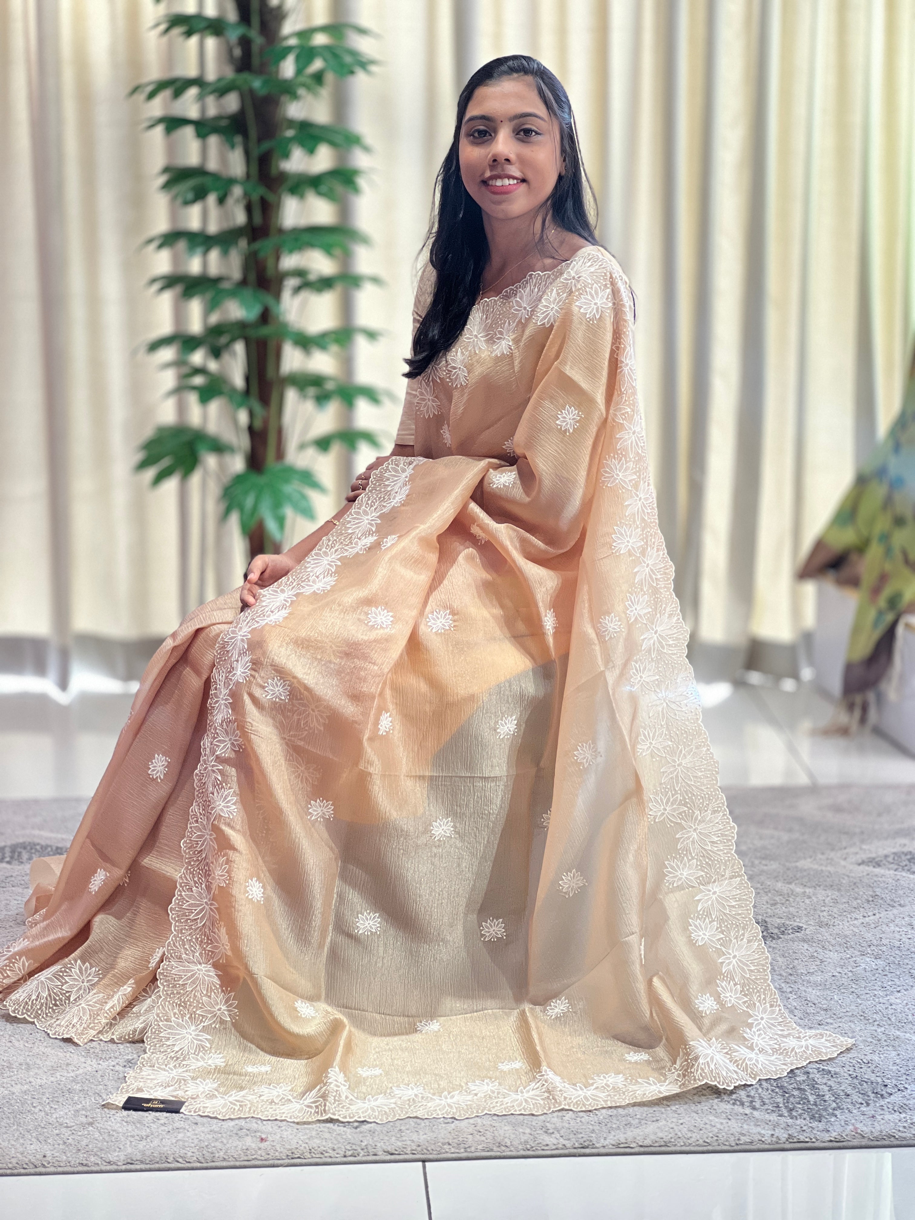 - Style: Machine Embroidery, Scattered Floral Embroidery Pattern, Floral Patterned Borders, Uneven Scallop Edges