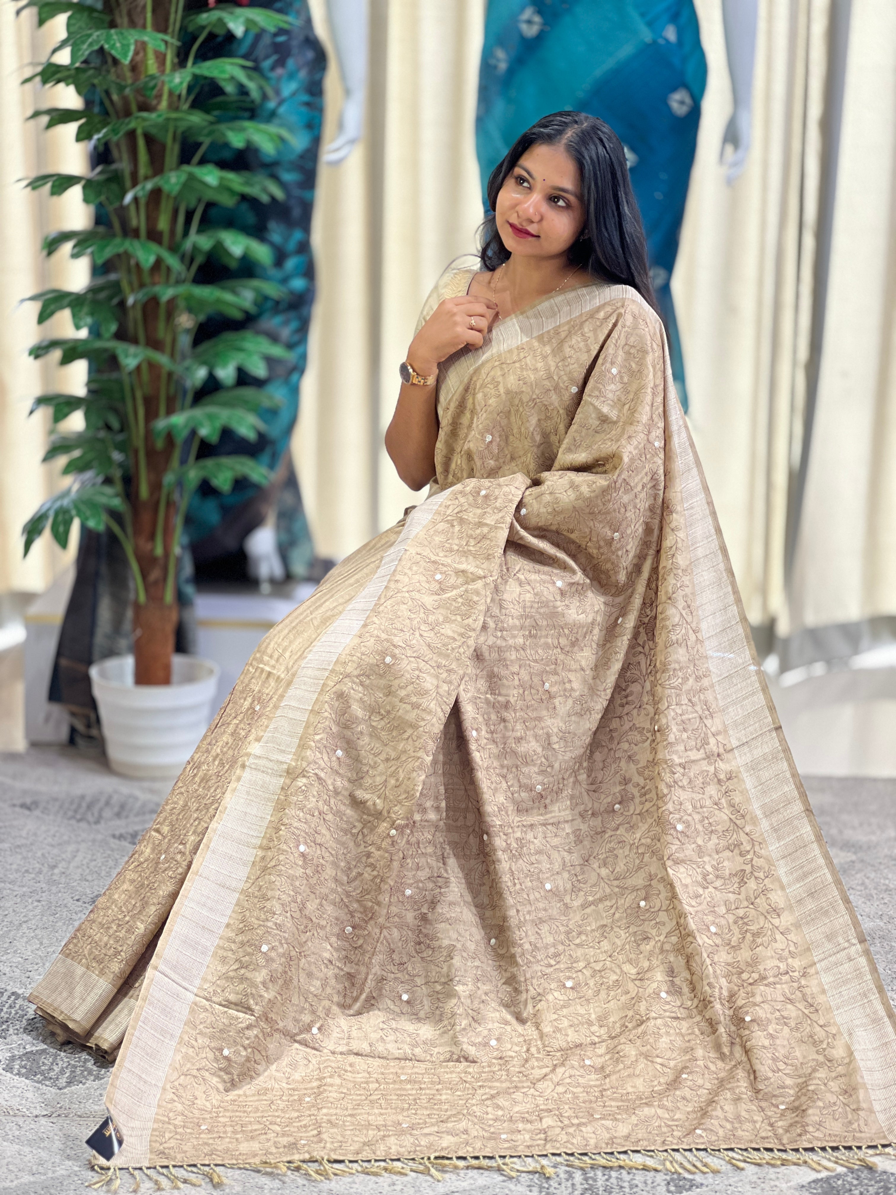 - Style: Floral Machine Embroidery Pattern, Machine Kantha Border Detailing, Tassels Detailing
