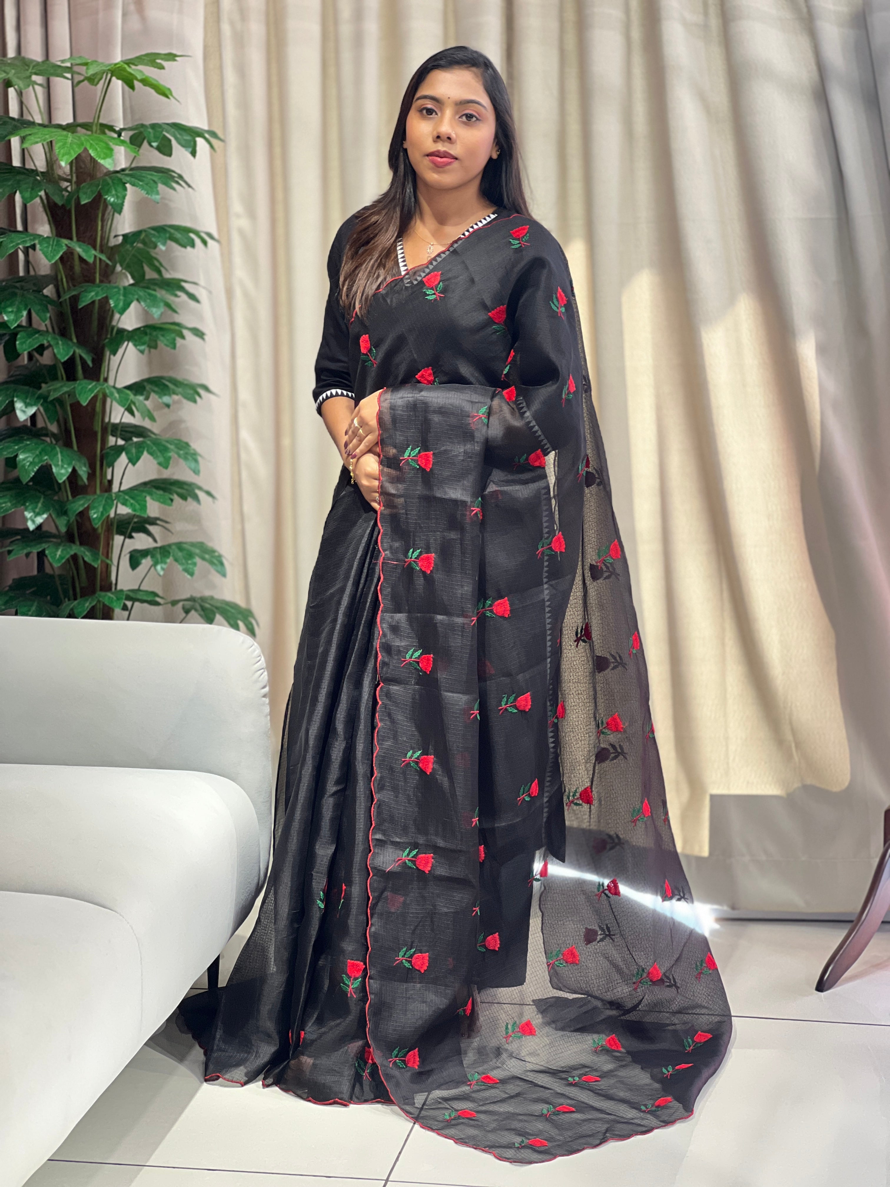 • Floral Machine Embroidery Detailed Silky Kota Saree | HT350