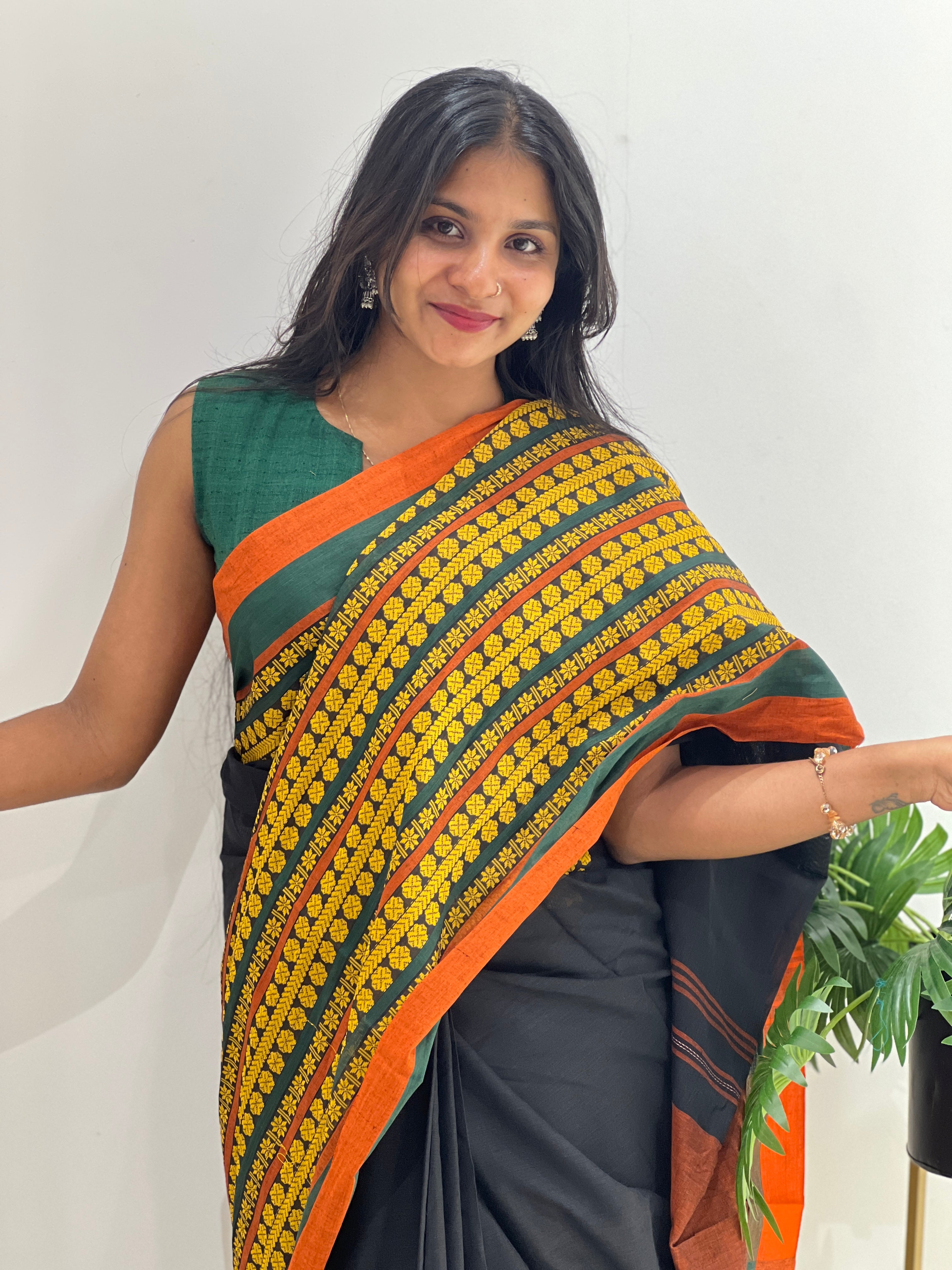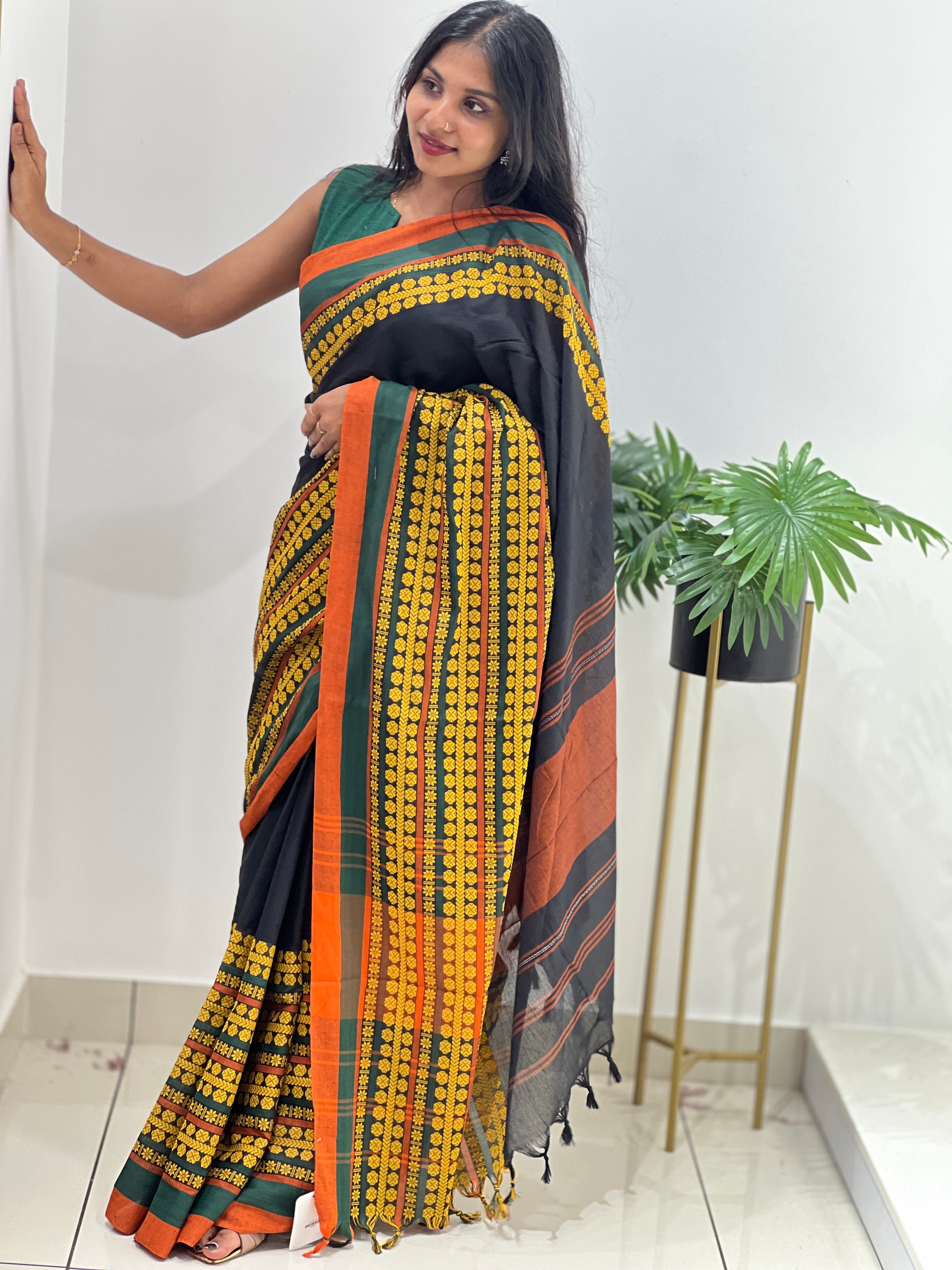 - Style: Broad Lower Border, Floral & Line Patterned Border, Stripe Patterned Pallu, Self Tassels Detailing, Double Border Detailing