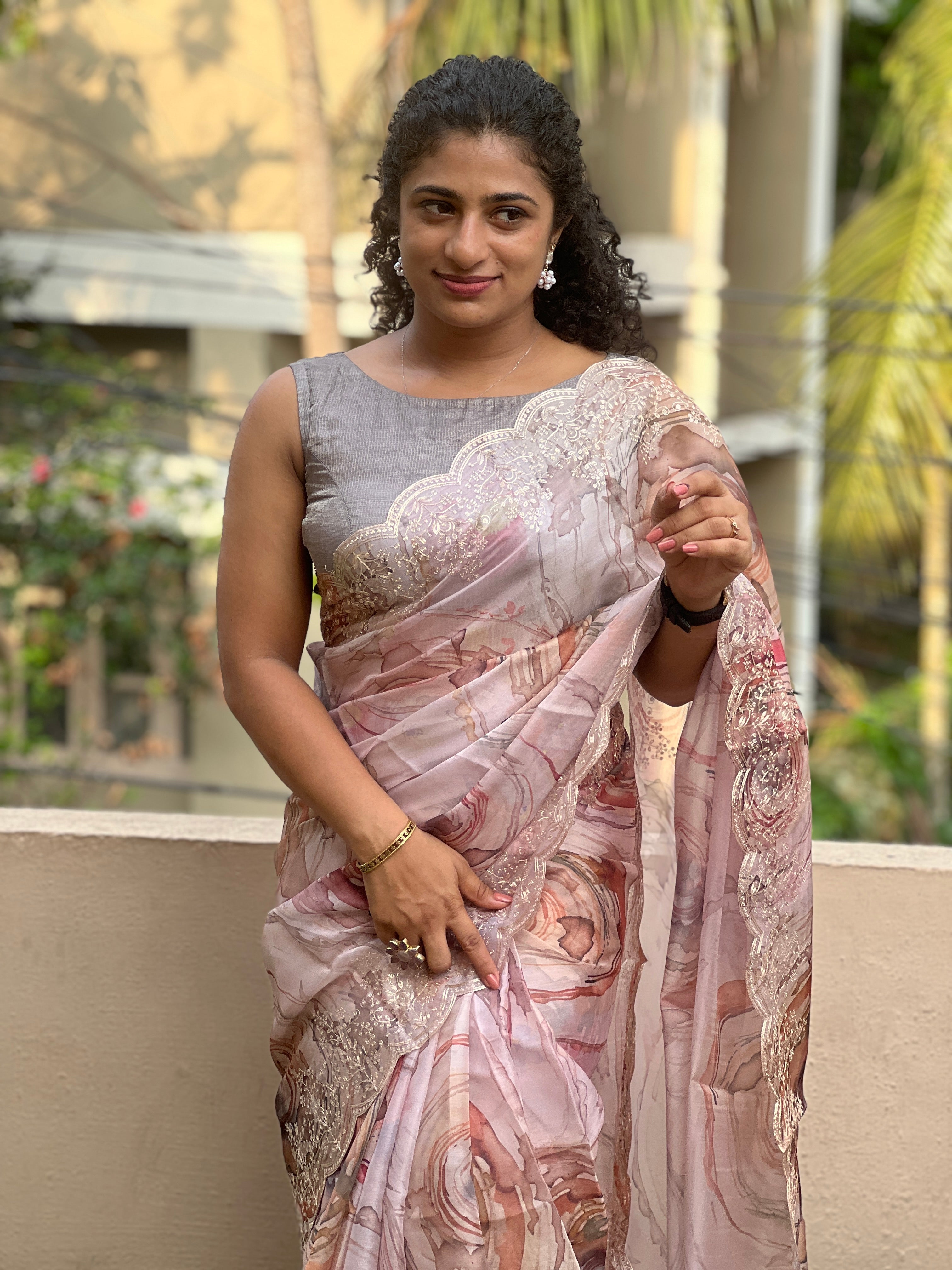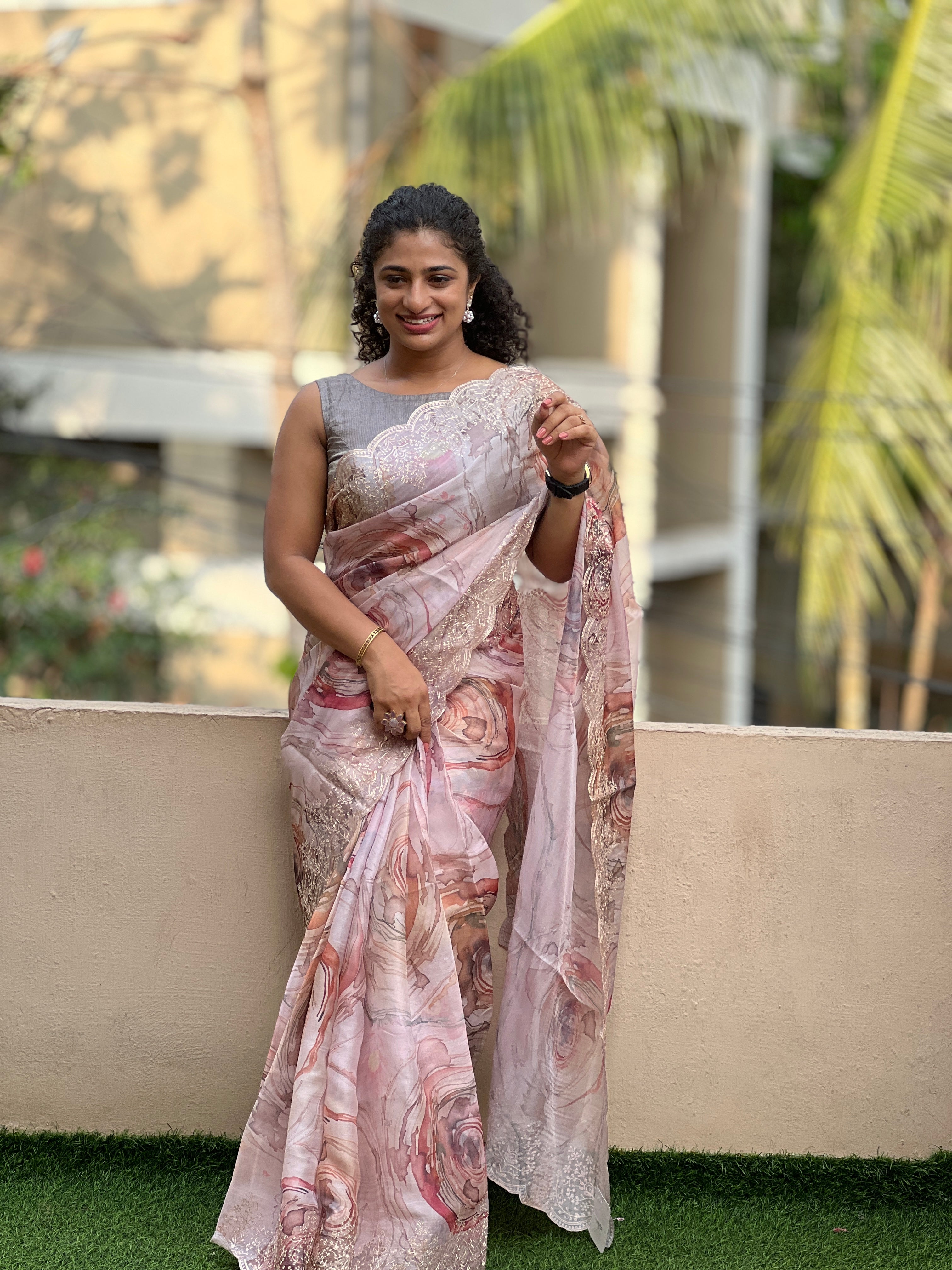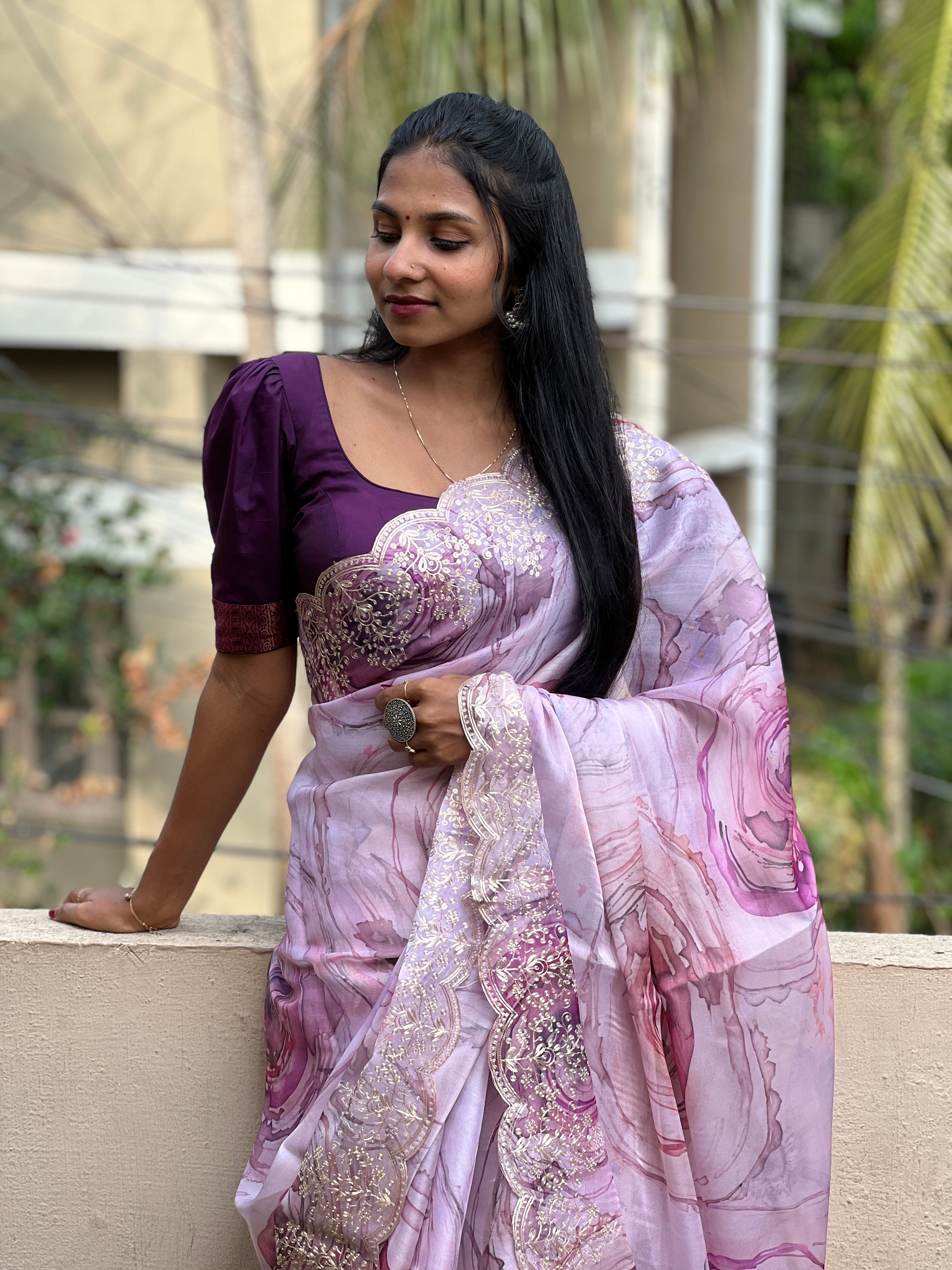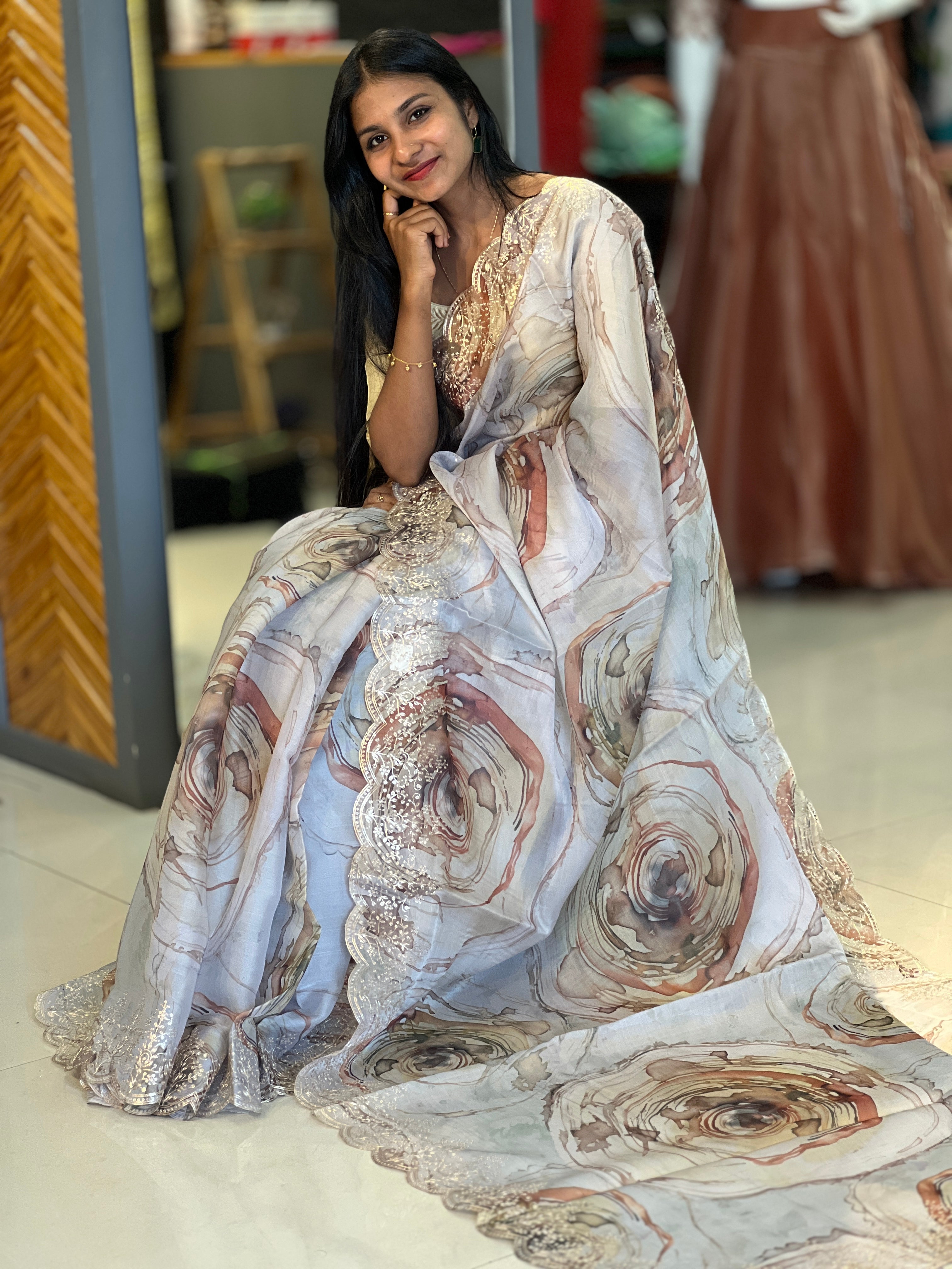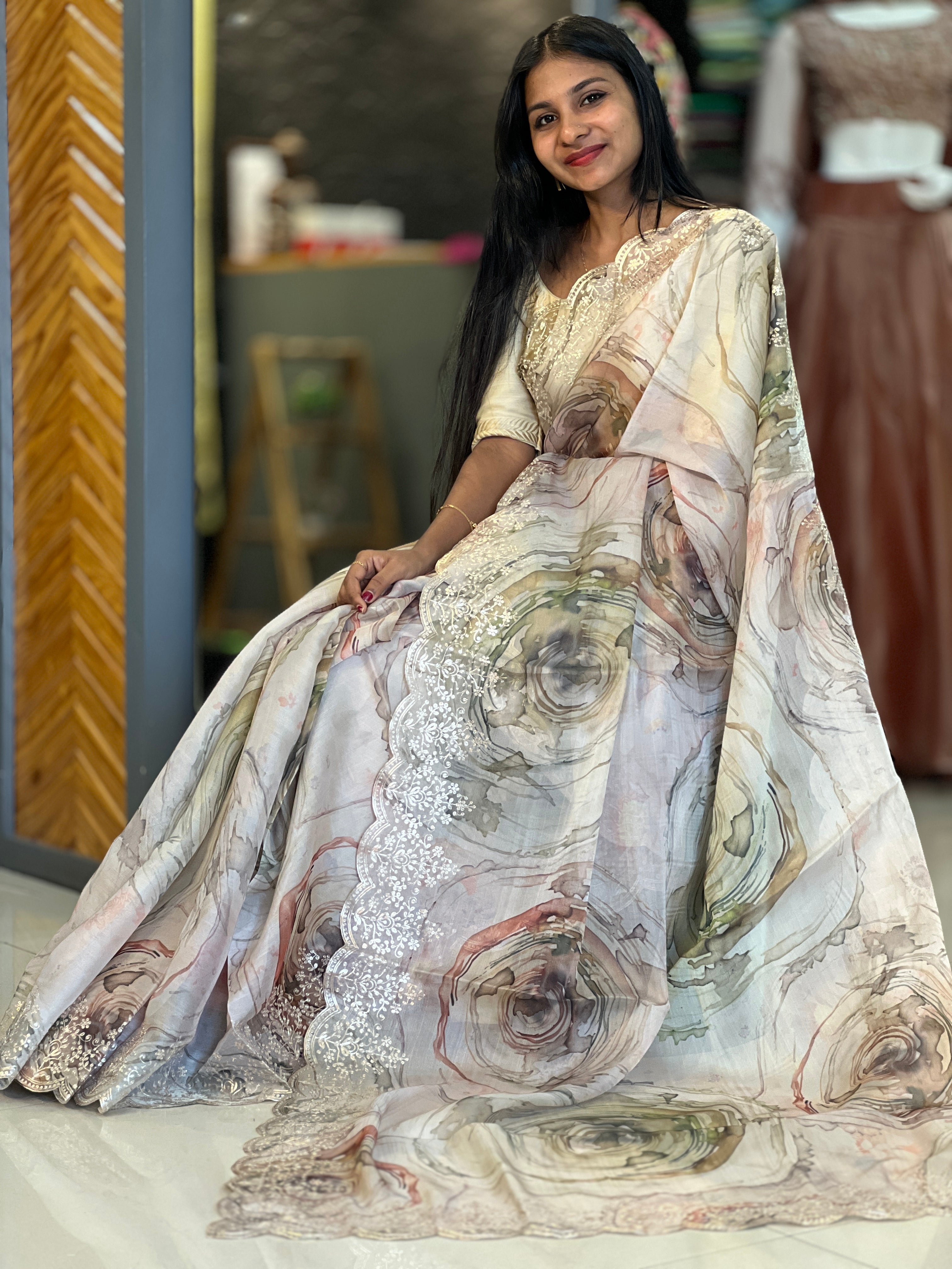- Style: Sublimation Printed, Zari Border Pattern Scallop Edge