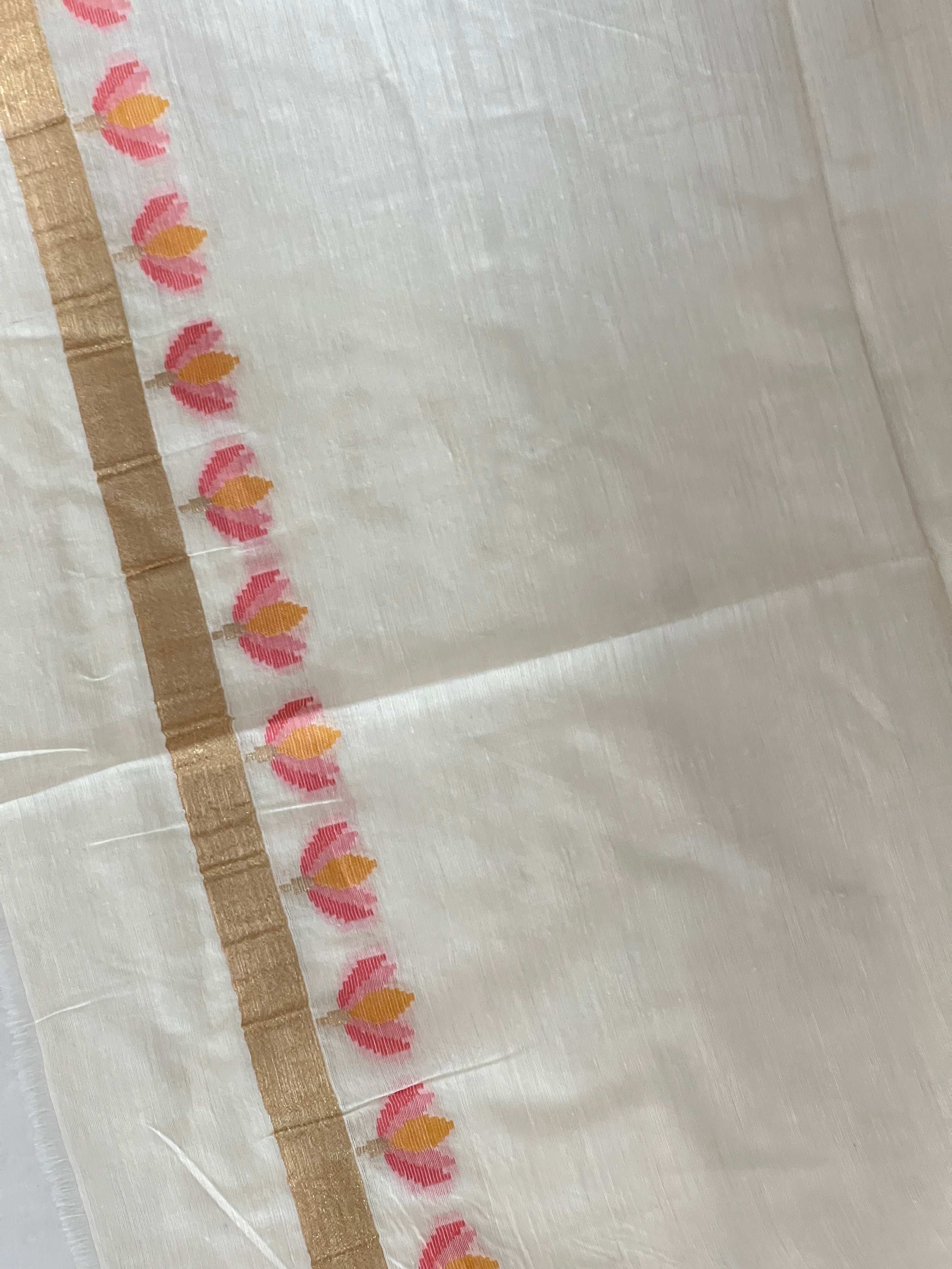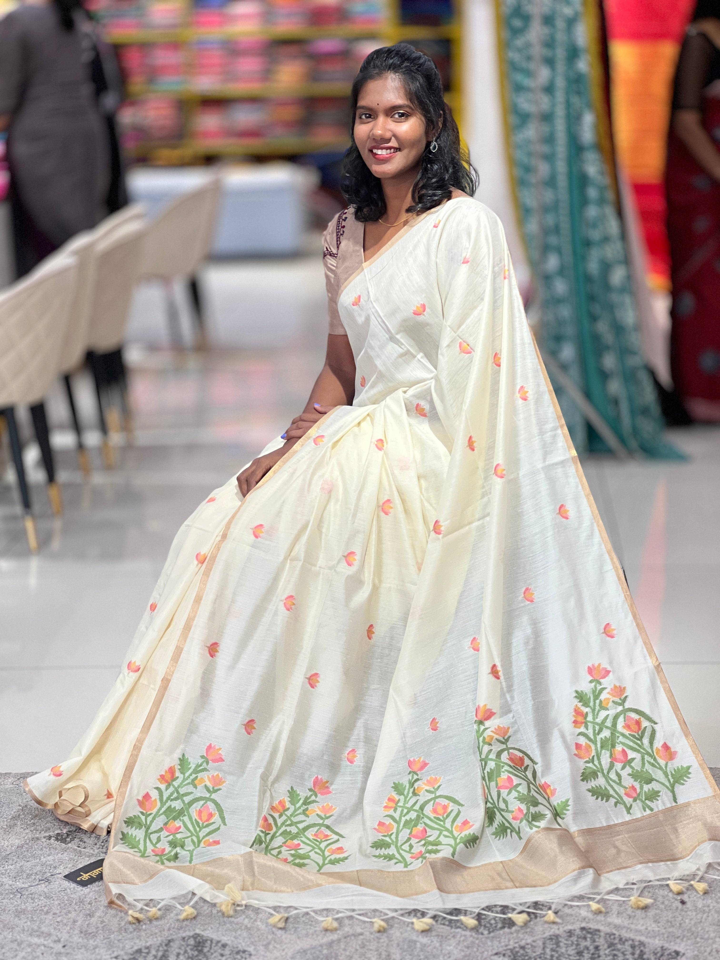- Style: Jamdani Style, Scattered Floral Buta Detailing, Floral Patterned Pallu, Zari Borders, Tassels Attached