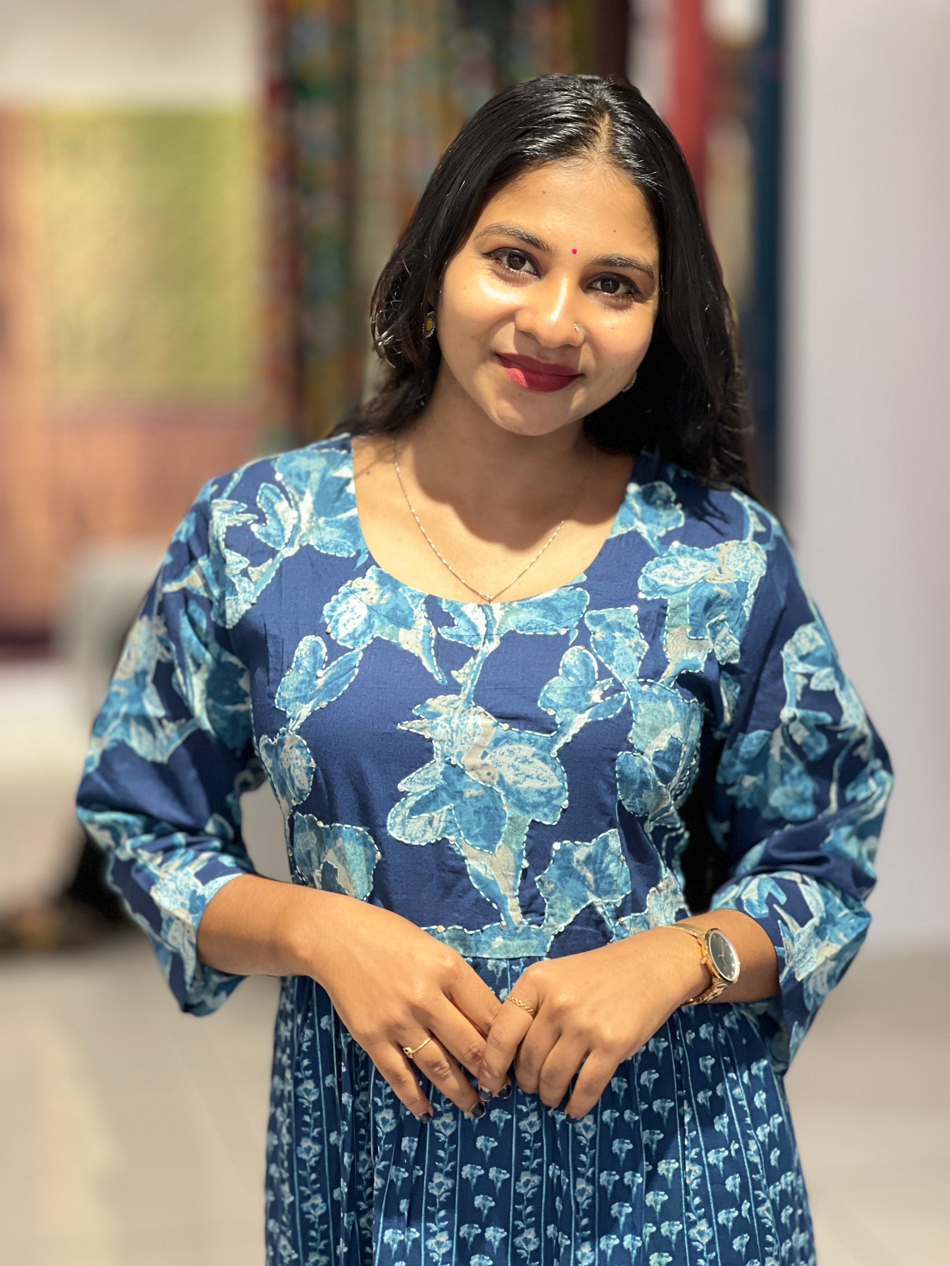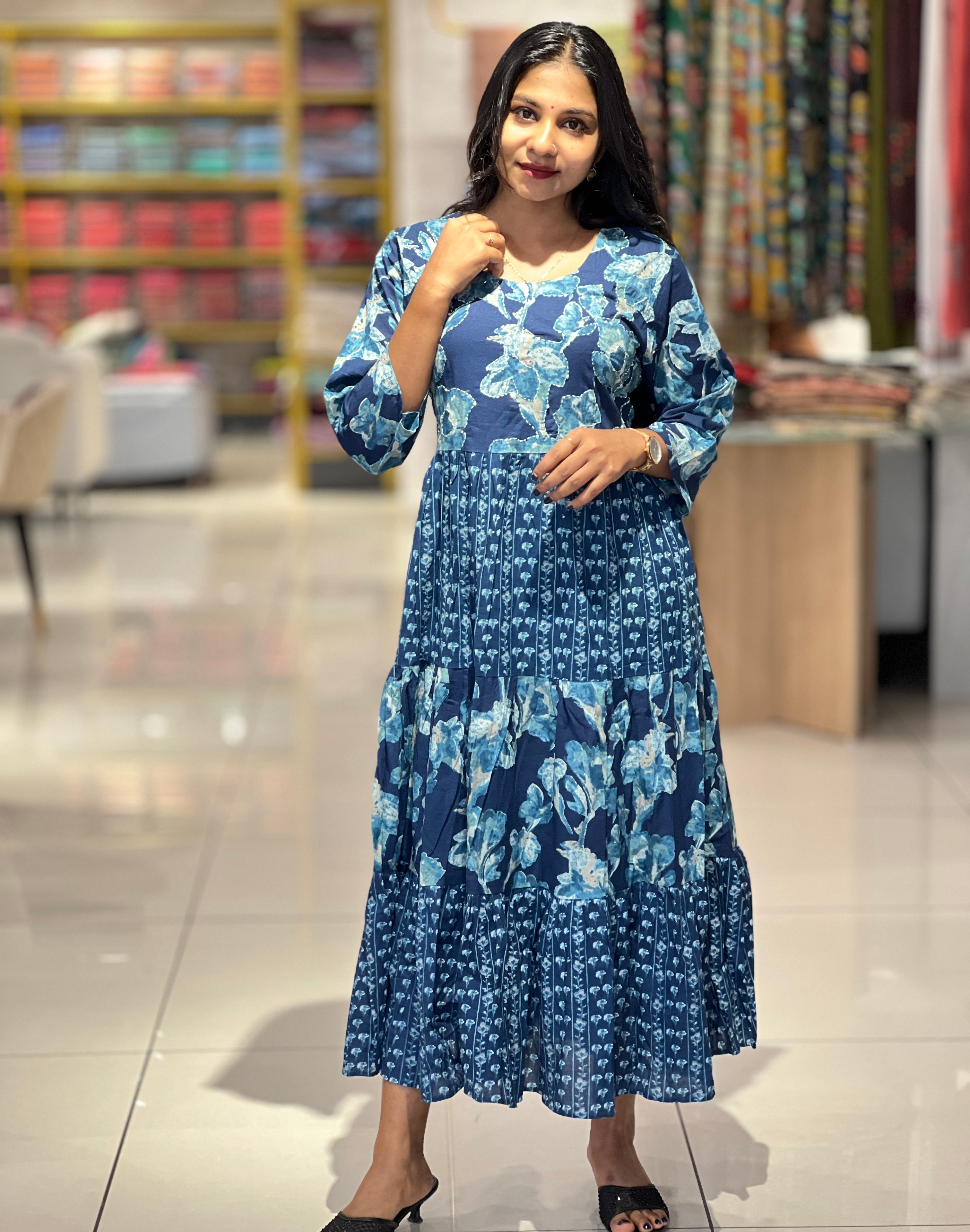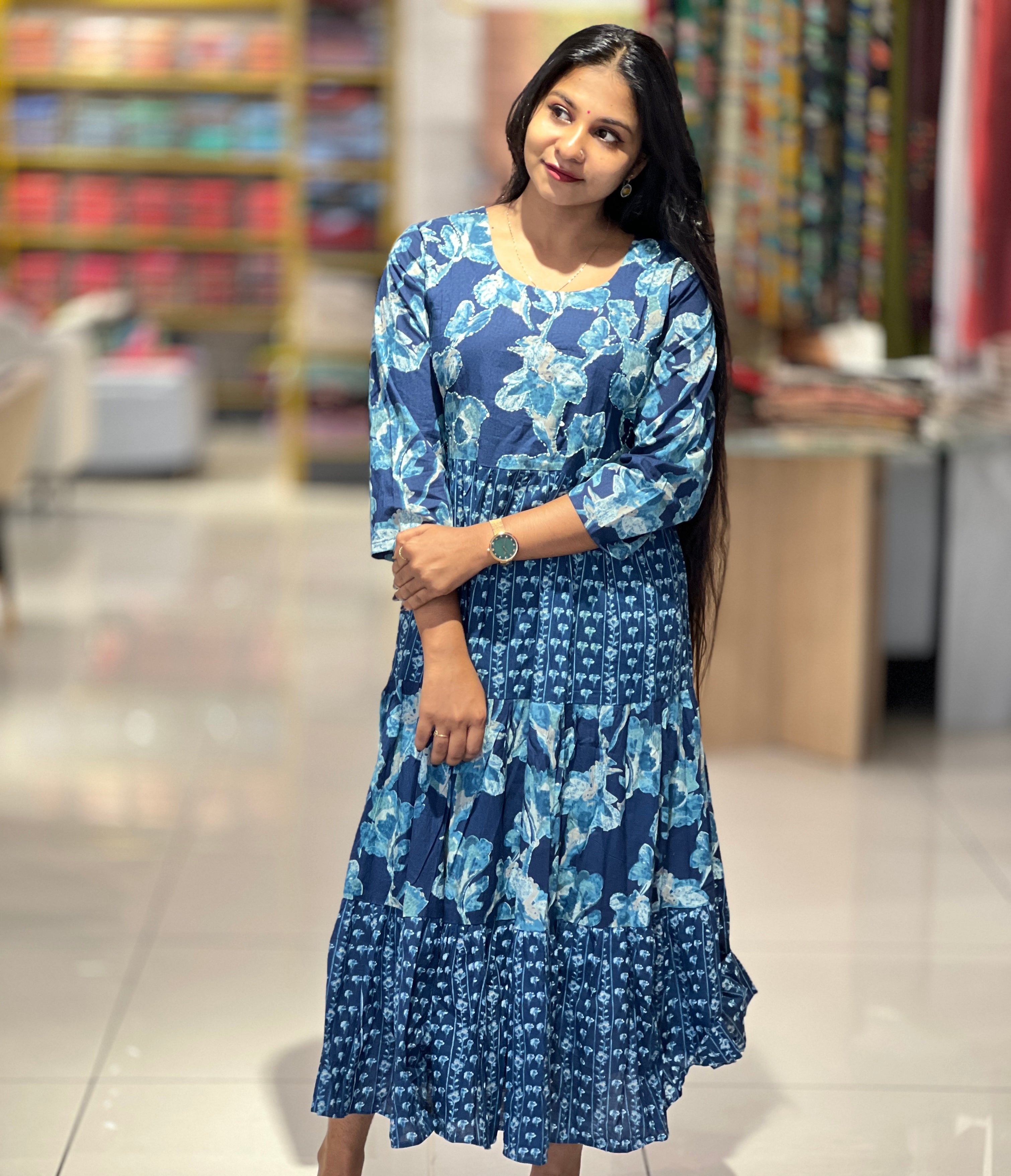 - Style: Floral Printed, Kantha Embroidery Highlighted Yoke & Neck, , A-Line Pattern, Gathering Detailing,