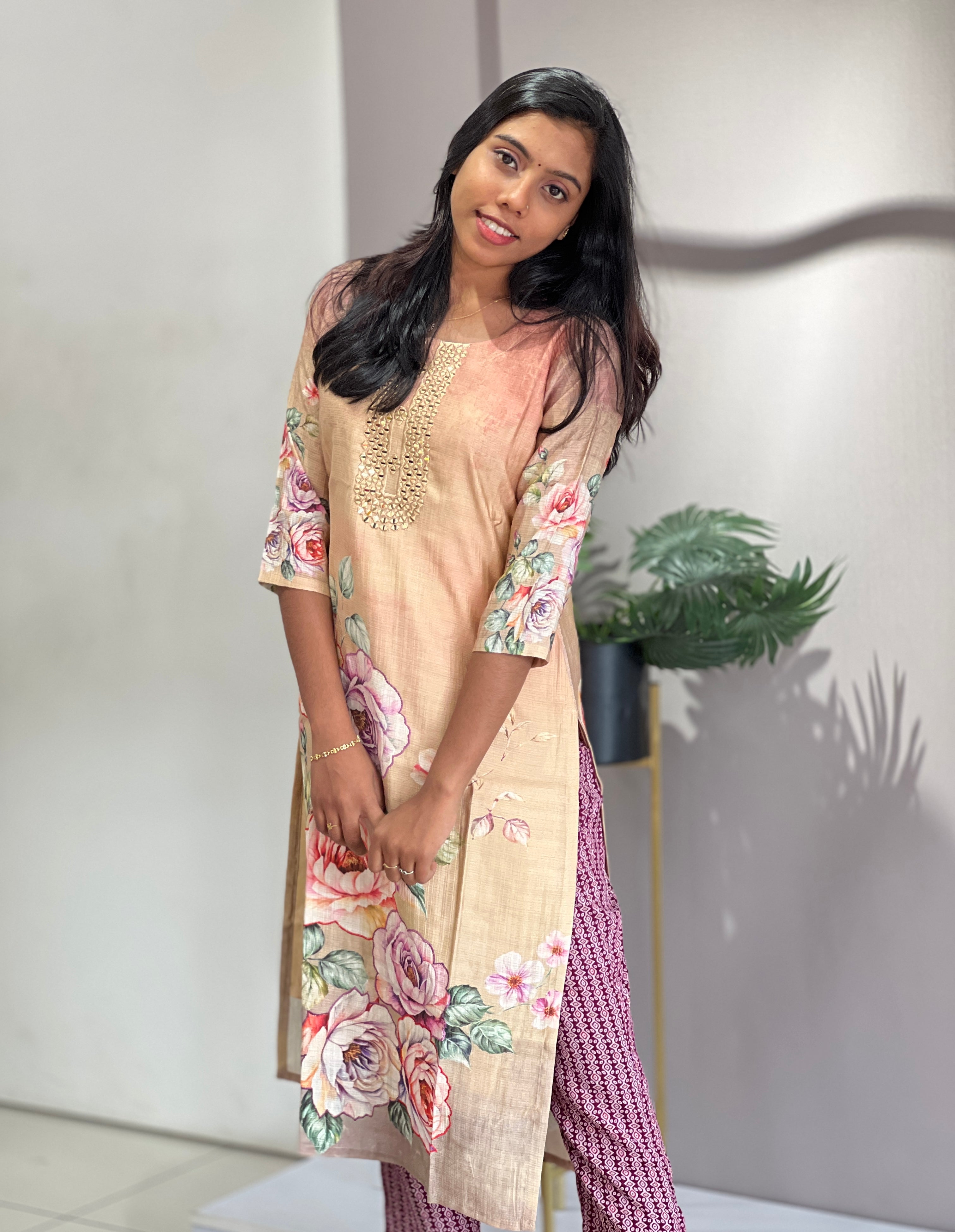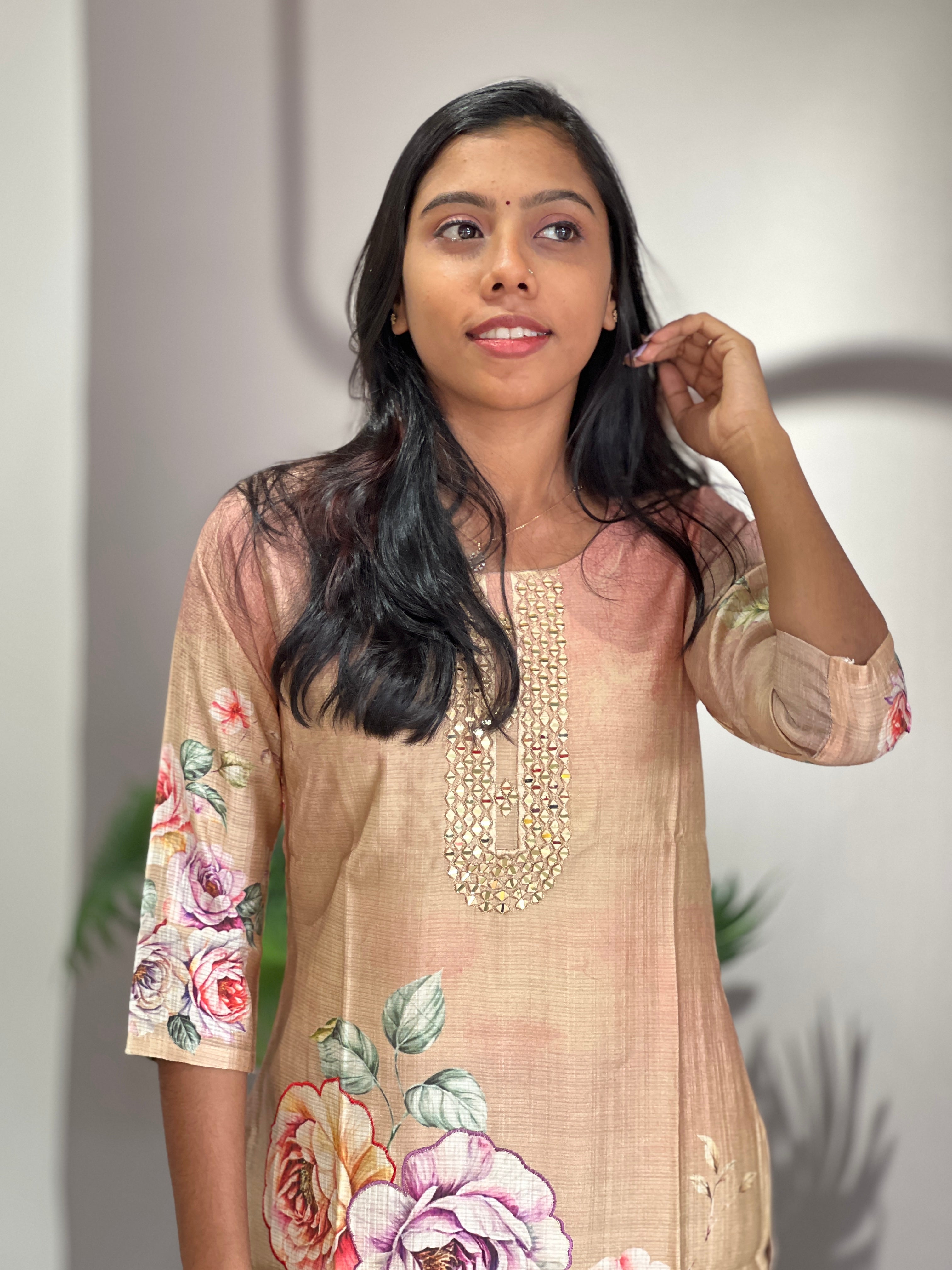 - Style: Mirror Work Detailed Neck Portion, Floral Print With Embroidery Highlight, Side Slited Pattern, With Lining