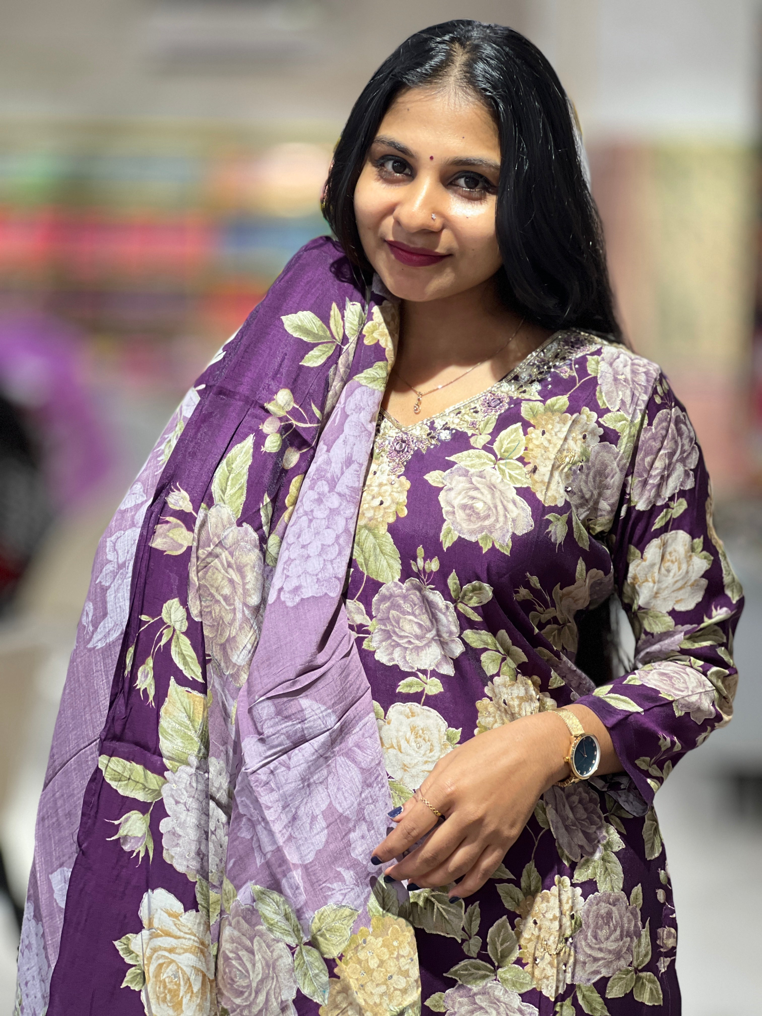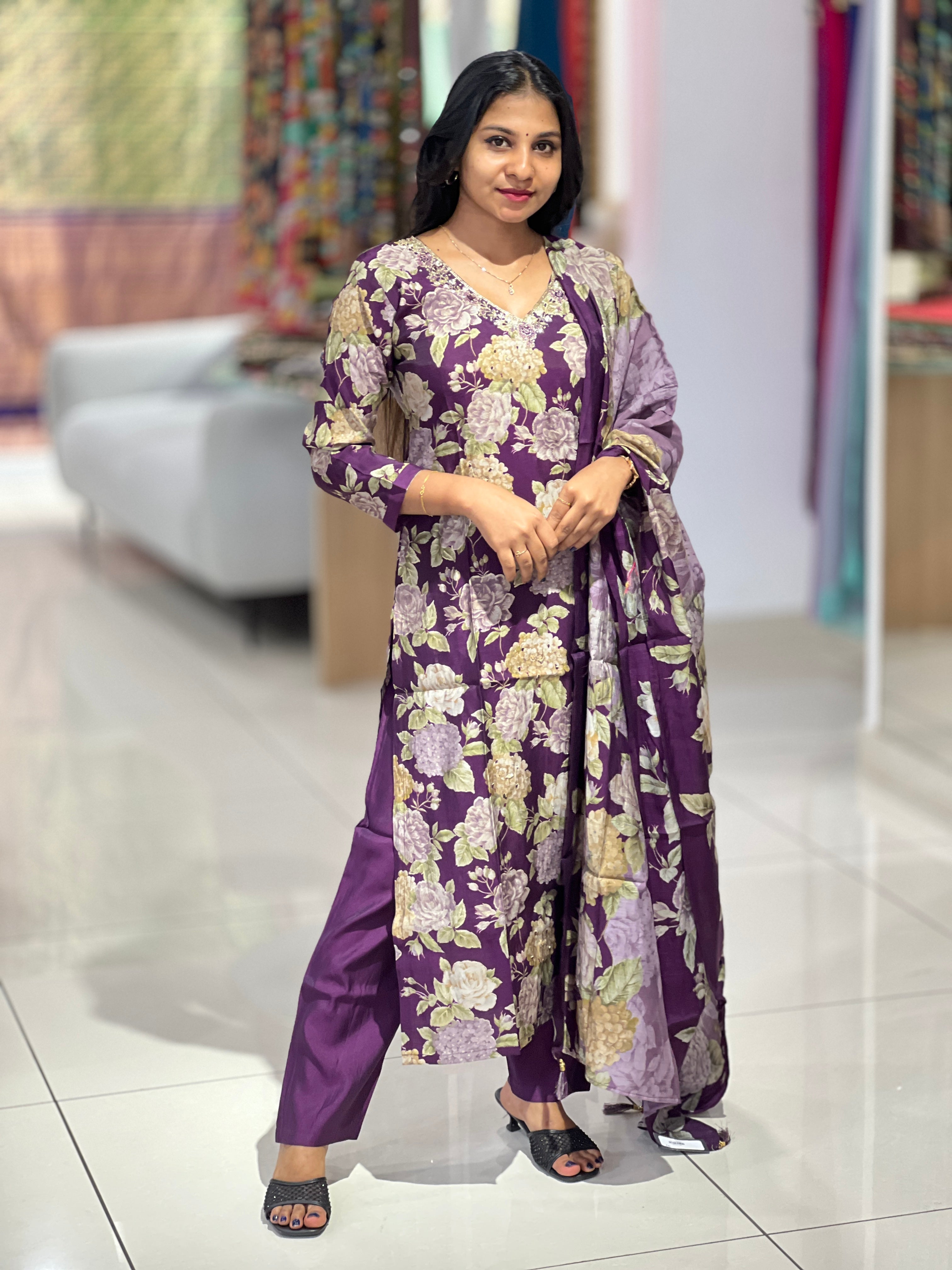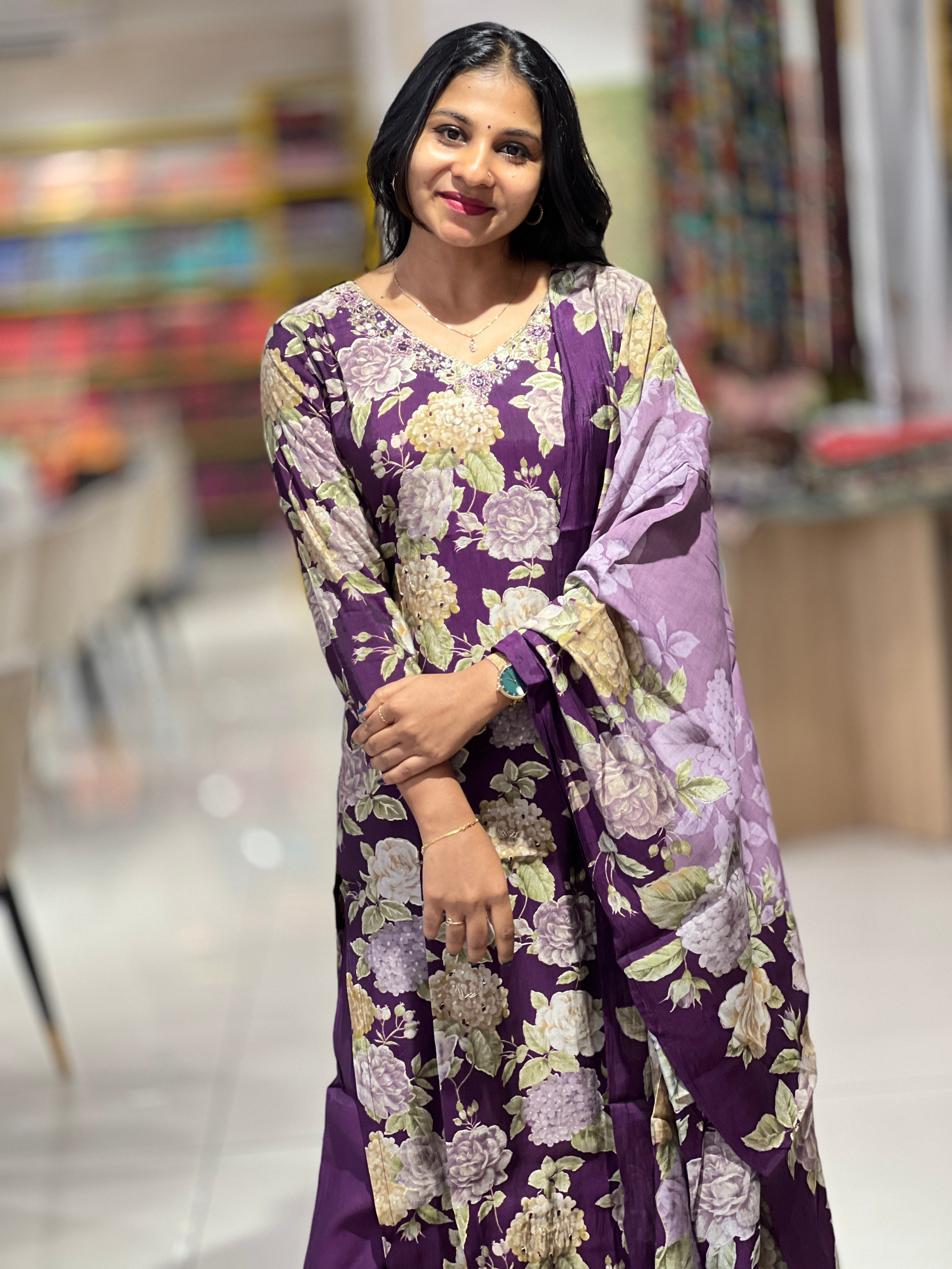 - Style: Digital Printed Floral Pattern With Foil Paint Highlight, Hand Embroidery Detailing, Side Slit Pattern