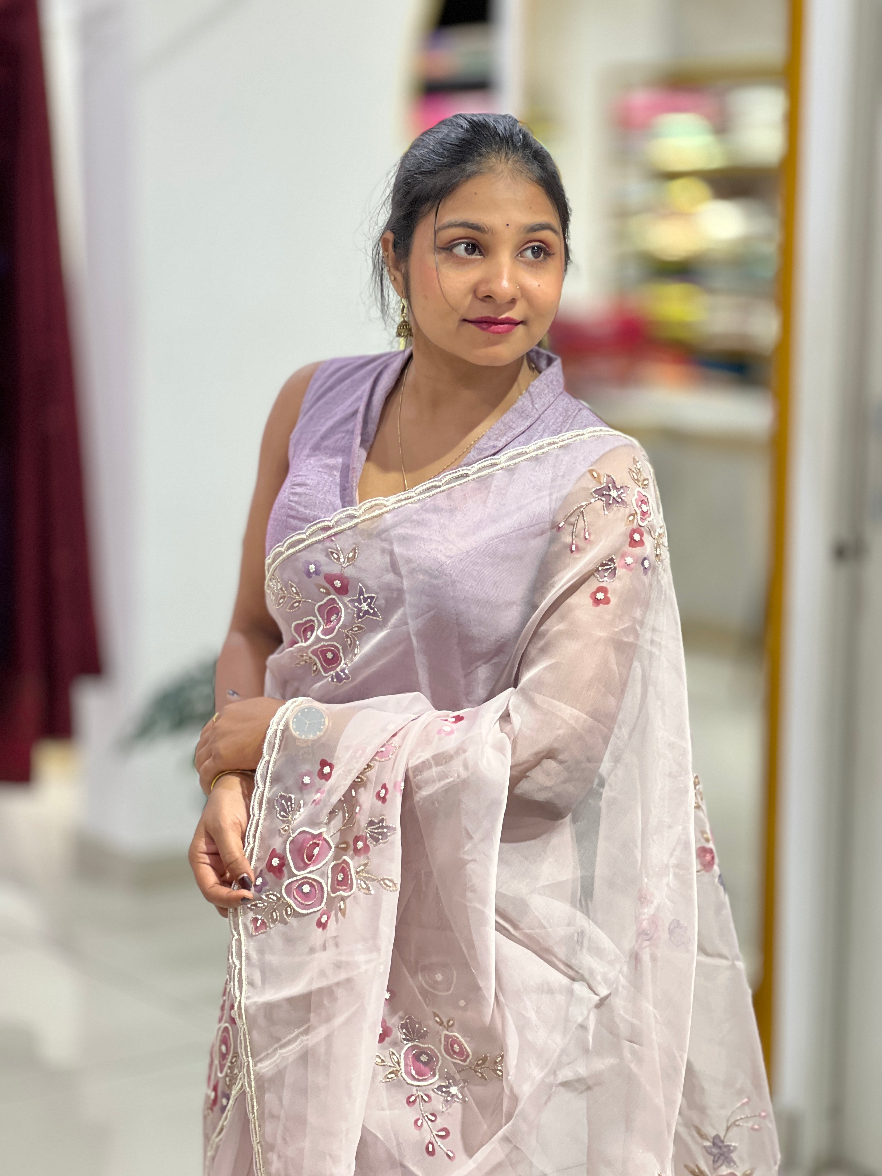 Floral Print With Hand Embroidery Detailed Organza Saree | BLD1826