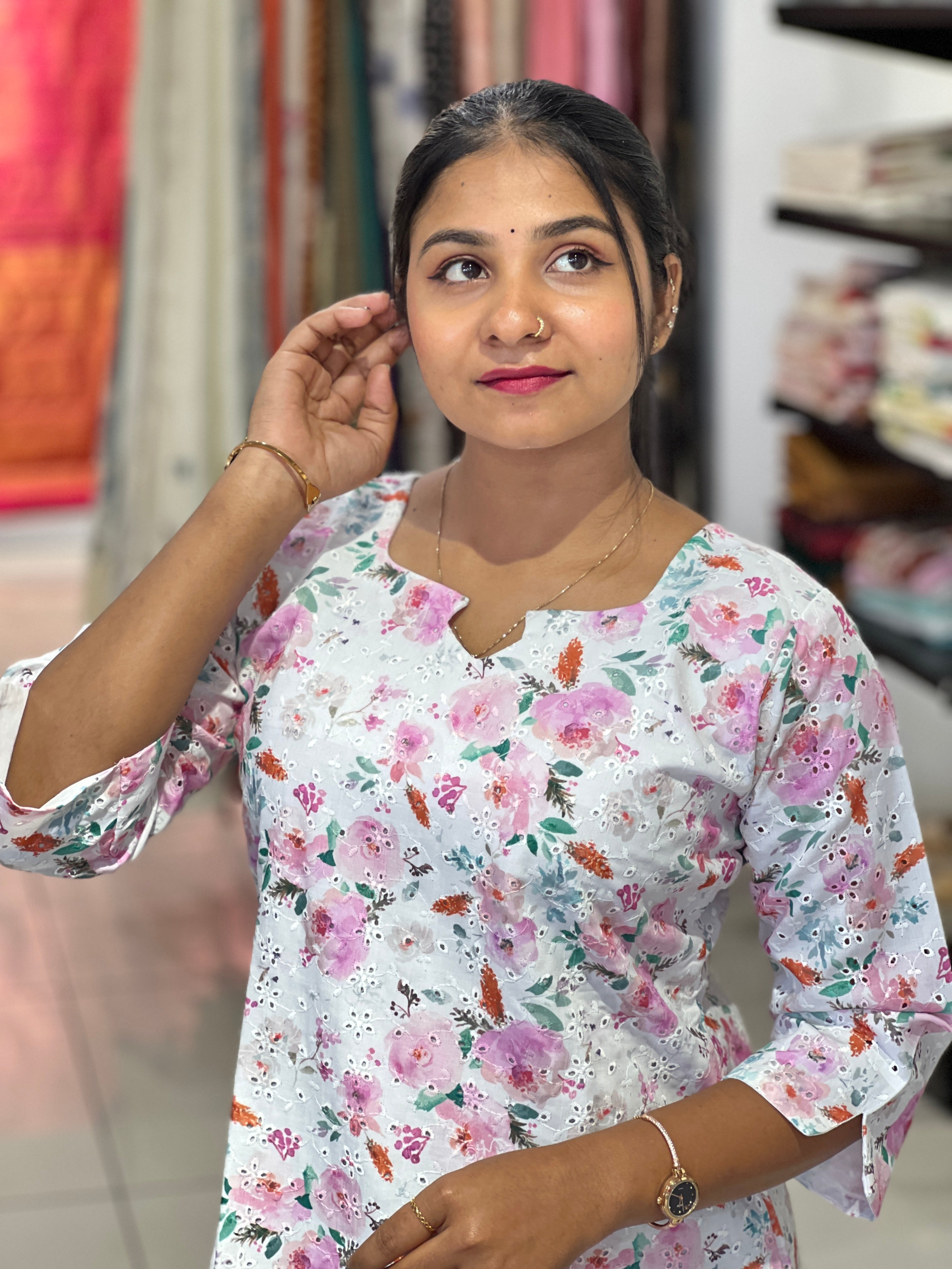 - Style: Floral Print With Schiffli Detailing, With Lining, Side Slit Pattern