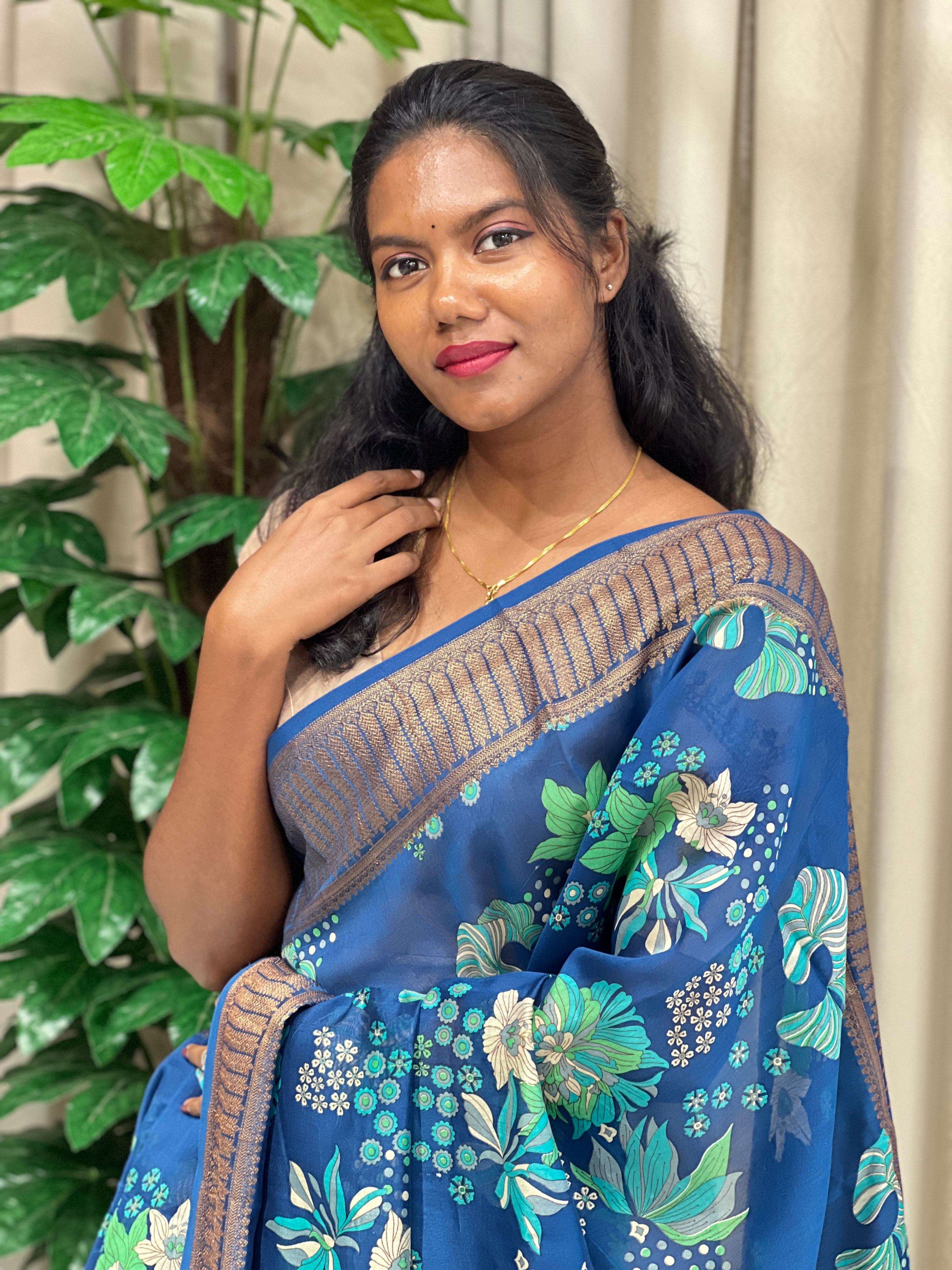- Style: Floral Printed, Contrast Pallu, Contrast Banarasi Border Detailing
