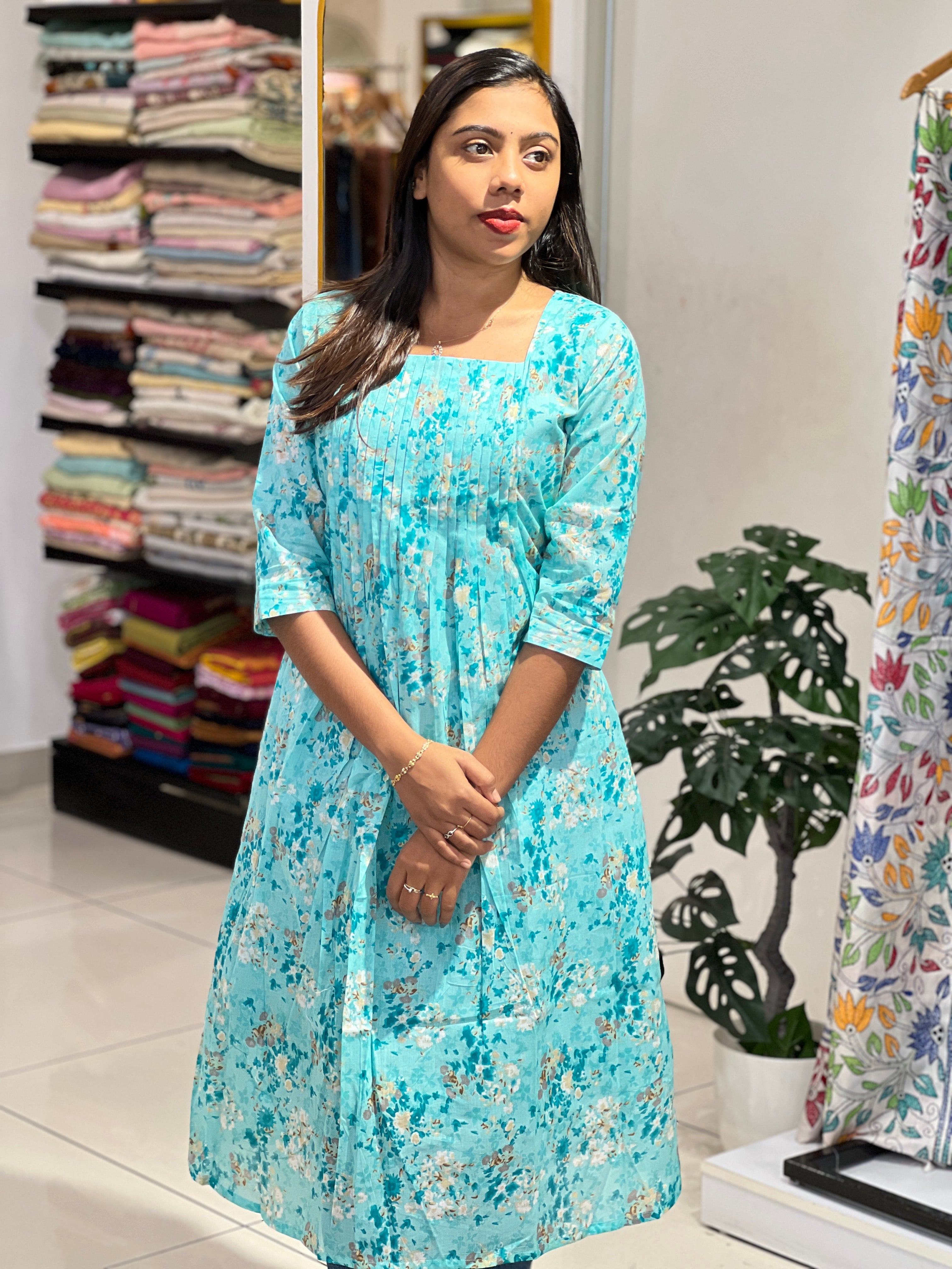 - Style: Floral Printed Pattern, Pintuck Detailing, A-Line Pattern