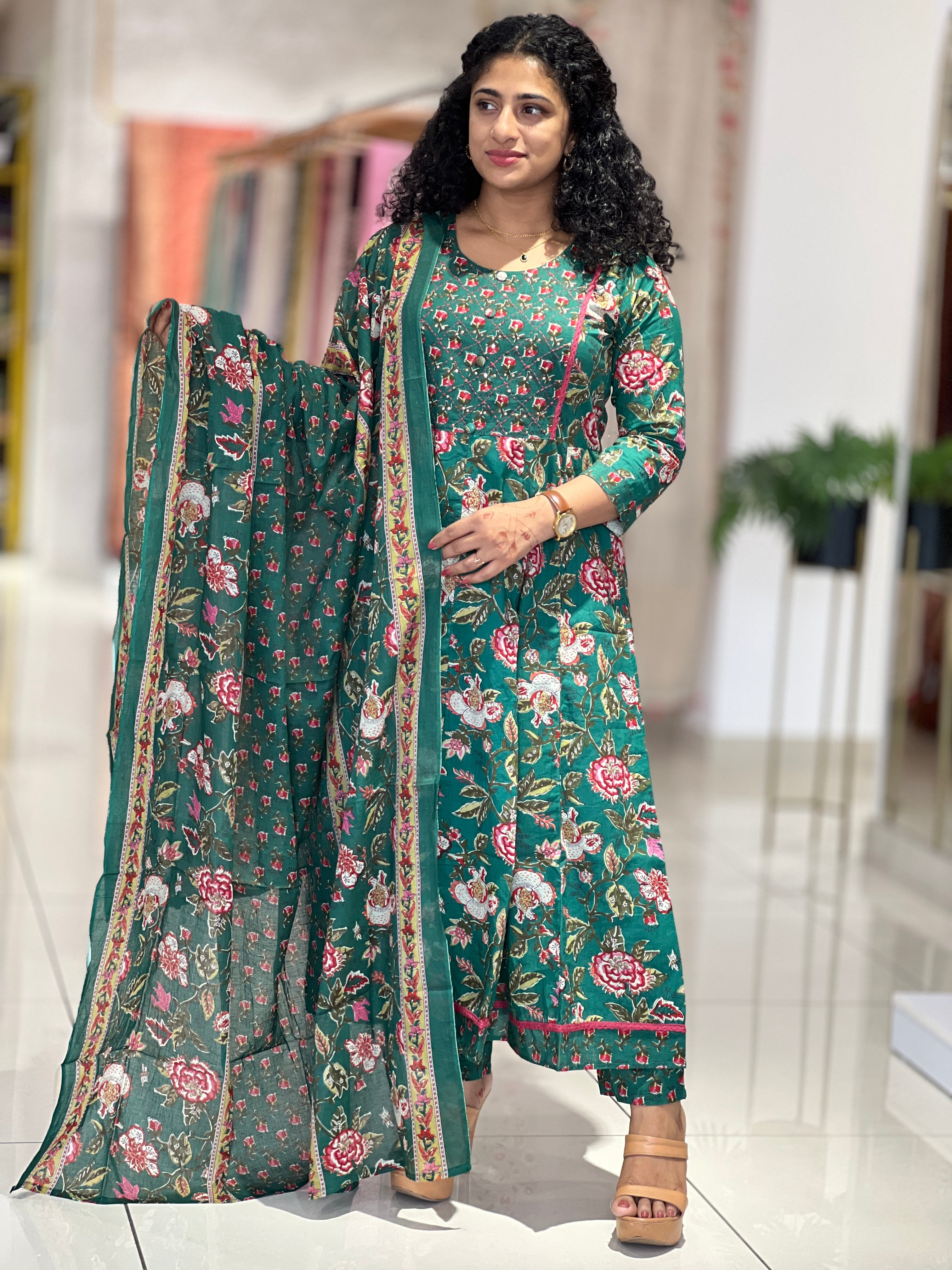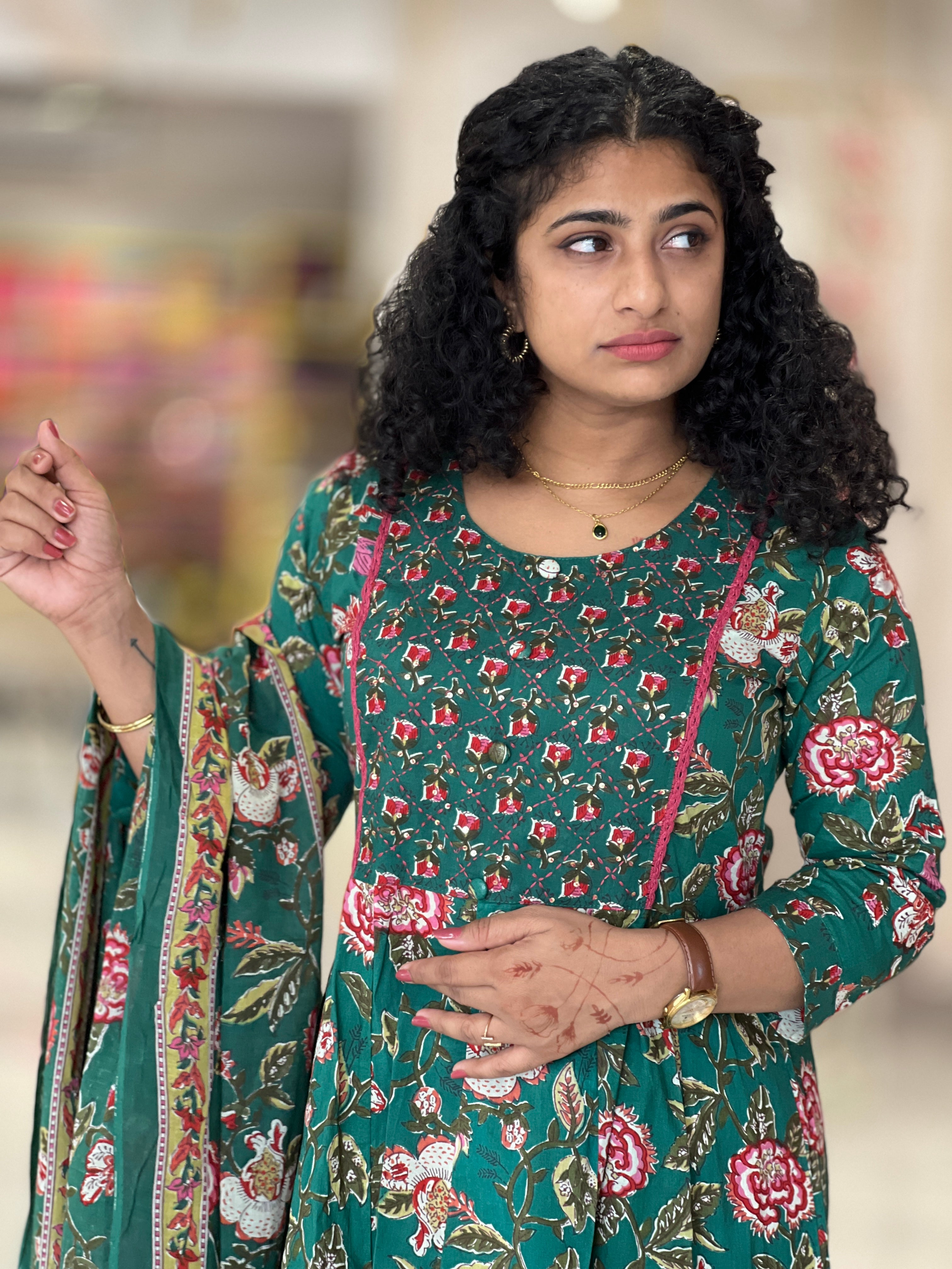 - Style: Screen Printed, Floral Pattern, Kantha & Sequence Embroidered Yoke, Lace Detailing, with Lining
