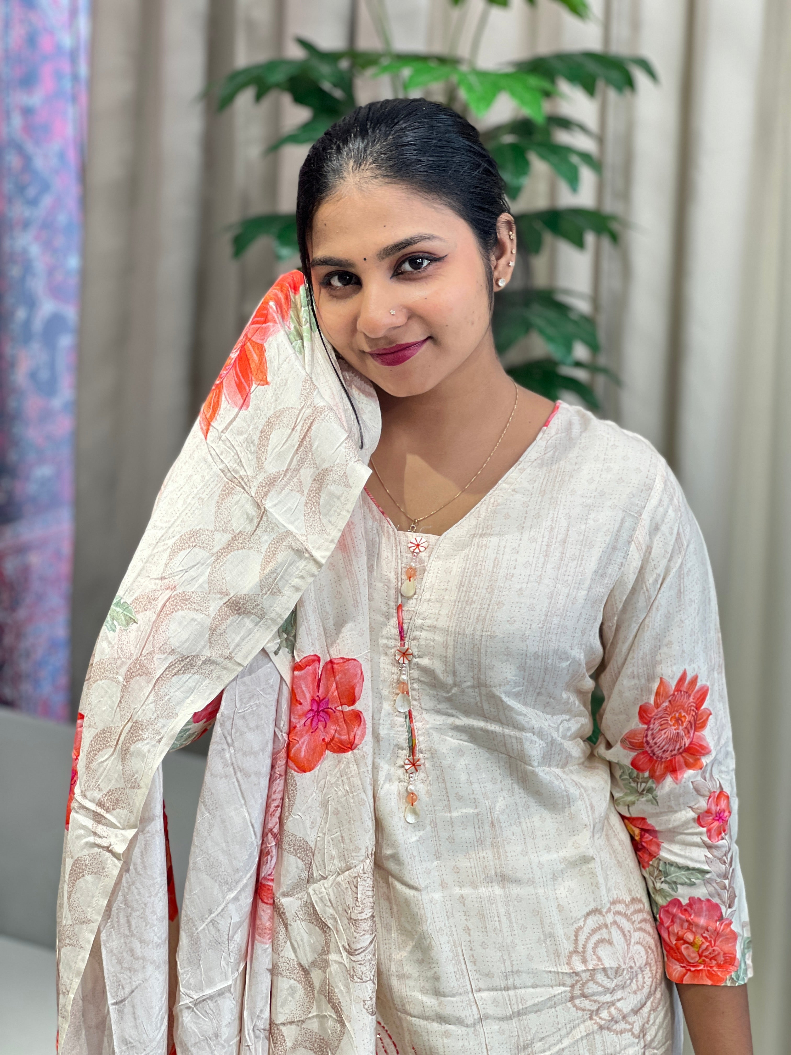 - Style: Floral Printed Highlighted With Hand Kantha, Patch and Stone Hanging Detailing On Yoke, Side Slit, With Cotton Lining