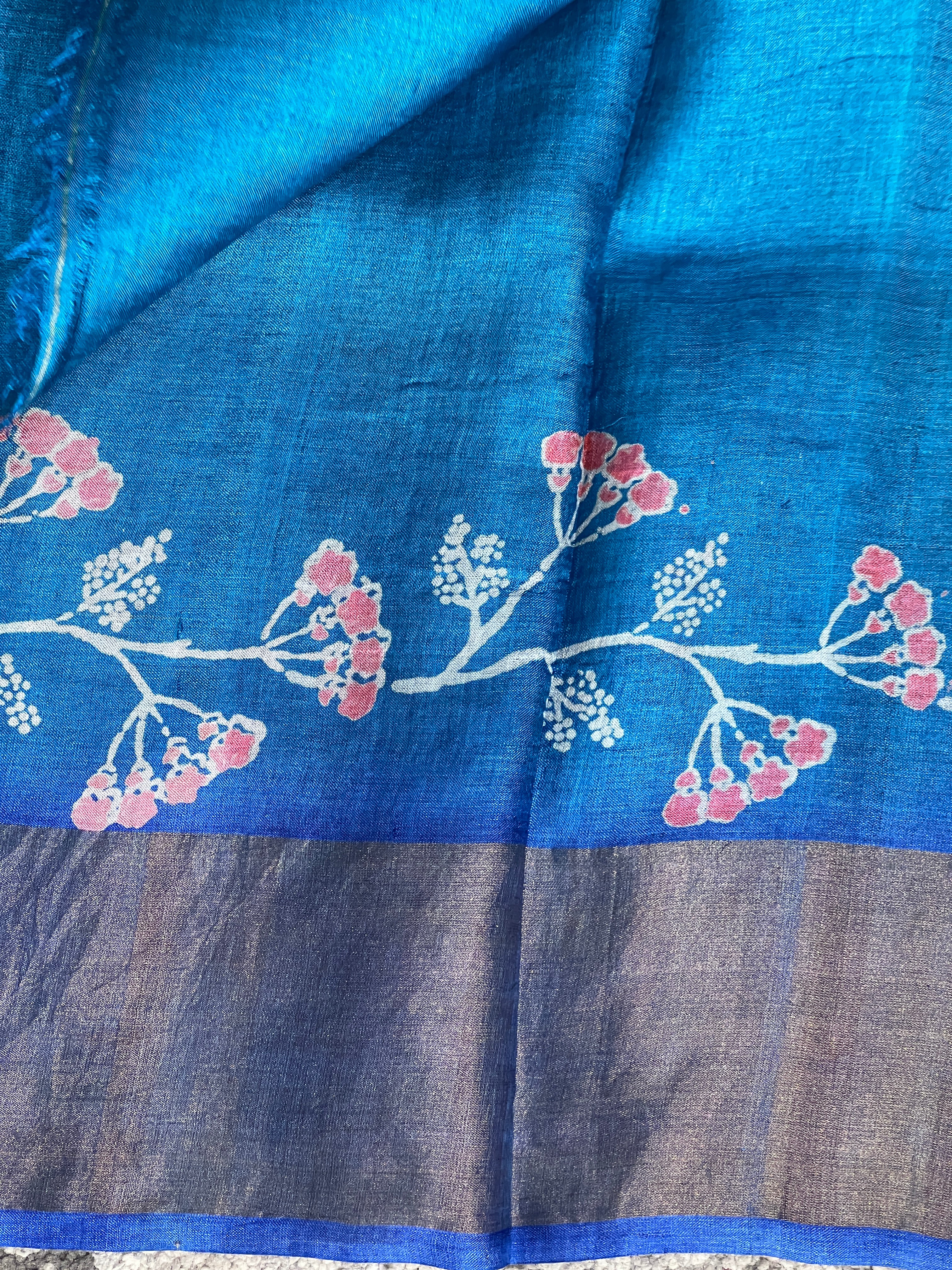 - Style: Hand Block Discharge Print With Silk Paint Detailing, Floral Pattern, Zari Borders